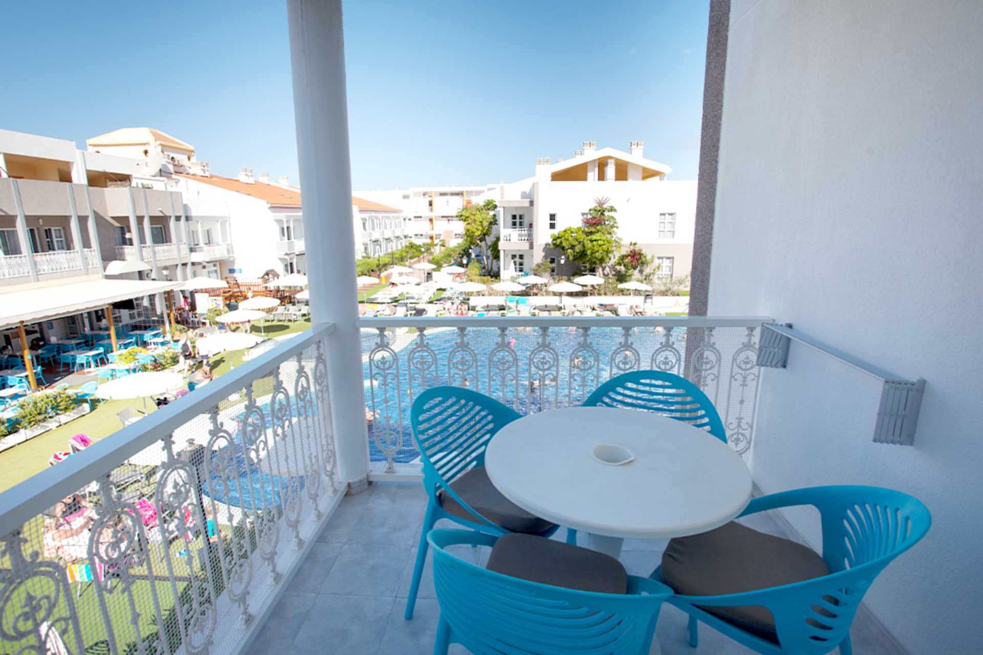 Kahden huoneen huoneisto, jossa on parveke tai terassi, joista osasta on näkymät uima-altaalle tai golfkentälle. Makuuhuone sekä yhdistetty olohuone ja minikeittiö. Olohuoneessa on portaat, jotka eivät johda mihinkään. Vastaanotosta on lainattava portti/aita, joka estää lapsia kiipeämästä portaita pitkin. Kaksi yhden hengen sänkyä. Lisävuodemahdollisuus vuodesohvaan. Minikeittiö, jossa jääkaappi, keittolevyt, uuni, vedenkeitin, kahvinkeitin sekä yksinkertaiset keittiövälineet. Wifi ja tallelokero lisämaksusta. Kattotuuletin. Tv kansainvälisillä kanavilla. Hiustenkuivain. Kylpyhuoneessa amme ja wc. Siivous 5 krt/viikko.