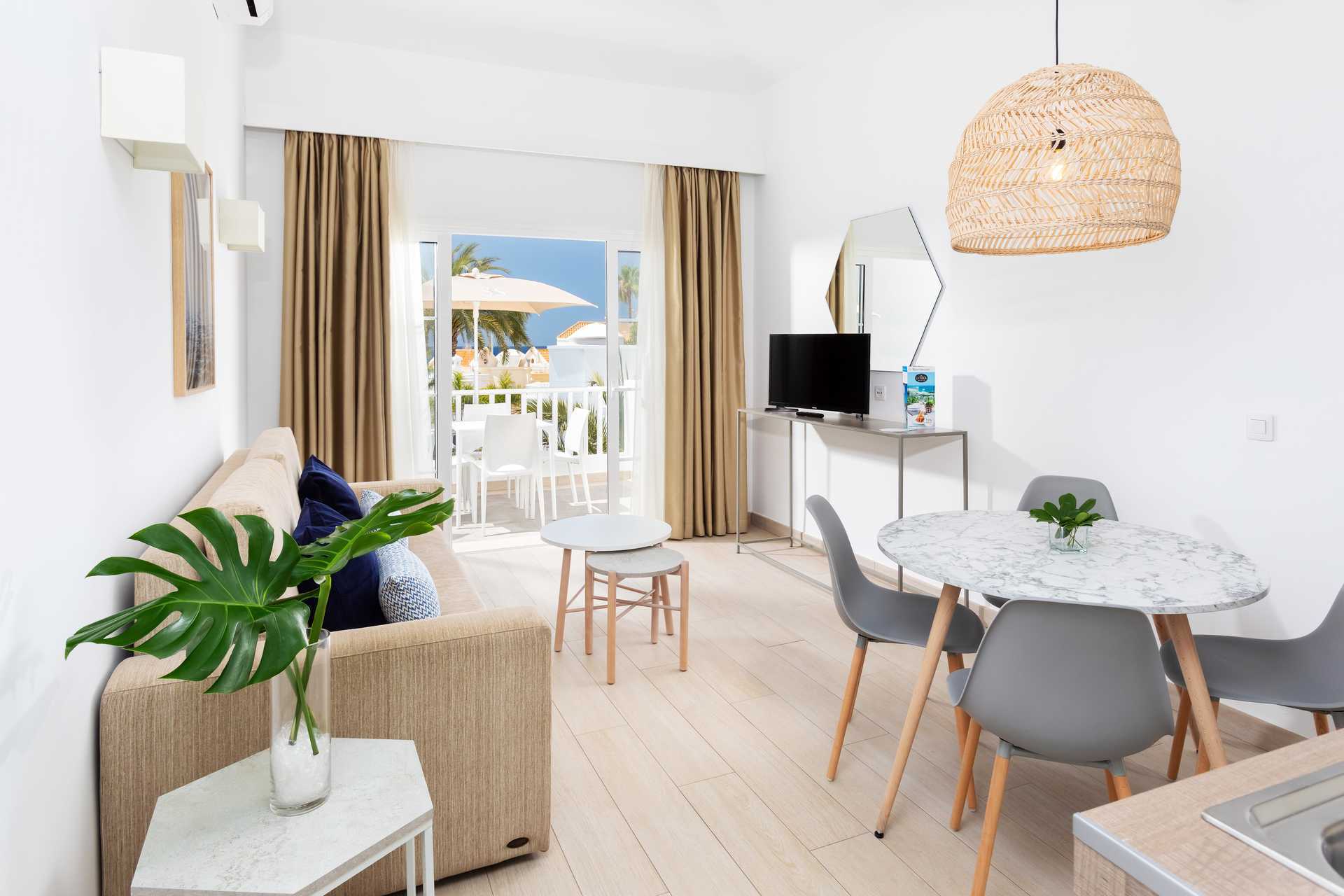 Deluxe-kaksio parvekkeella ja rajoitettu merinäköala ylemmissä kerroksissa. Huoneistot sijaitsevat hotellin ylimmässä kerroksessa ja koostuvat makuuhuoneesta ja olohuoneesta, jossa on minikeittiö. Kaksi yhden hengen sänkyä. Lisävuodemahdollisuus vuodesohvasta. Minikeittiössä keittolevyt, jääkaappi, mikro, leivänpaahdin, vedenkeitin, kahvinkeitin ja yksinkertainen keittiövarustus. Kahvinkeitin - kapselit mukana. Maksuton wifi ja ilmastointi. Kattotuuletin olohuoneessa. Tv kansainvälisillä kanavilla. Silitysrauta ja -lauta. Hiustenkuivain. Suihku ja wc. Siivous 7 krt/viikko.