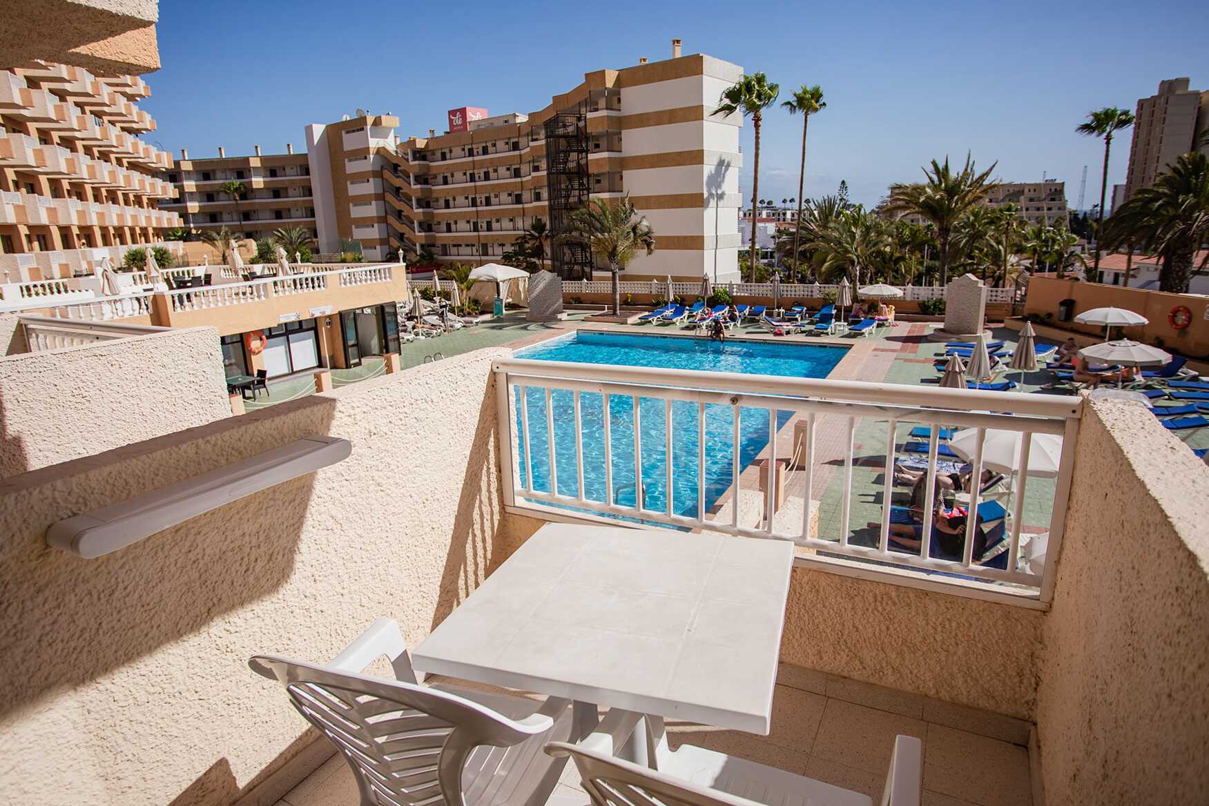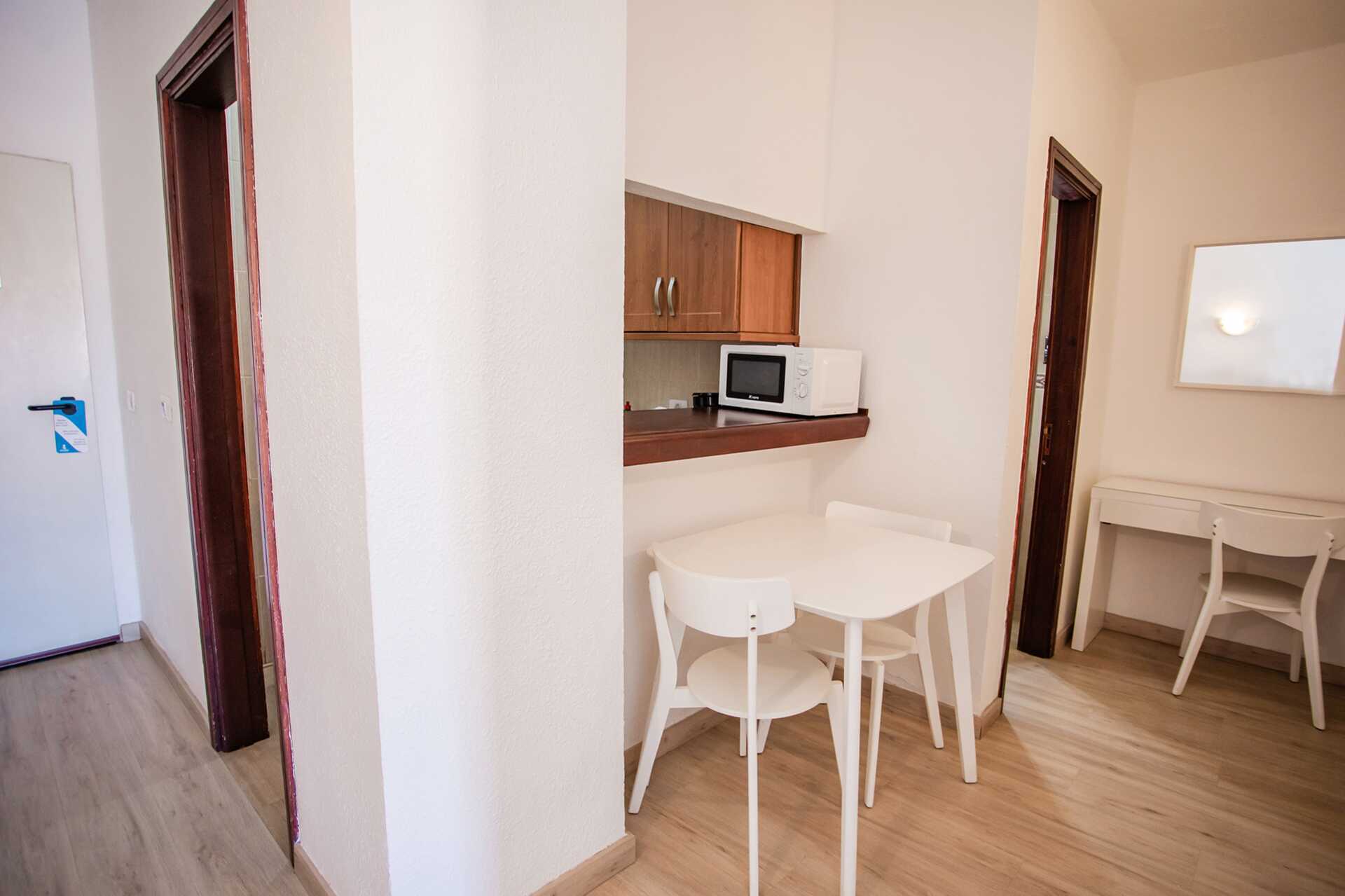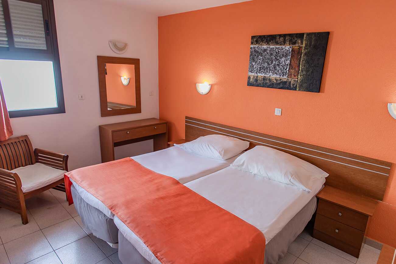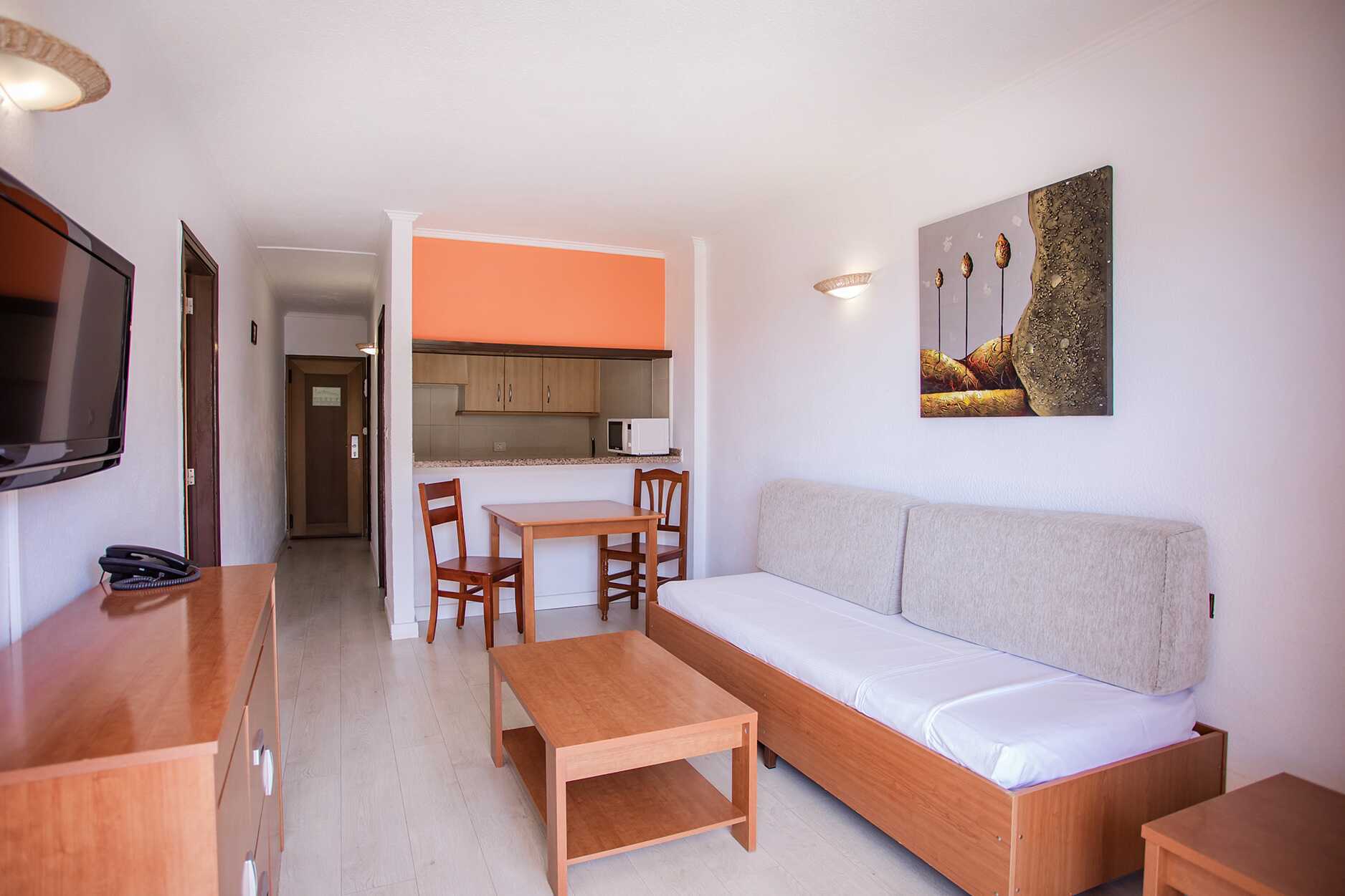 Yksiö maaterassilla ja näköalalla uima-altaalle. Yhdistetty makuuhuone ja olohuone, jossa on minikeittiö. Kaksi yhden hengen sänkyä. Lisävuodemahdollisuus vuodesohvasta. Minikeittiö, jossa keittolevyt, jääkaappi, mikroaaltouuni, vedenkeitin ja peruskeittiölaitteet. Maksuton wifi. Tallelokero lisämaksusta. Tv kansainvälisillä kanavilla. Kylpyhuoneessa suihku ja wc. Siivous 5 krt/viikko.