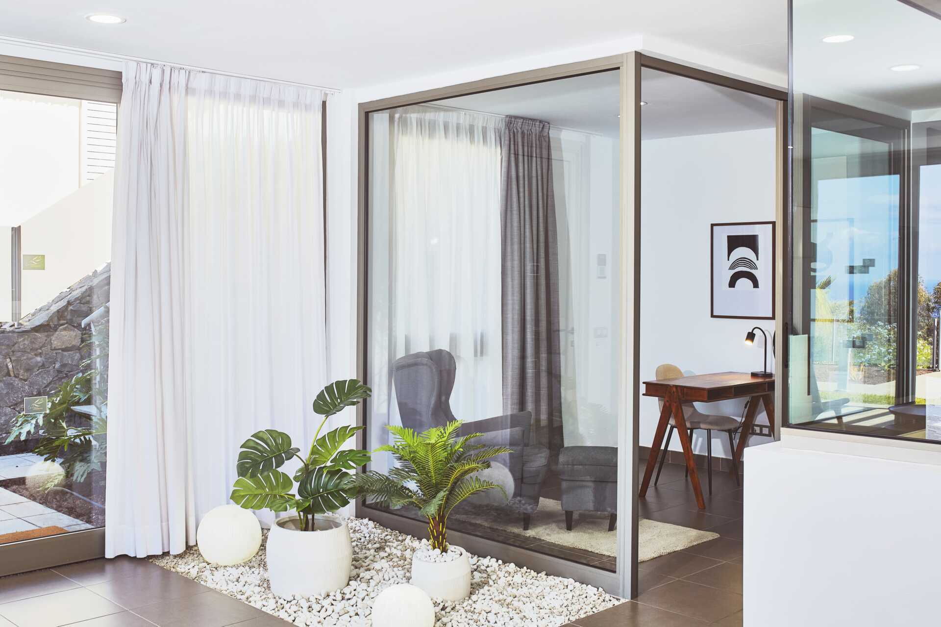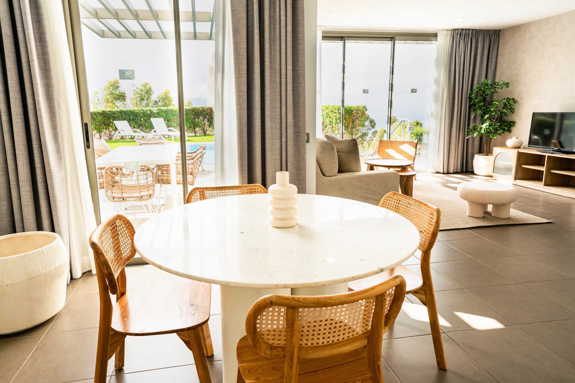 Neljän makuuhuoneen huvila, jossa on suuri puutarha, jossa on oma uima-allas aurinkotuolit ja -varjot. Huvila koostuu kahdesta kerroksesta. Sisääntulokerroksessa on olohuone ruokailutilalla, lasitettu alue, jossa on pöytä ja tuoli etätyöskentelyä varten, keittiö ja kylpyhuone. Yläkerrassa on kolme parvekkeellista makuuhuonetta ja kaksi kylpyhuonetta. Kaksi yhden hengen sänkyä molemmissa makuuhuoneissa. Erillinen keittiö, jossa keittolevyt, uuni, mikro, vedenkeitin, kahvinkeitin, leivänpaahdin, astianpesukone ja yksinkertainen keittiövarustus. Wifi sisältyy huvilaan ja puutarhaan. Tallelokero. Tv kansainvälisillä kanavilla. Pesukone. Hiustenkuivain. Kylpyhuone ammeella ja suihkulla ja wc ja kylpyhuone suihkulla ja wc yläkerrassa. Sisääntulokerroksen kylpyhuoneessa on suihku ja wc. Siivous ei sisälly hintaan - siivousvälineet ovat saatavilla huvilassa tai tilattavissa lisämaksulla.