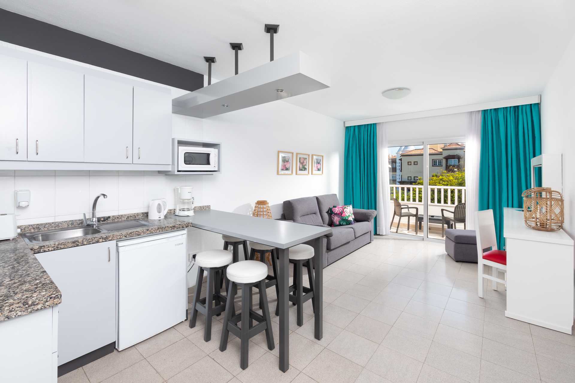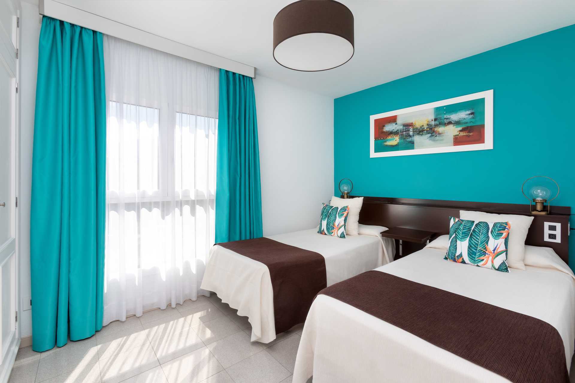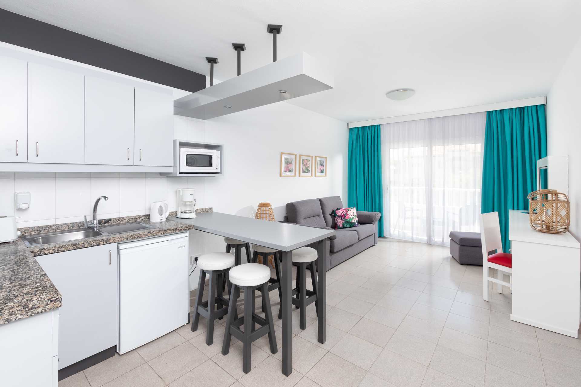Kolmioita, joissa on parveke. Kaksi makuuhuonetta ja yhdistetty olohuone/minikeittiö. Parivuode ja yhden hengen vuode tai kolme yhden hengen vuodetta. Lisävuodemahdollisuus neljännelle henkilölle vuodeasohvaan. Keittolevyt, mikro, leivänpaahdin, jääkaappi, kahvinkeitin ja yksinkertainen keittiövarustelu. Maksuton wifi. Tallelokero lisämaksusta. Tv kansainvälisillä kanavilla. Kylpyhuone, jossa kylpyamme/suihku ja wc. Siivous 5 krt/viikko.
