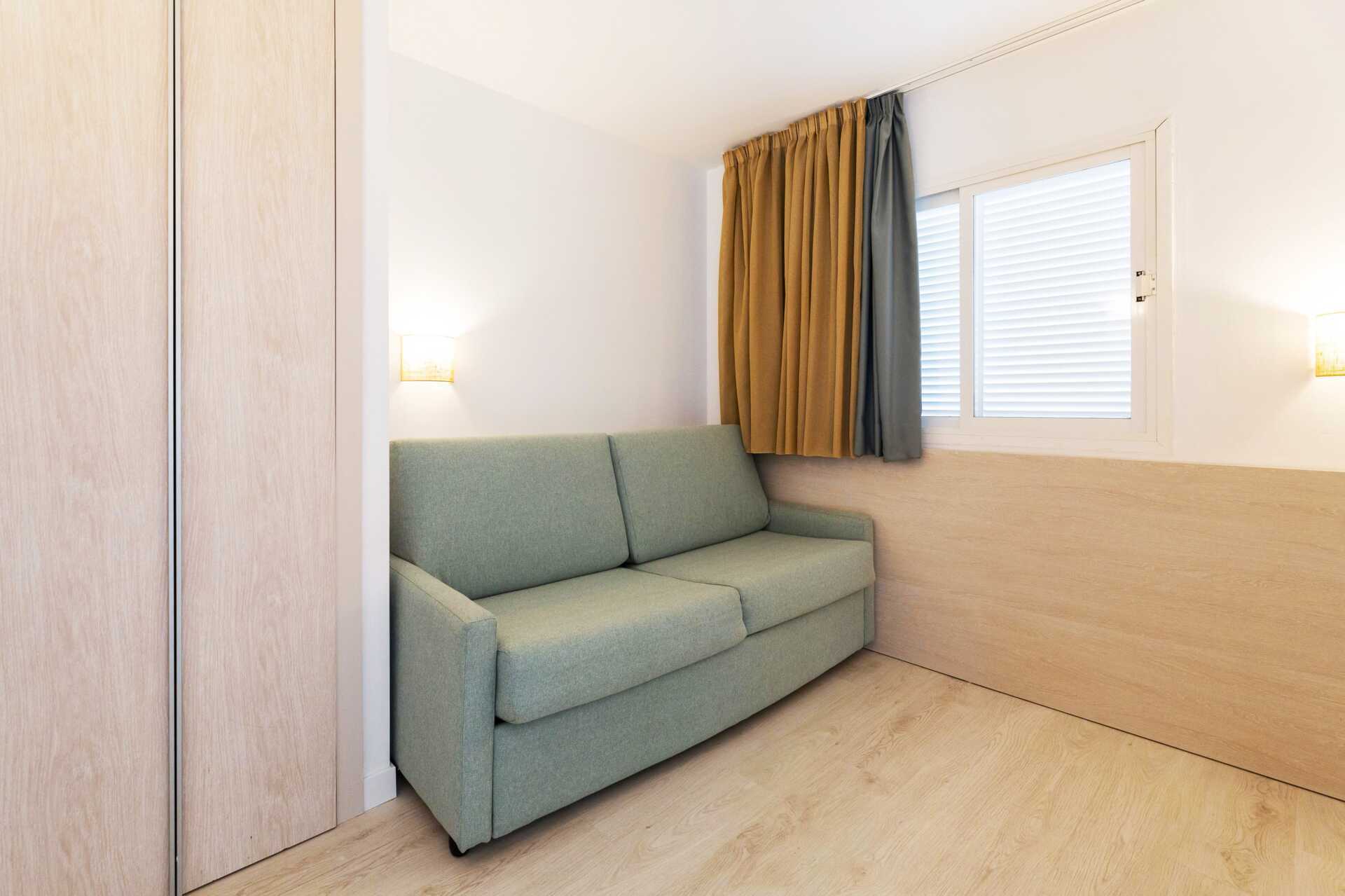 Kaksio parvekkeella tai terassilla. Erillinen makuuhuone, jossa on parisänky. Yhdistetty makuuhuone, olohuone ja minikeittiö. Lisävuodemahdollisuus kahteen vuodesohvaan. Mminikeittiö, jossa keittolevyt, mikroaaltouuni, jääkaappi ja peruskeittiövälineet. Maksuton wifi, ilmastointi ja tallelokero. Tv paikallisilla kanavilla. Hiustenkuivain. Kylpyhuoneessa suihku ja wc. Siivous 5 krt/viikko.