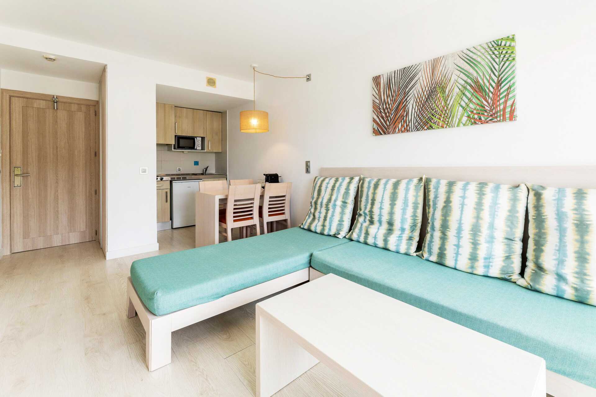 Kaksio, jossa parveke tai terassi tai vaihtoehtoisesti maaterassi ja pieni puutarha aurinkotuoleineen. Maaterassilliset asunnot sijaitsevat sivurakennuksessa. Huoneiden sisustukset ja värit vaihtelevat. Erillinen makuuhuone, jossa kaksi erillistä sänkyä. Yhdistetty makuuhuone, olohuone ja minikeittiö. Lisävuodemahdollisuus vuodesohvasta. Minikeittiö, jossa keittolevyt, mikroaaltouuni, jääkaappi, kahvinkeitin ja peruskeittiövälineet. Maksuton wifi, ilmastointi ja tallelokero. Tv paikallisilla kanavilla. Hiustenkuivain. Kylpyhuoneessa suihku ja wc. Siivous 5 krt/viikko.