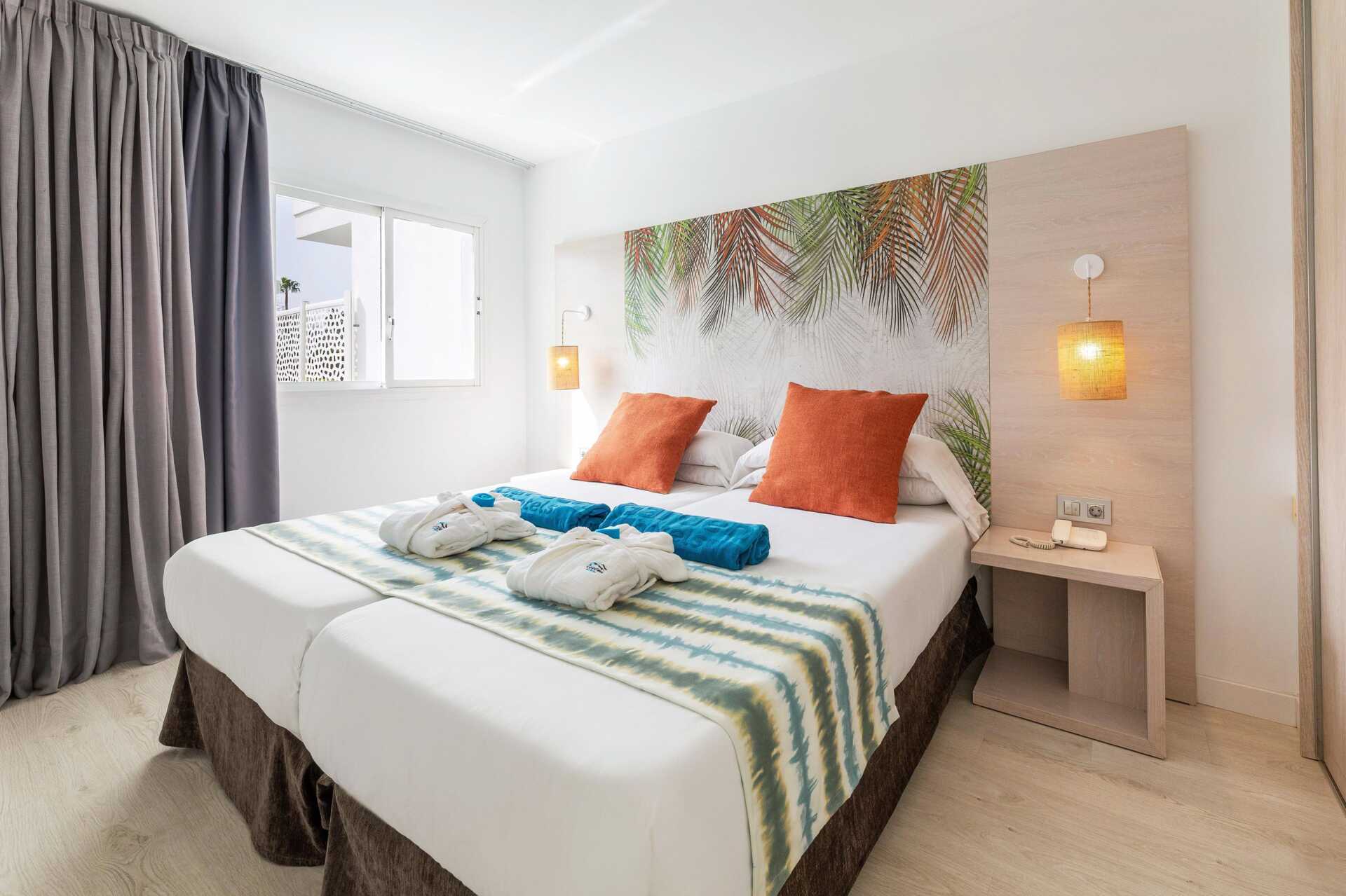 Kahden hengen huone parvekkeella tai terassilla. Kaksi yhden hengen sänkyä. Maksuton wifi, ilmastointi ja tallelokero. Minibaari. Tv paikallisilla kanavilla. Hiustenkuivain. Kylpyhuoneessa suihku ja wc. Siivous 5 krt/viikko.
