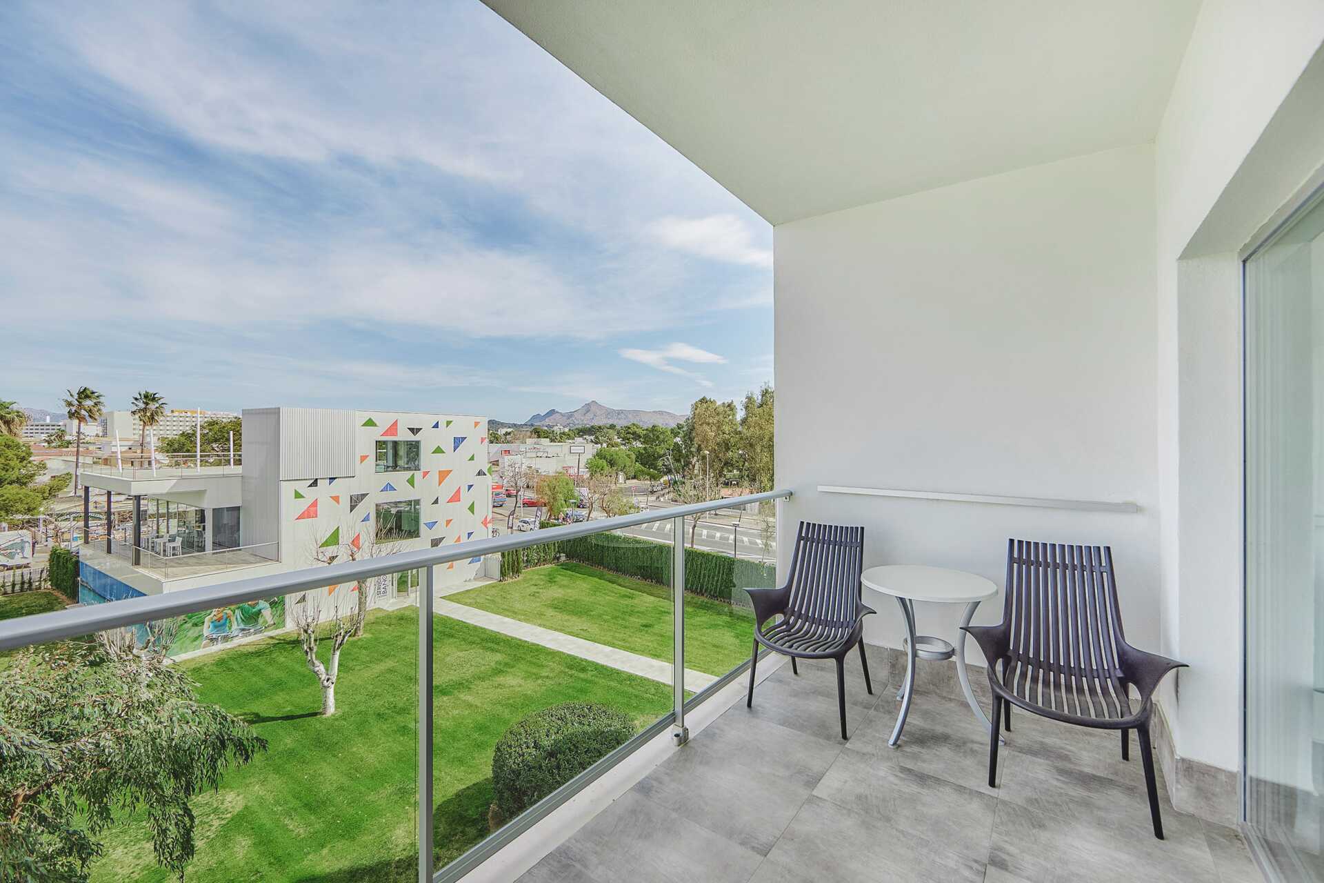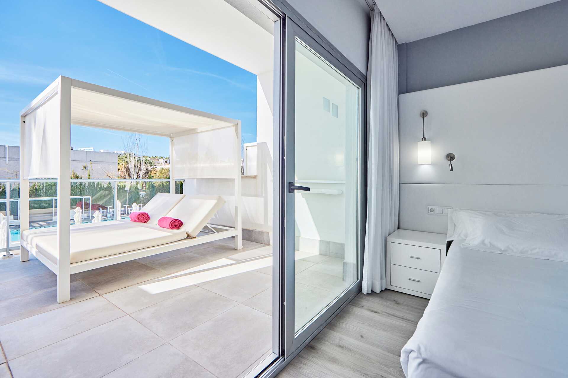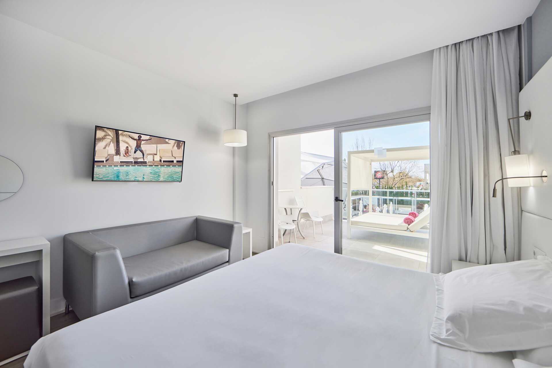 Deluxe-huone parvekkeella ja allasnäkymällä tai suuri parveke tai terassi allasnäkymällä. Parvekkeelliset huoneet sijaitsevat kerroksissa 5-6. Huoneet, joissa on suuri parveke tai terassi, sijaitsevat ensimmäisessä kerroksessa, ja ulkotilassa on pöytä, tuolit sekä suuri balivuode. Parivuode. Maksuton wifi, ilmastointi ja tallelokero. Jääkaappi. Vedenkeitin. Nespresso-keitin – kapselit maksutta saapuessa. Tv kansainvälisillä kanavilla. Kylpytakit ja tossut. Hiustenkuivain. Kylpyhuoneessa suihku ja wc. Siivous 7 krt/viikko.
