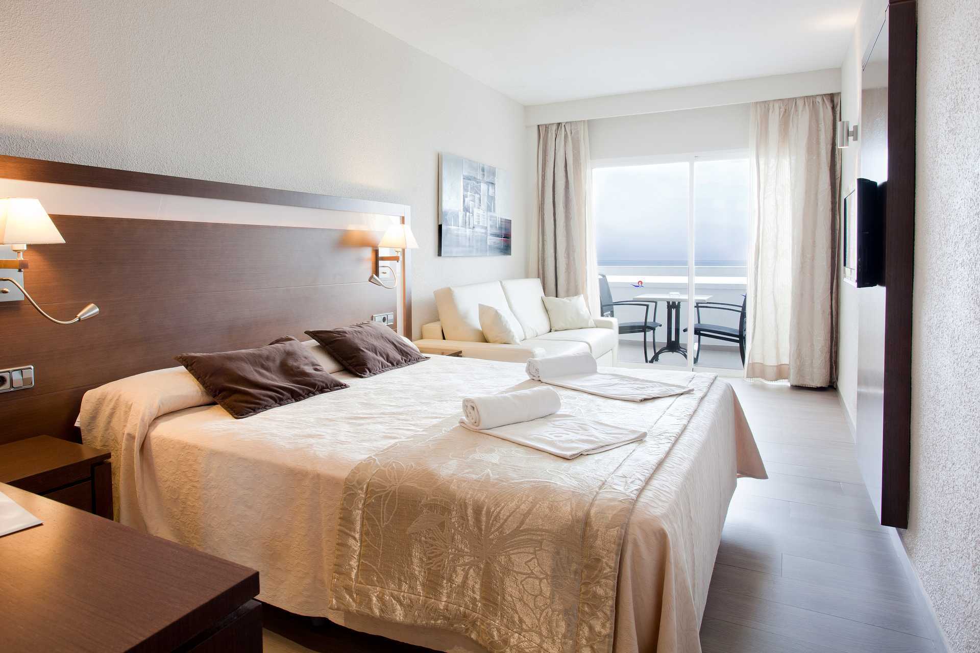 Juniorsviittejä parvekkeella tai terassilla,osassa rajoitettu merinäköala. Juniorsviitit sijaitsevat rakennuksen yläosassa 5. kerroksessa. Parivuode. Lisävuodemahdollisuus vuodesohvasta. Maksuton wifi ja ilmastointi. Tallelokero lisämaksusta. Minibaari - täynnä juomia saavuttaessa, täyttö maksua vastaan. Tv kansainvälisillä kanavilla. Hiustenkuivain. Kylpyhuoneessa suihku ja wc. Siivous 7 krt/viikko. Alle 2-vuotiaat lapset lasketaan lisävuoteella majoittuviksi henkilöiksi.