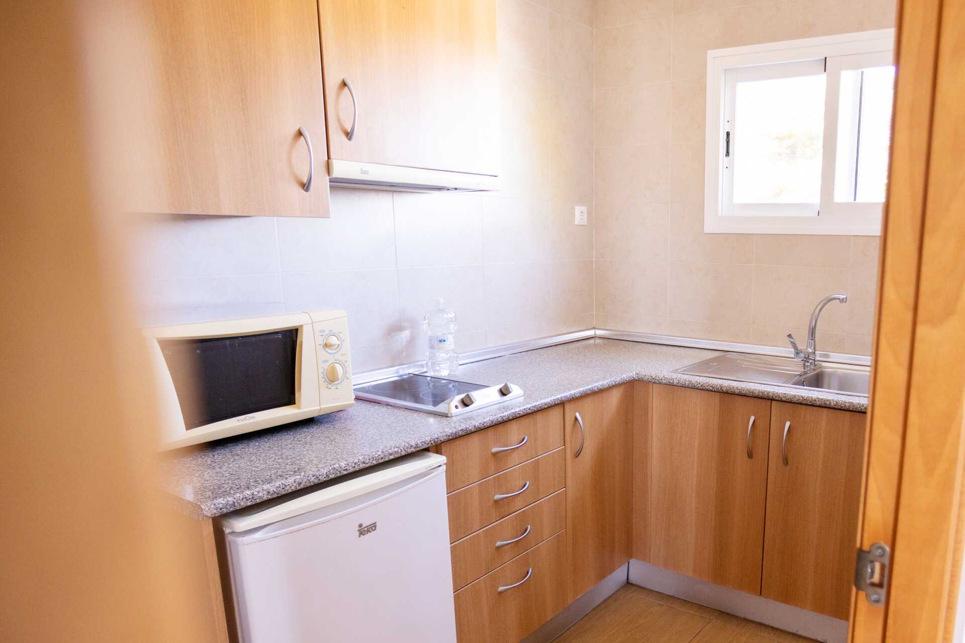 Kaksio, josta on pääsy yhteiselle uima-altaalle. Ulkotilassa on pöytä ja tuoleja sekä aurinkotuoleja. Makuuhuone sekä yhdistetty olohuone ja minikeittiö. Kaksi erillistä yhden hengen sänkyä. Lisävuodemahdollisuus kahdesta vuodesohvasta. Minikeittiössä keittolevyt, jääkaappi, mikro ja yksinkertainen keittiövarustus. Maksuton wifi, ilmastointi ja tallelokero. Tv kansainvälisillä kanavilla. Silitysrauta. Hiustenkuivain. Kylpyhuoneessa suihku ja wc. Siivous 5 krt/viikko.