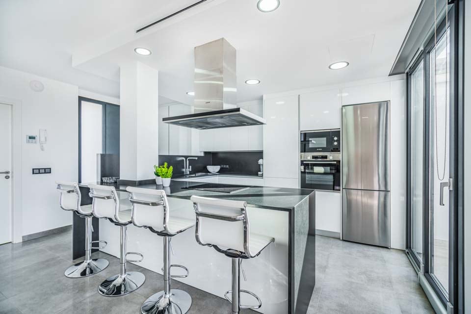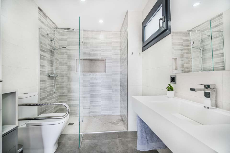 Vaikuttava, moderni ja toimiva – tässä kolme sanaa ilmentävät tätä huvilaa. Kahteen tasoon jaettu pohjakerros keskittyy avoimeen asumiseen. Tyylikäs keittiö ja olohuone ovat täysin valaistuja suurista liukuovista, jotka johtavat suoraan upealle terassille, jossa on tiiligrilli ja upea infinity-uima-allas. Tässä kerroksessa on myös kahden hengen makuuhuone, jossa on queen-size-vuode, ja perhekylpyhuone, jossa on suihkukaappi, joka sopii erinomaisesti liikuntarajoitteisille.