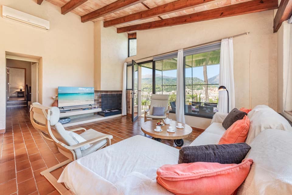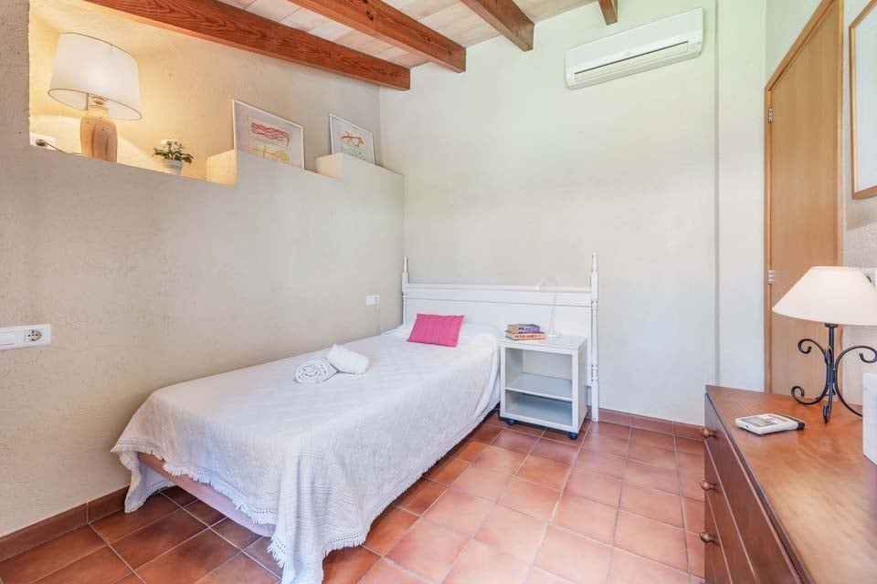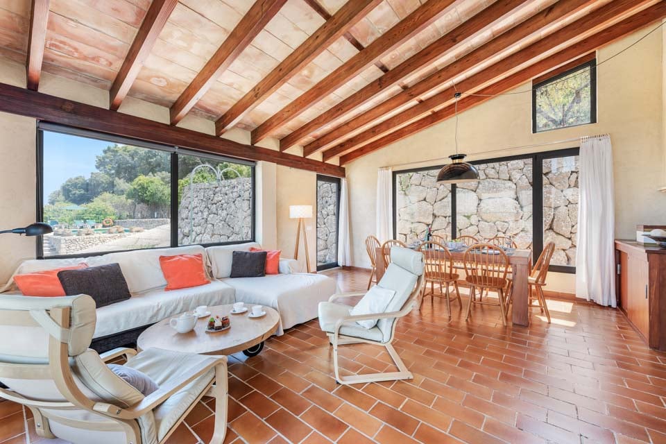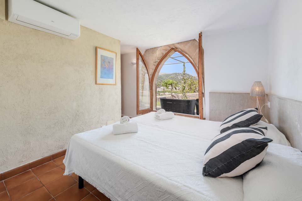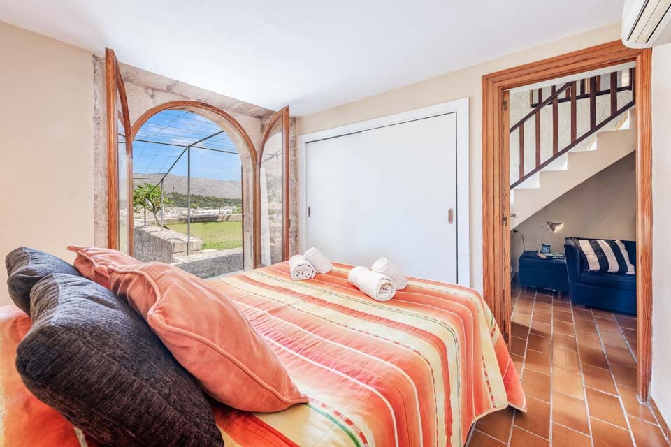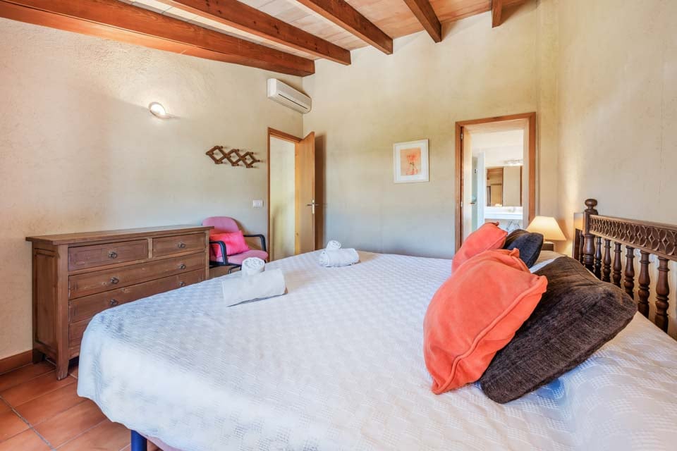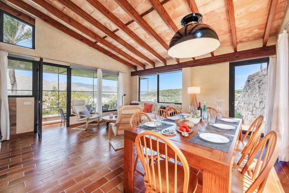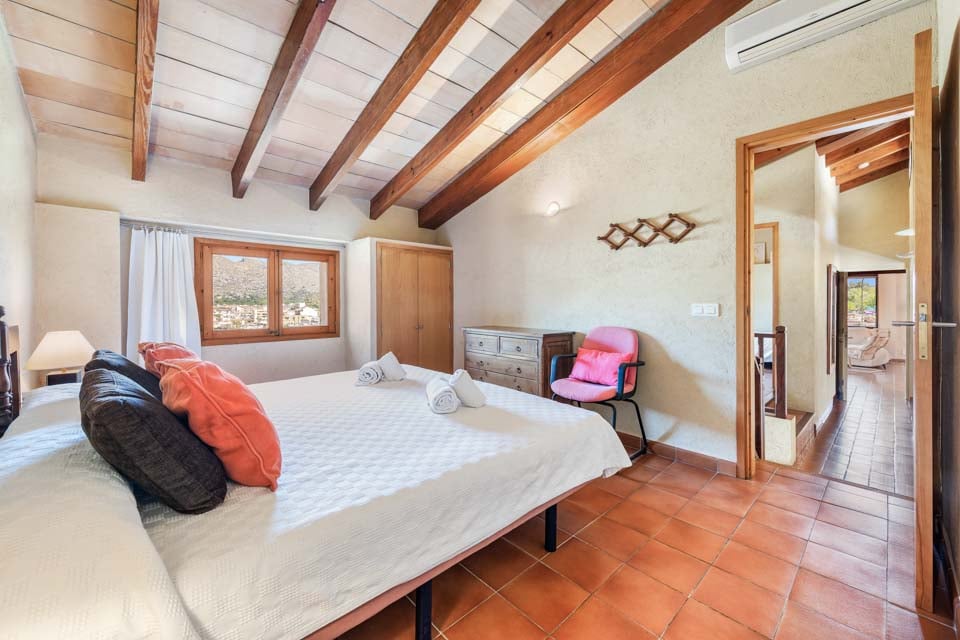 Sisältä huvila on sisustettu perinteiseen mutta hienostuneeseen tyyliin mukavuus mielessä pitäen. Jokaisessa makuuhuoneessa on ilmastointi ja oma kylpyhuone, ja olohuoneessa on suuret panoraamaikkunat, joten voit viilentyä sisällä samalla kun ihailet kaunista maaseutumaisemaa. Jos haluat tutustua kauemmas ja nauttia paikallisista rannoista, suositut merenrantakohteet Puerto Pollensa ja Puerto Alcudia ovat molemmat helpon ajomatkan päässä.