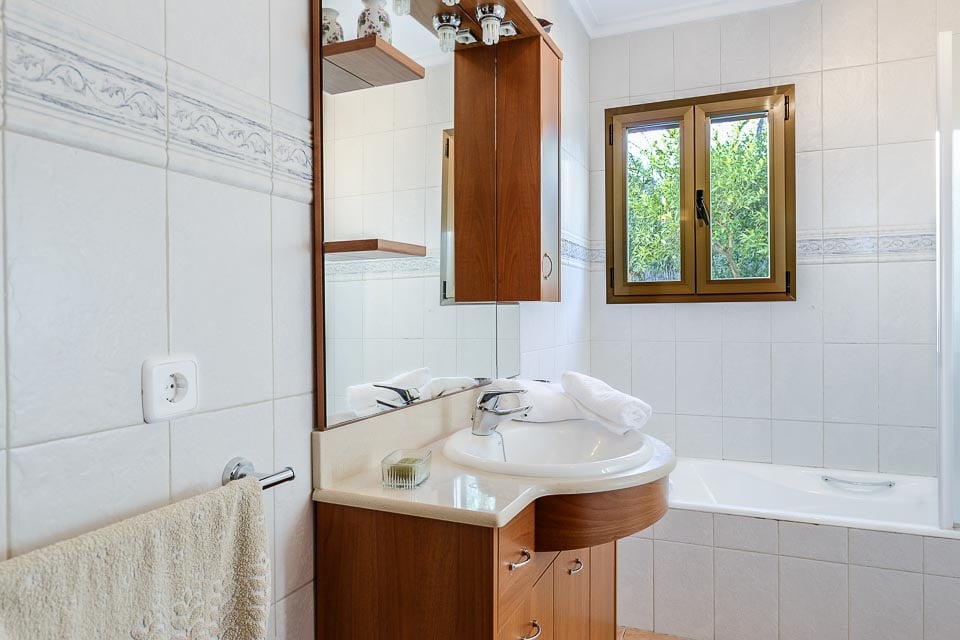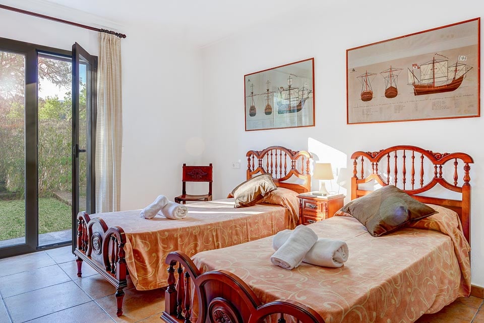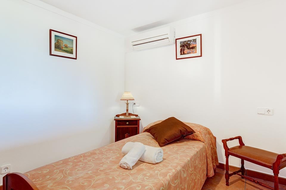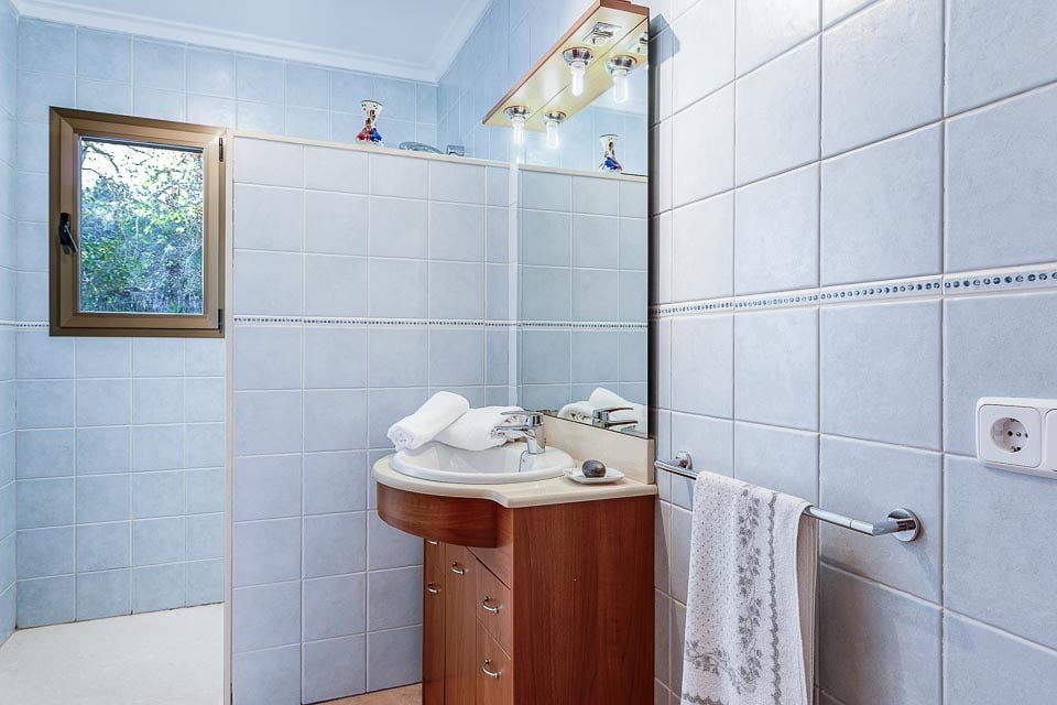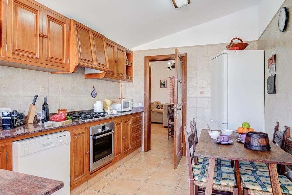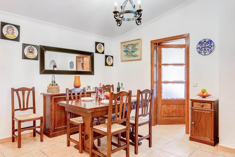 Sisältä huvila on sisustettu mukavasti ja siinä on säilytetty perinteinen mallorcalainen tyyli, joka on tehnyt tästä maasta suositun valinnan asiakkaidemme keskuudessa. Viihtyisässä oleskelutilassa on mukavat istuimet ja ilmastointi, ja oleskelu-/ruokailutilasta avautuvassa täysin varustetussa keittiössä on kaikki tarvittava juhla-aterian valmistamiseen. Alakerrassa on myös kolme makuuhuonetta: yksi kahden hengen huone omalla kylpyhuoneella, yksi kahden hengen huone kahdella vuoteella ja yksi yhden hengen huone. Kaikissa makuuhuoneissa on ilmainen ilmastointi.