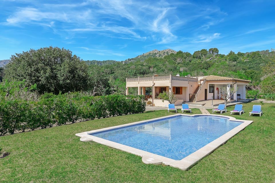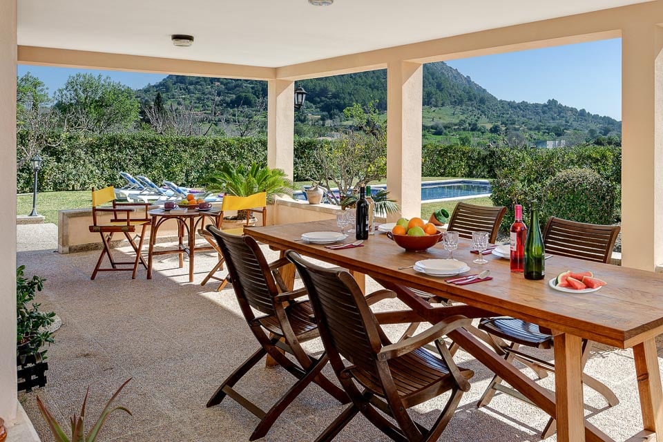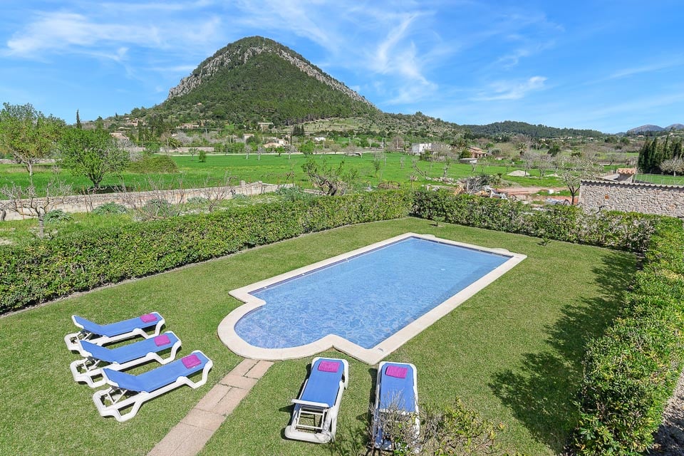 Tämä kiinteistö sijaitsee kauniilla maaseudulla peltojen ympäröimänä ja sieltä on upeat näkymät Tramuntanan ja Puig de Marian vuorille. Ulkoisesti tämä kaunis huvila sijaitsee suurella tontilla, jolla on vaikuttava 9,5 m x 5 m uima-allas, jota ympäröivät nurmikot ja ikivihreät pensaat. Suurella katetulla terassilla voit nauttia ulkoilmaruokailusta, joka on loistava paikka istua ja nauttia näkymistä keskipäivän auringossa.