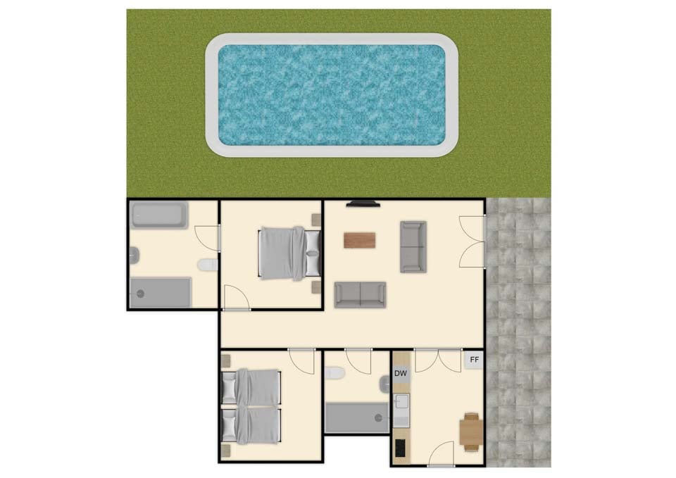 Voita keskipäivän kuumuus virkistävällä pulahduksella yksityiseen uima-altaaseesi, jonka piilotettu ominaisuus varmasti ilahduttaa kaikkia läheisiäsi. Vaikka ensi silmäyksellä tämä pitkä allas vaikuttaa tapahtumaköyhältä, pulahda matalaan päähän ja istu alas veden alla oleville istuimille, niin huomaat vesisuihkut! Yhdistämällä uima-altaan ja porealtaan parhaat puolet, tämä vesipuisto on lomaviihteen keskus.