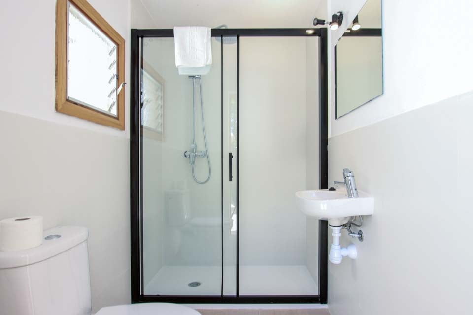 Sisällä viihtyisä olohuone, jossa on palkit kattoon ja puiset ikkunat, johtaa ruokailutilaan ja sitä kautta keittiöön. Täysin varustellussa keittiössä on kaikki tarvittavat kodinkoneet, kuten jääkaappipakastin, mikroaaltouuni ja astianpesukone. Makuuhuoneita on yhteensä kolme: yksi parivuode, yksi erillisillä vuoteilla ja yksi makuuhuone, jossa on yhden hengen vuode ja levitettävä sänky kuudennelle vieraalle. Sisällä on perheille tarkoitettu kylpyhuone, kun taas ulkopuolella olevaan suihkutilaan on käytettävä ulkoa.