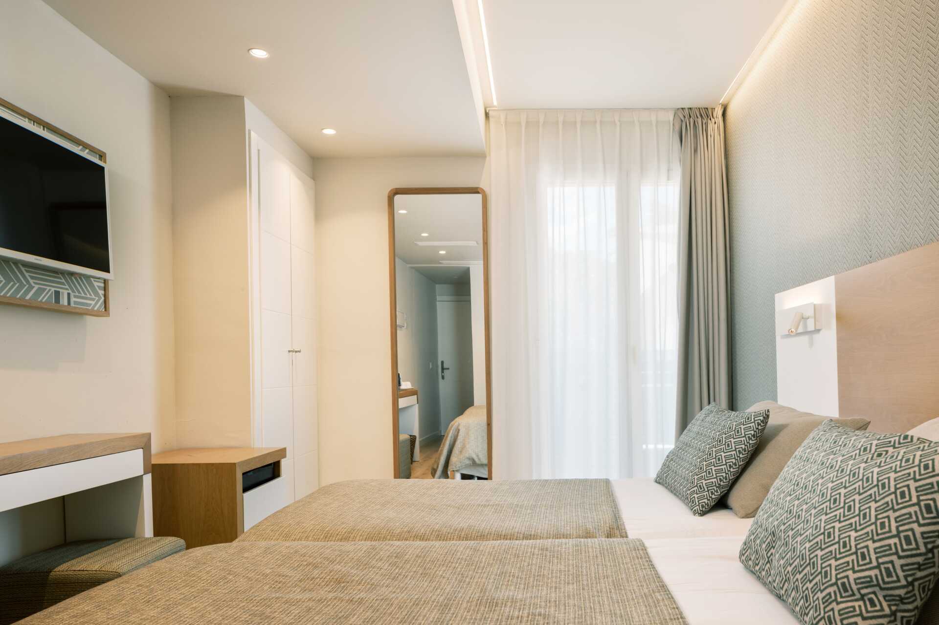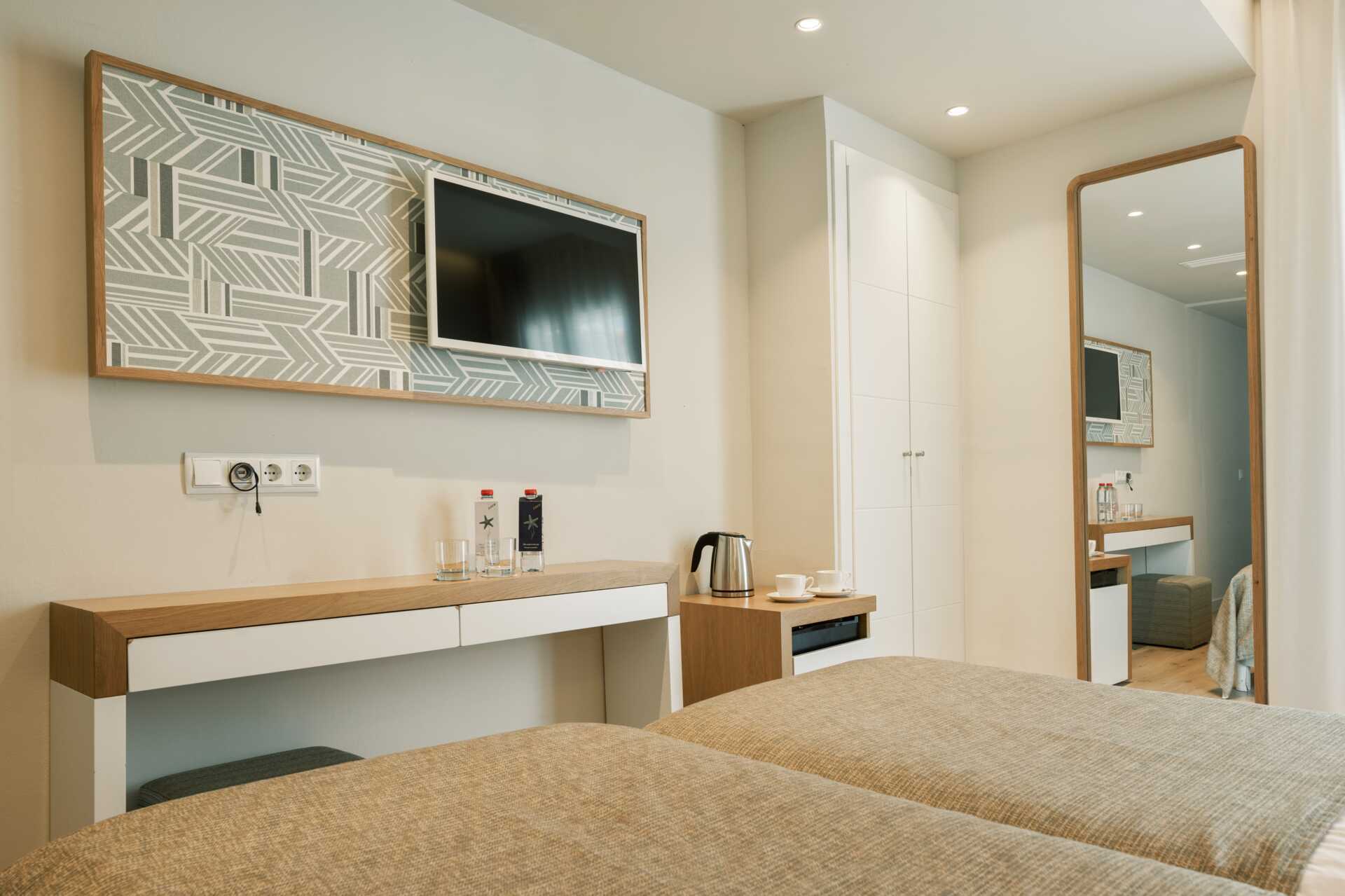 Kahden hengen huone parvekkeella. Parivuode tai kaksi yhden hengen vuodetta. Maksuton wifi, ilmastointi ja tallelokero. Jääkaappi. Vedenkeitin, kahvia ja teetä. Tv kansainvälisillä kanavilla. Hiustenkuivain. Suihku ja wc. Siivous 7 krt/viikko.