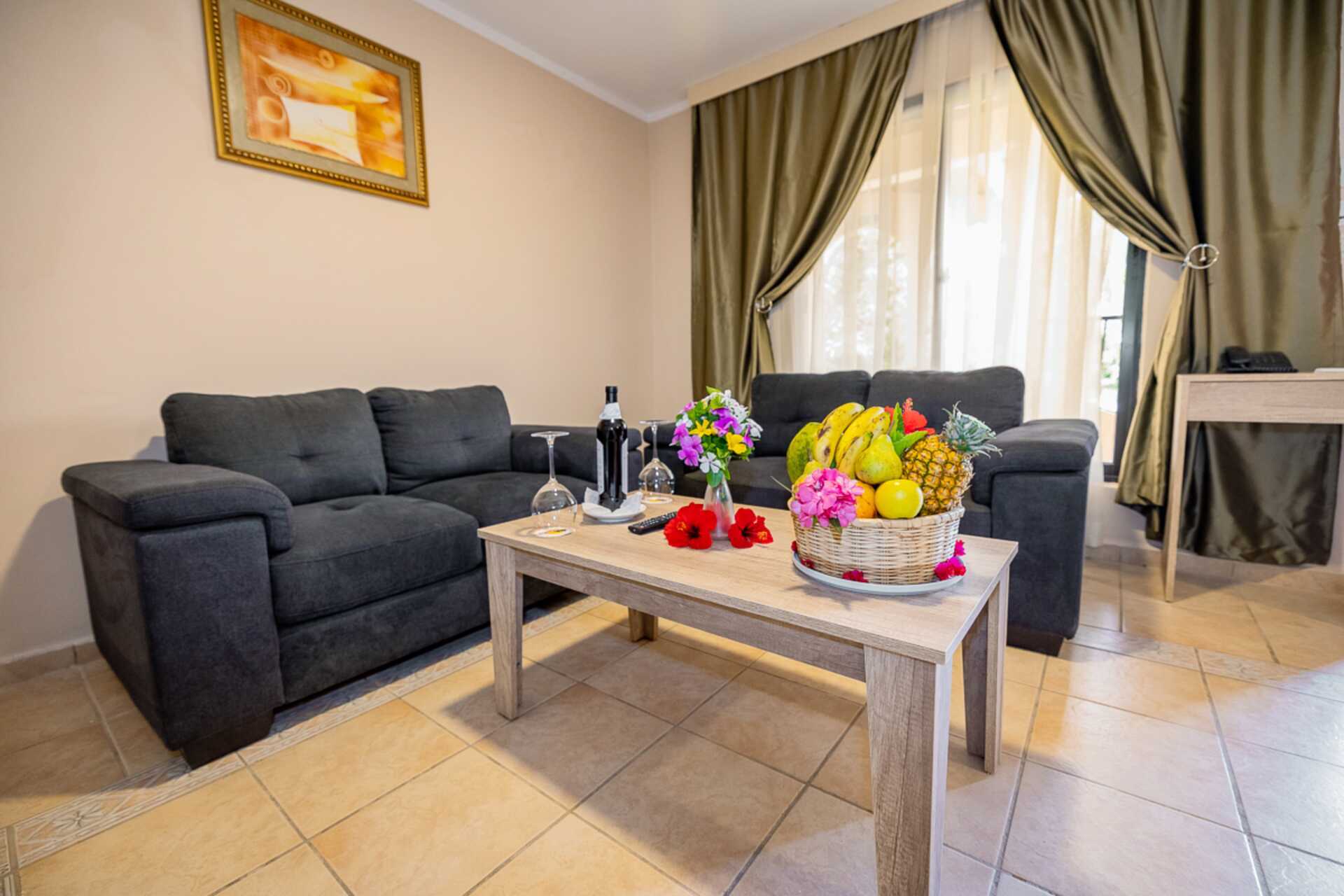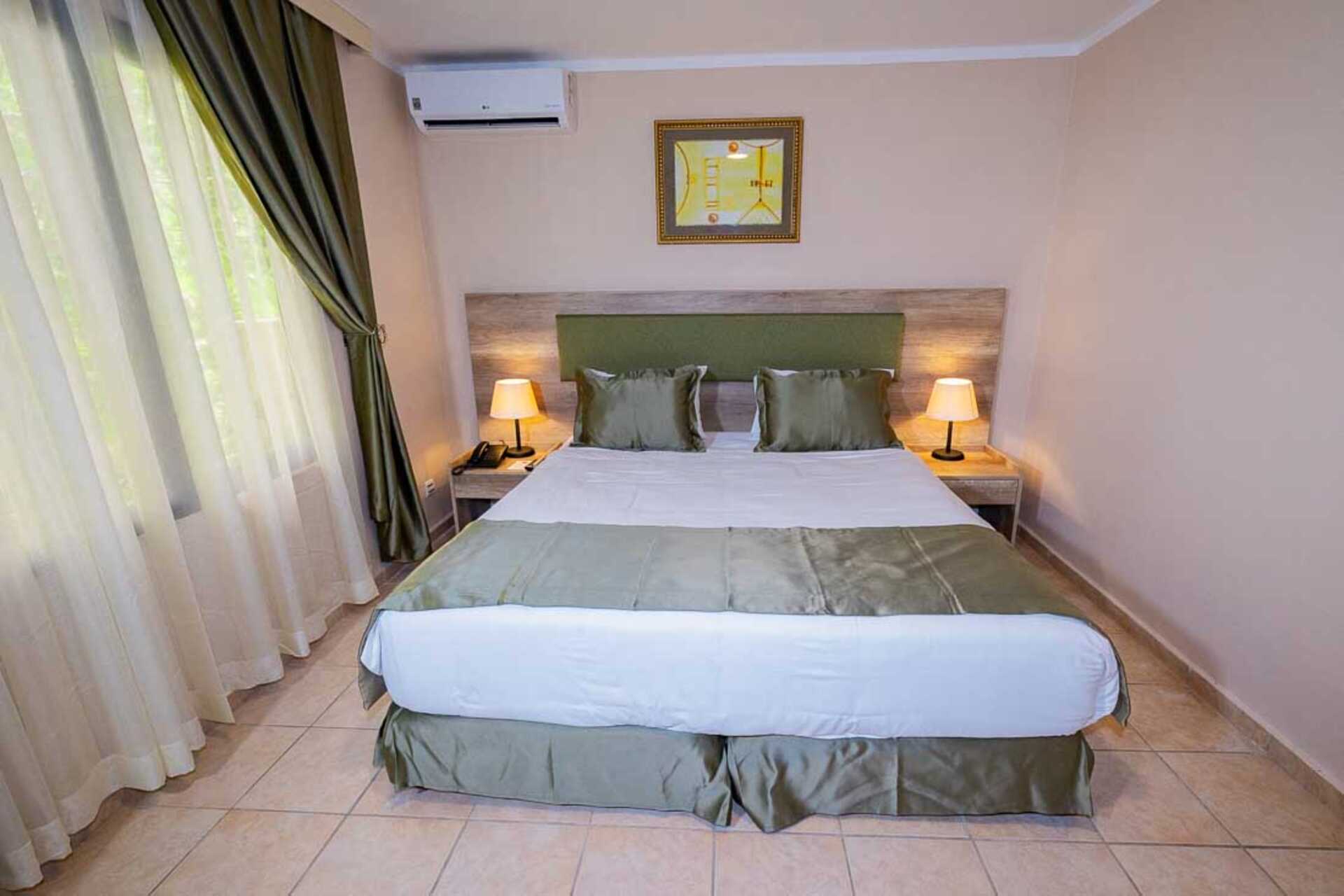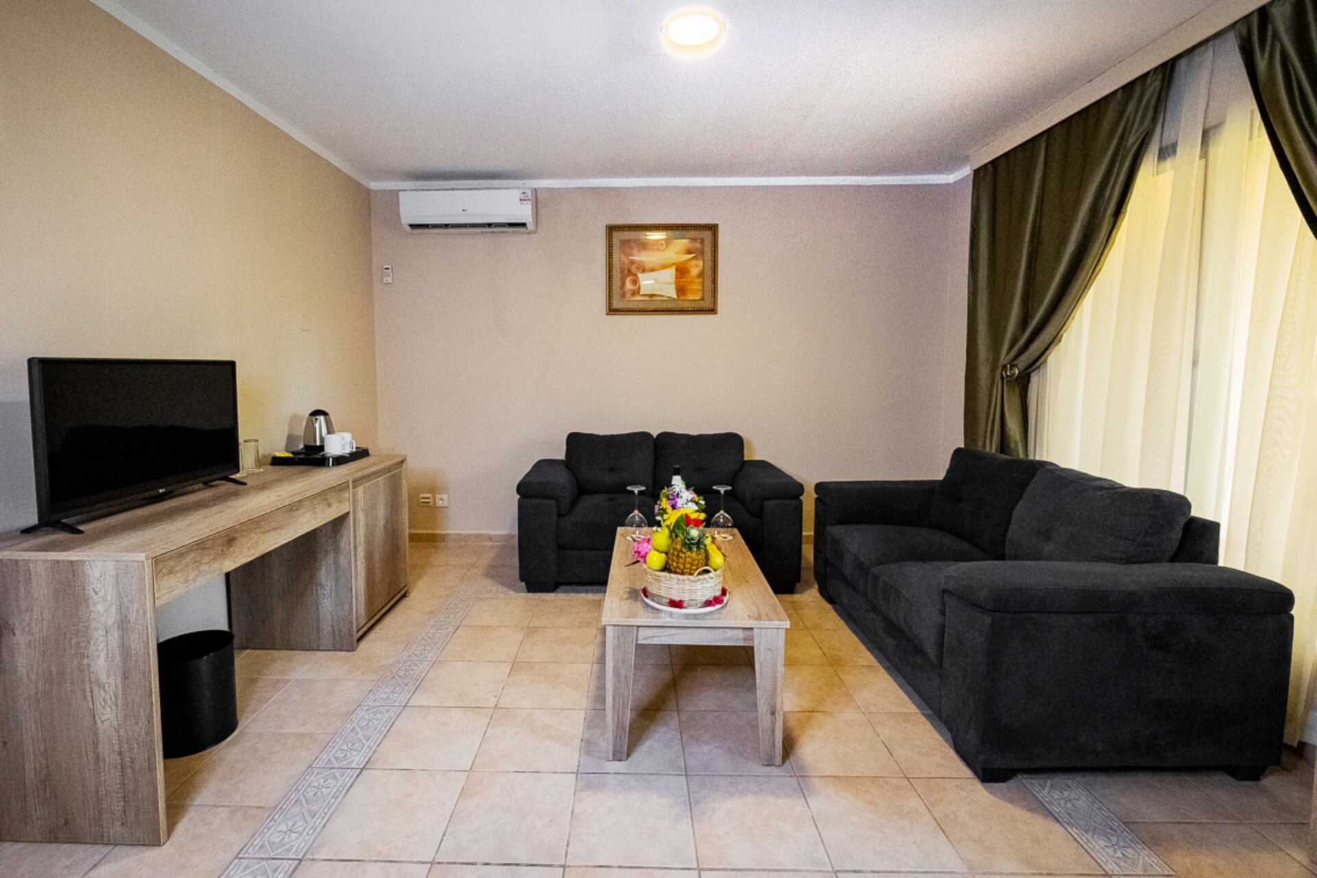 Sviitti, jossa parveke tai terassi. Sviitti koostuu makuuhuoneesta ja olohuoneesta. Parivuode. Lisävuodemahdollisuus yhden hengen vuoteeseen. Maksuton wifi, ilmastointi ja tallelokero. Jääkaappi. Vedenkeitin, kahvia ja teetä. Tv kansainvälisillä kanavilla. Kylpytakit ja tossut. Hiustenkuivain. Kylpyhuoneessa amme, suihku ja wc. Siivous 7 krt/viikko. Hyttysverkot ovat saatavilla kaikkiin ikkunoihin.