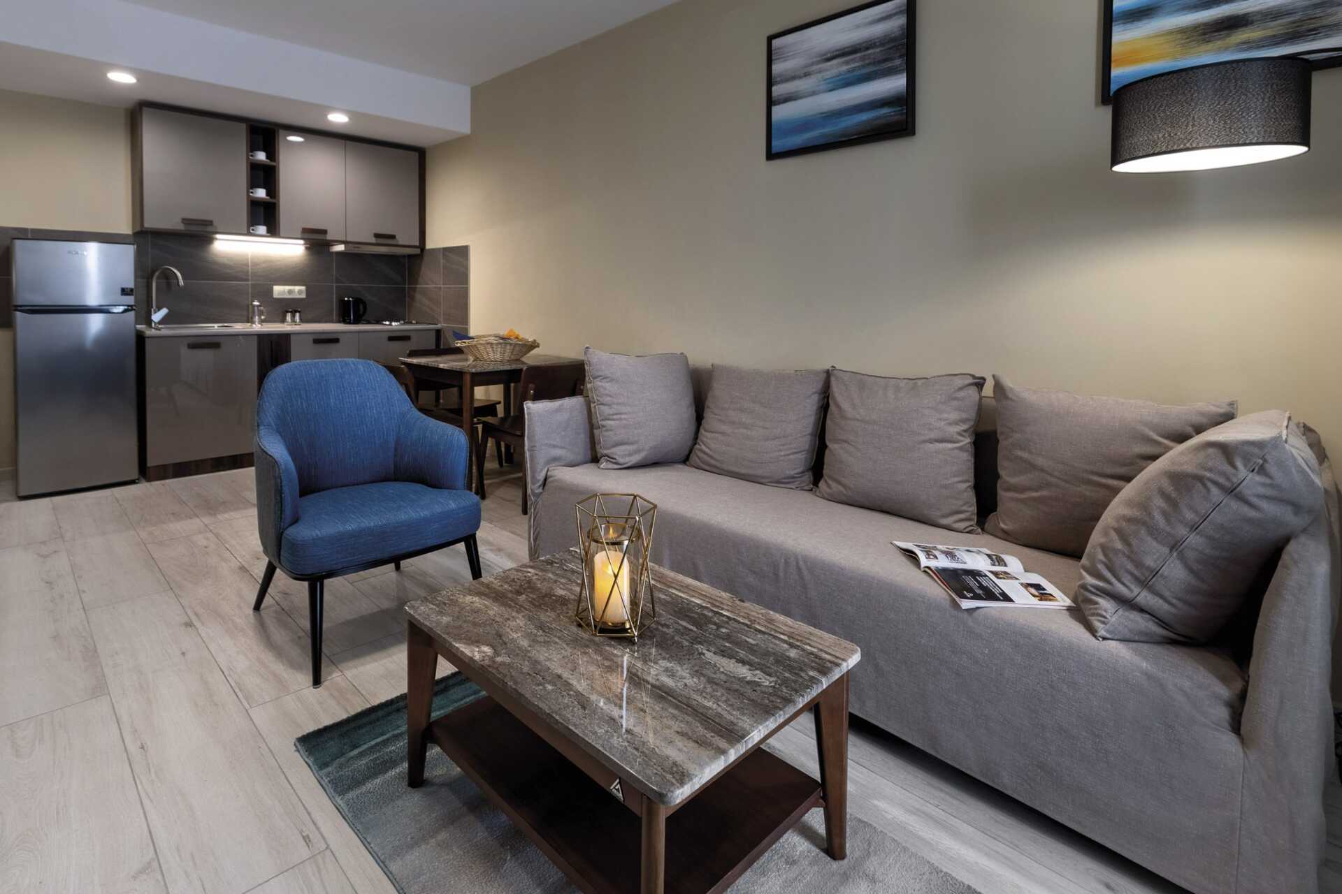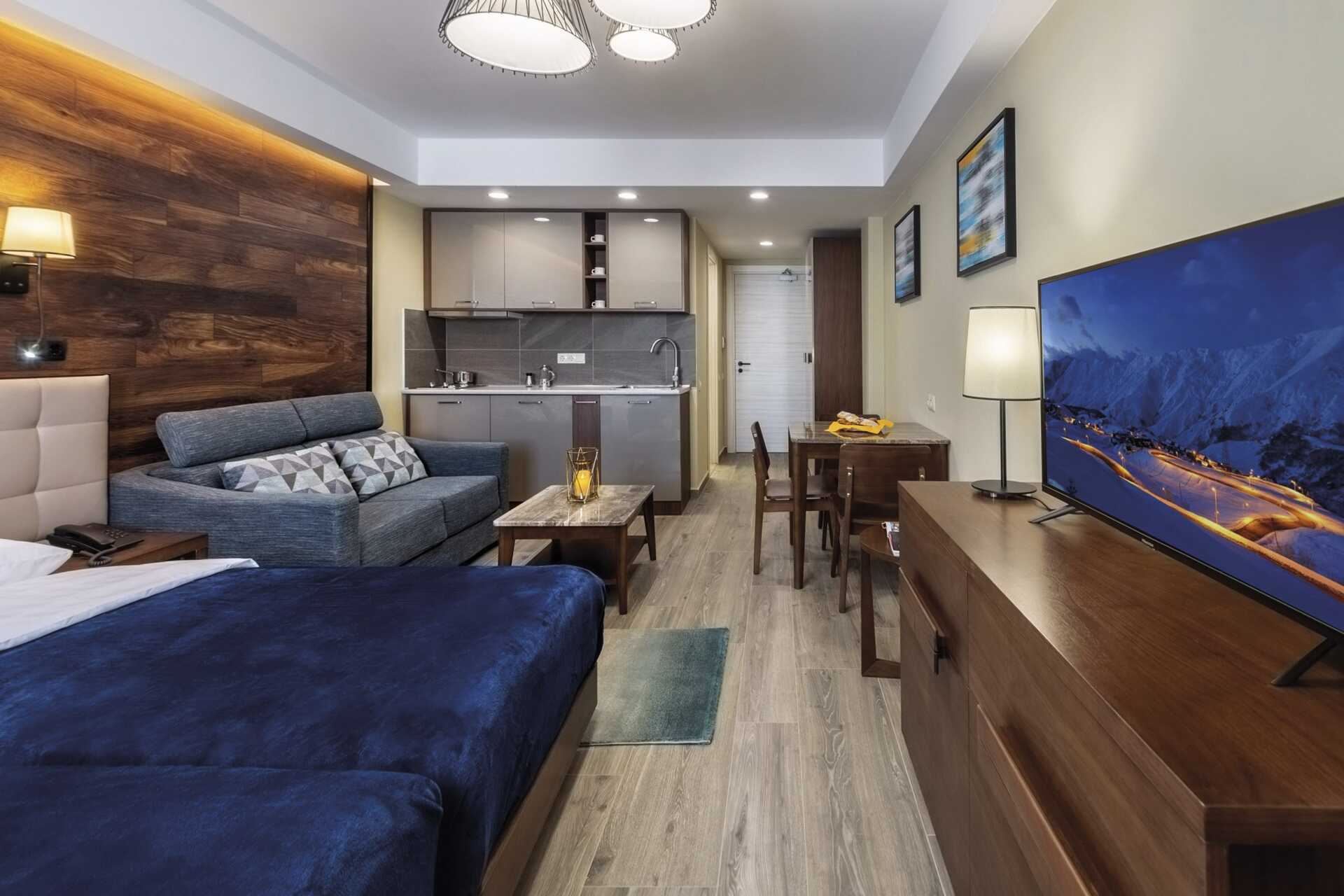 Parvekkeellinen yksiö Makuuhuone minikeittiöllä. Kaksi erillistä vuodetta. Lisävuodemahdollisuus vuodesohvaan. Minikeittiössä jääkaappi, keittolevyt, kahvinkeitin, vedenkeitin ja yksinkertainen keittiövarustus. Maksuton wifi, ilmastointi ja tallelokero. Tv kansainvälisillä kanavilla. Hiustenkuivain. Kylpyhuoneessa suihku ja wc. Siivous 6 krt/viikko.