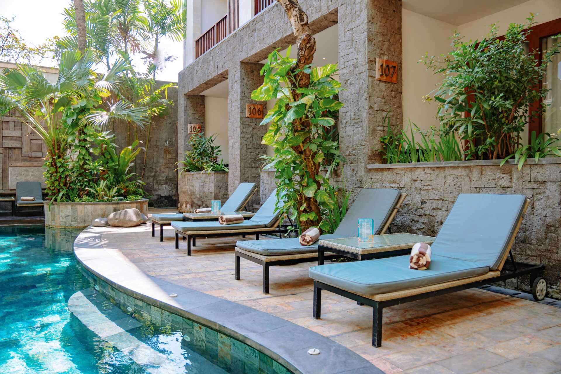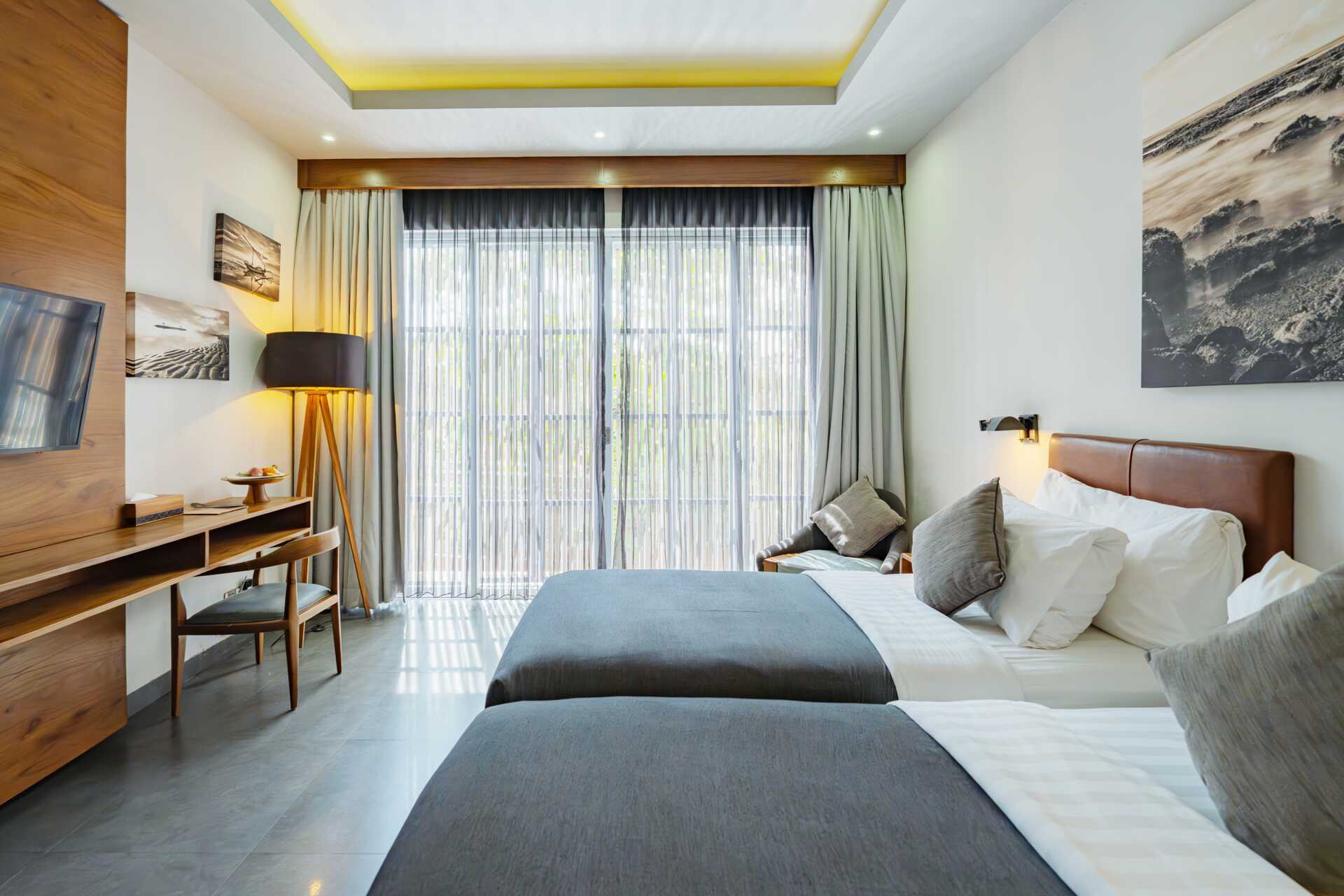Deluxe -huone, jossa parveke tai terassi ja allasnäköala. Parivuode tai kaksi yhden hengen sänkyä. Lisävuodemahdollisuus kolmannelle henkilölle. Maksuton wifi, ilmastointi ja tallelokero. Vedenkeitin, kahvia ja teetä. Tv kansainvälisillä kanavilla. Hiustenkuivain. Kylpyhuoneessa suihku ja wc. Siivous 7 krt/viikko.