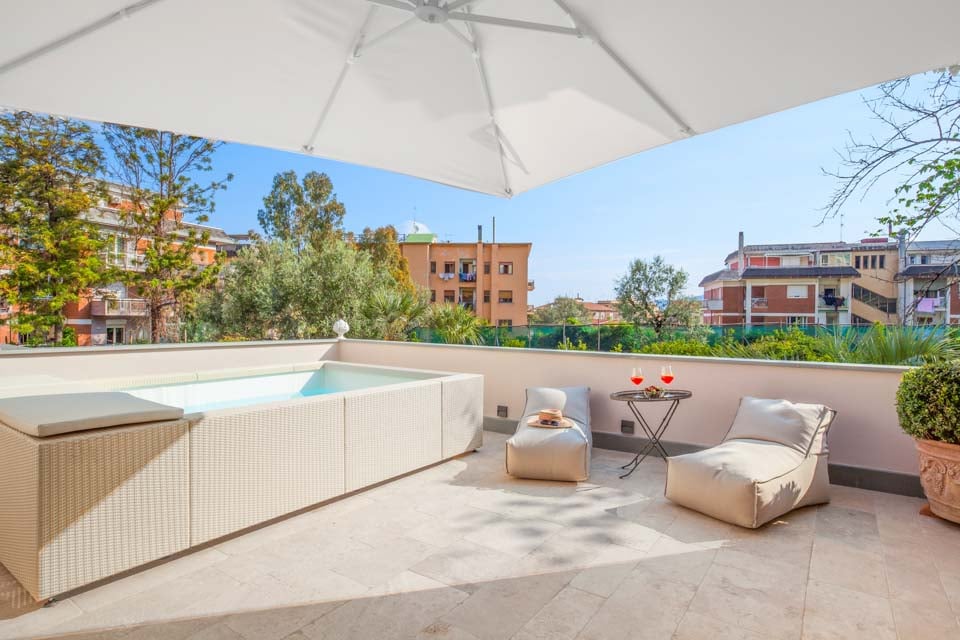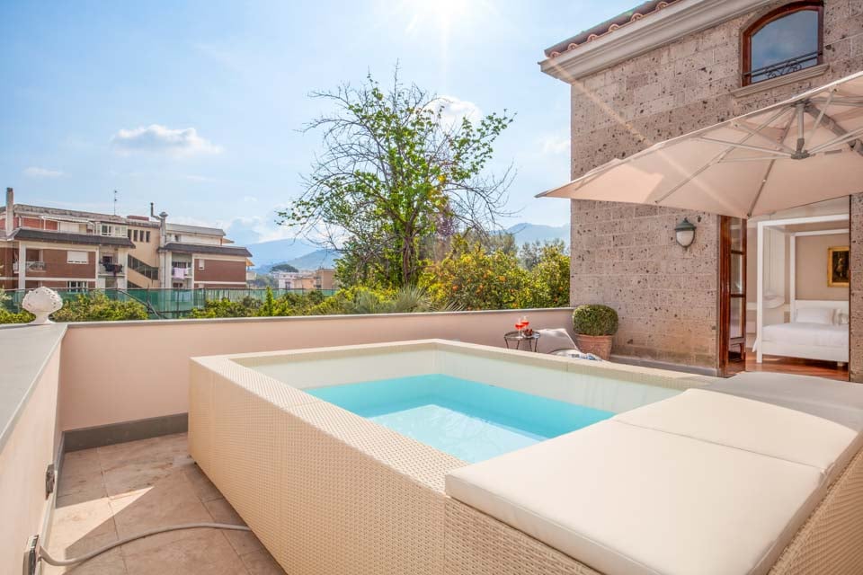 Yksi huvilan huomattavimmista ominaisuuksista on sen pieni yksityinen uima-allas, jonne pääsee suoraan makuuhuoneen parvekkeelta – harvinainen herkku kaupungin sydämessä. Kuvittele aamulla astuvasi ulos virkistävälle pulahdukselle Sorrenton taivaan alle.