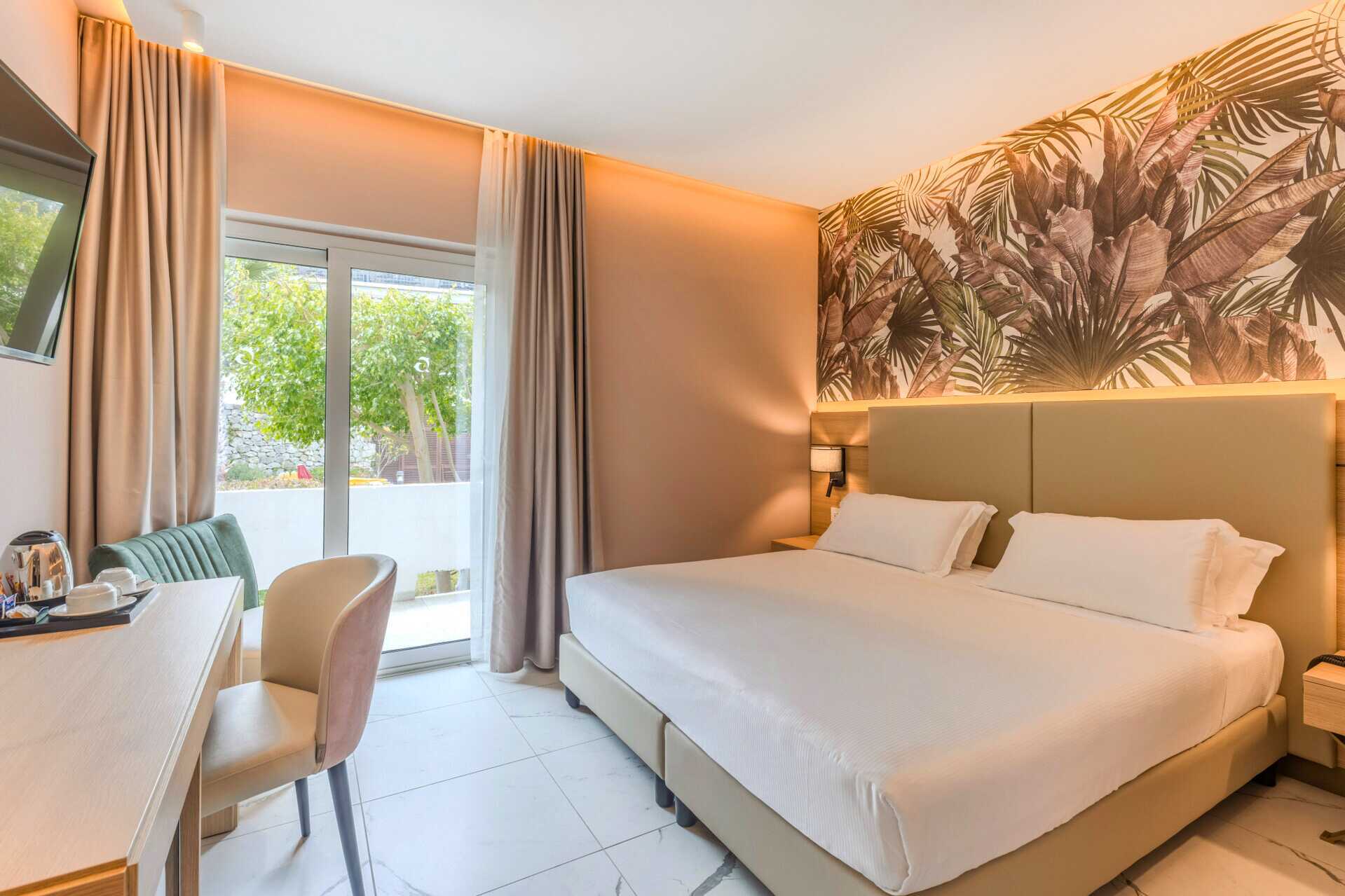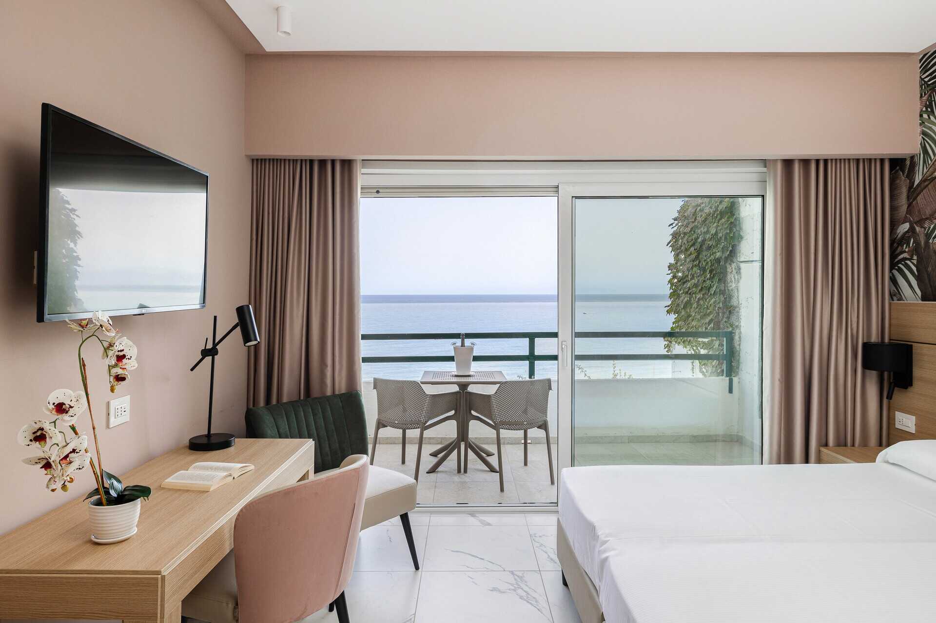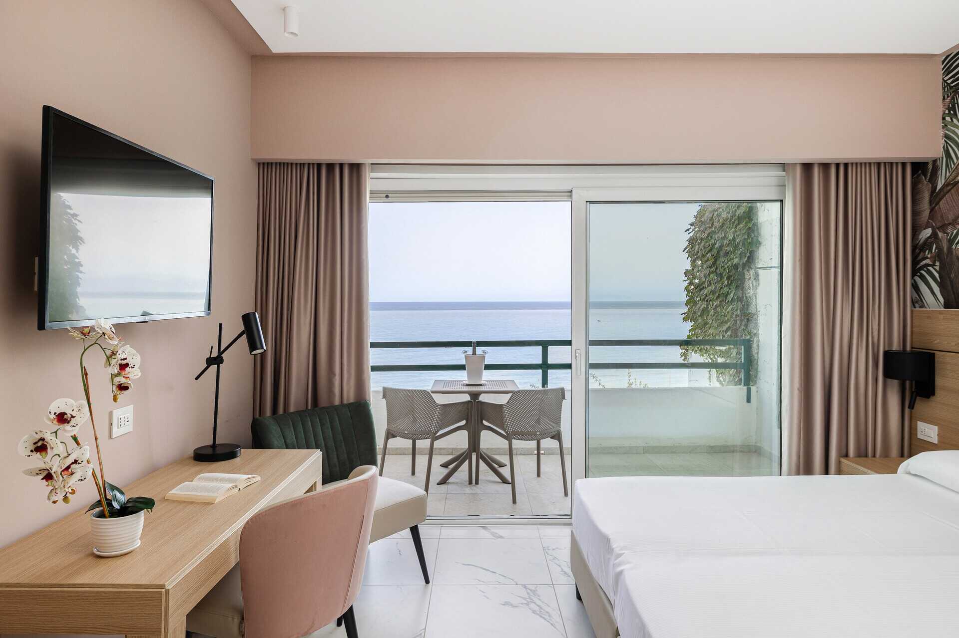 Kahden hengen huone parvekkeella tai terassilla. Parivuode tai kaksi yhden hengen sänkyä. Lisävuodemahdollisuus. Maksuton wifi, ilmastointi ja tallelokero. Pieni jääkaappi. Tv kansainvälisillä kanavilla. Hiustenkuivain. Kylpyhuoneessa suihku ja wc. Siivous 3 krt/viikko.