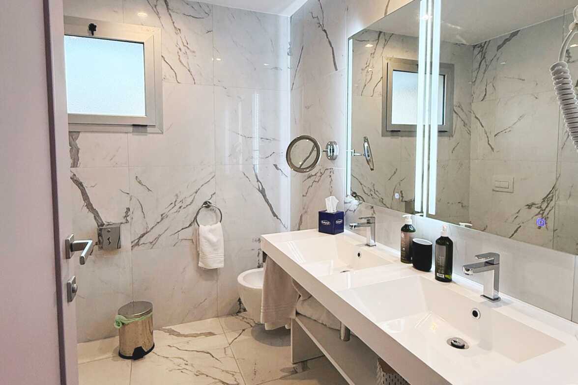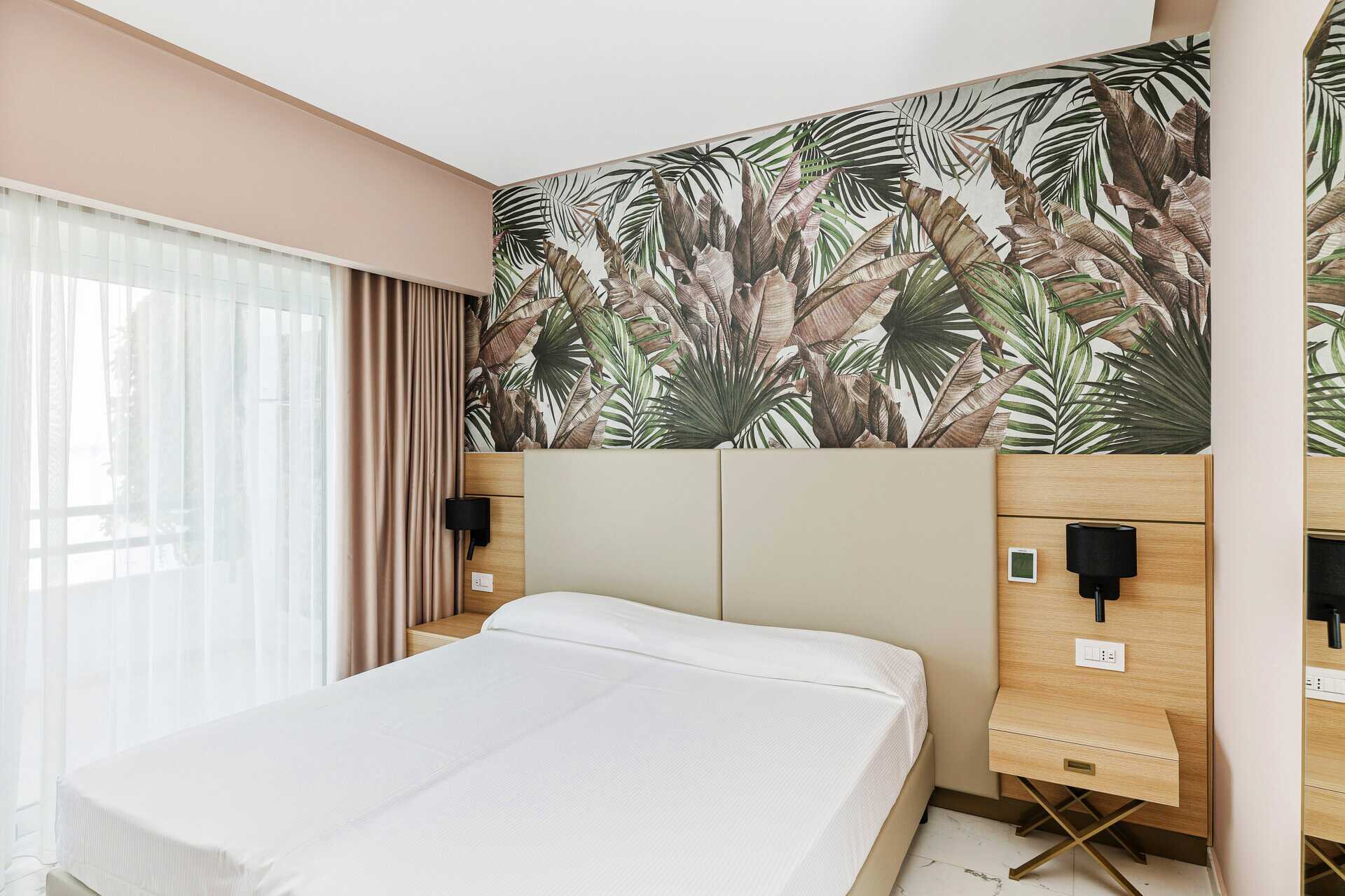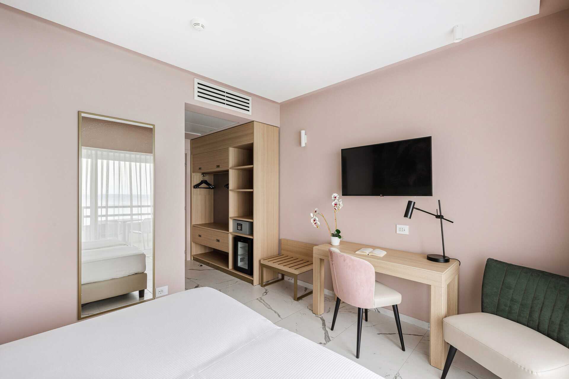 Kahden hengen huone parvekkeella tai terassilla. Parivuode tai kaksi yhden hengen sänkyä. Lisävuodemahdollisuus. Maksuton wifi, ilmastointi ja tallelokero. Pieni jääkaappi. Tv kansainvälisillä kanavilla. Hiustenkuivain. Kylpyhuoneessa suihku ja wc. Siivous 3 krt/viikko.