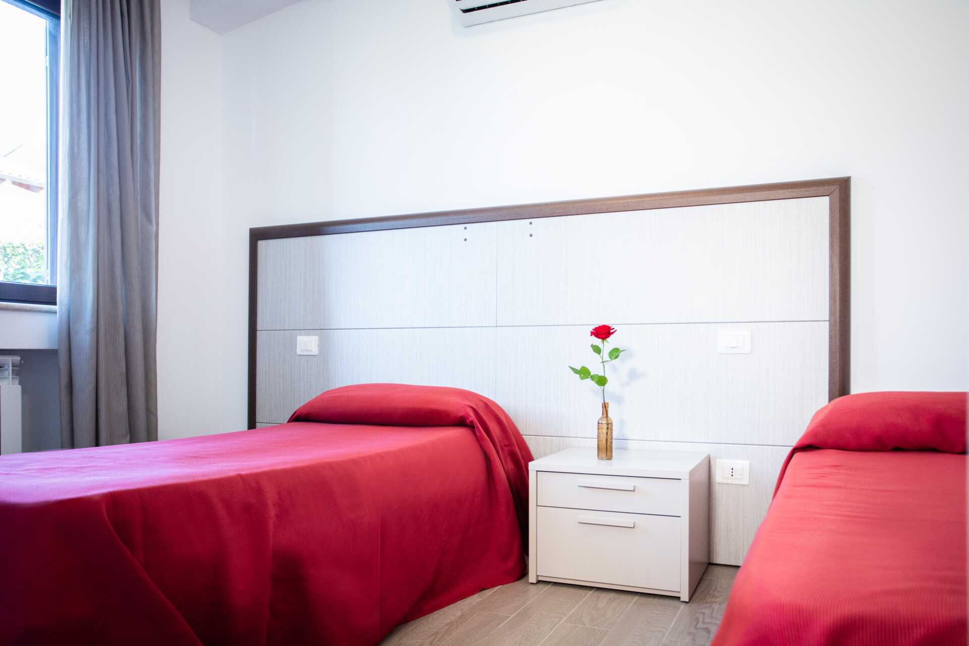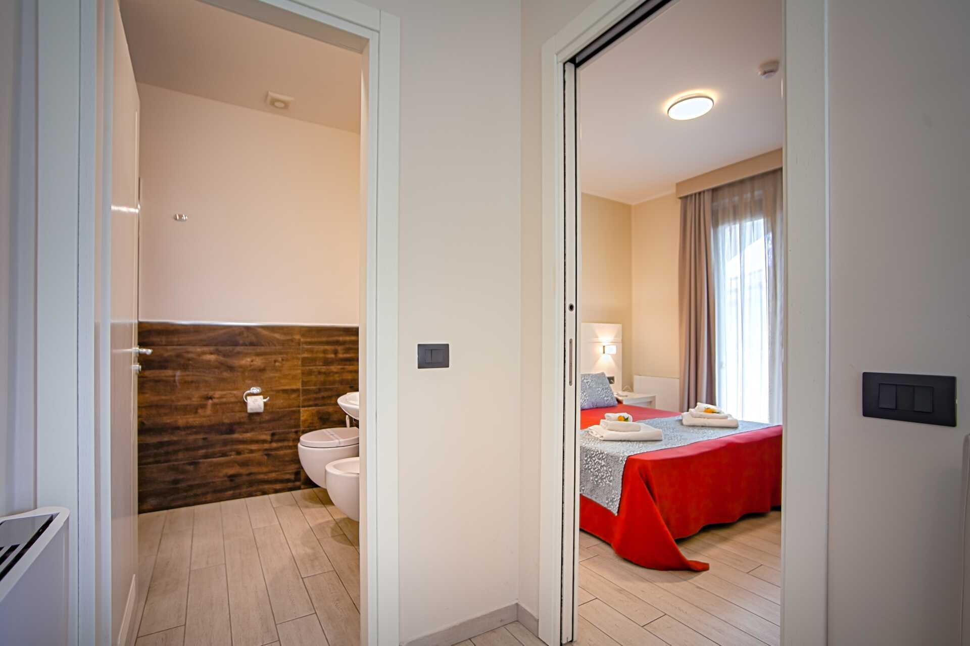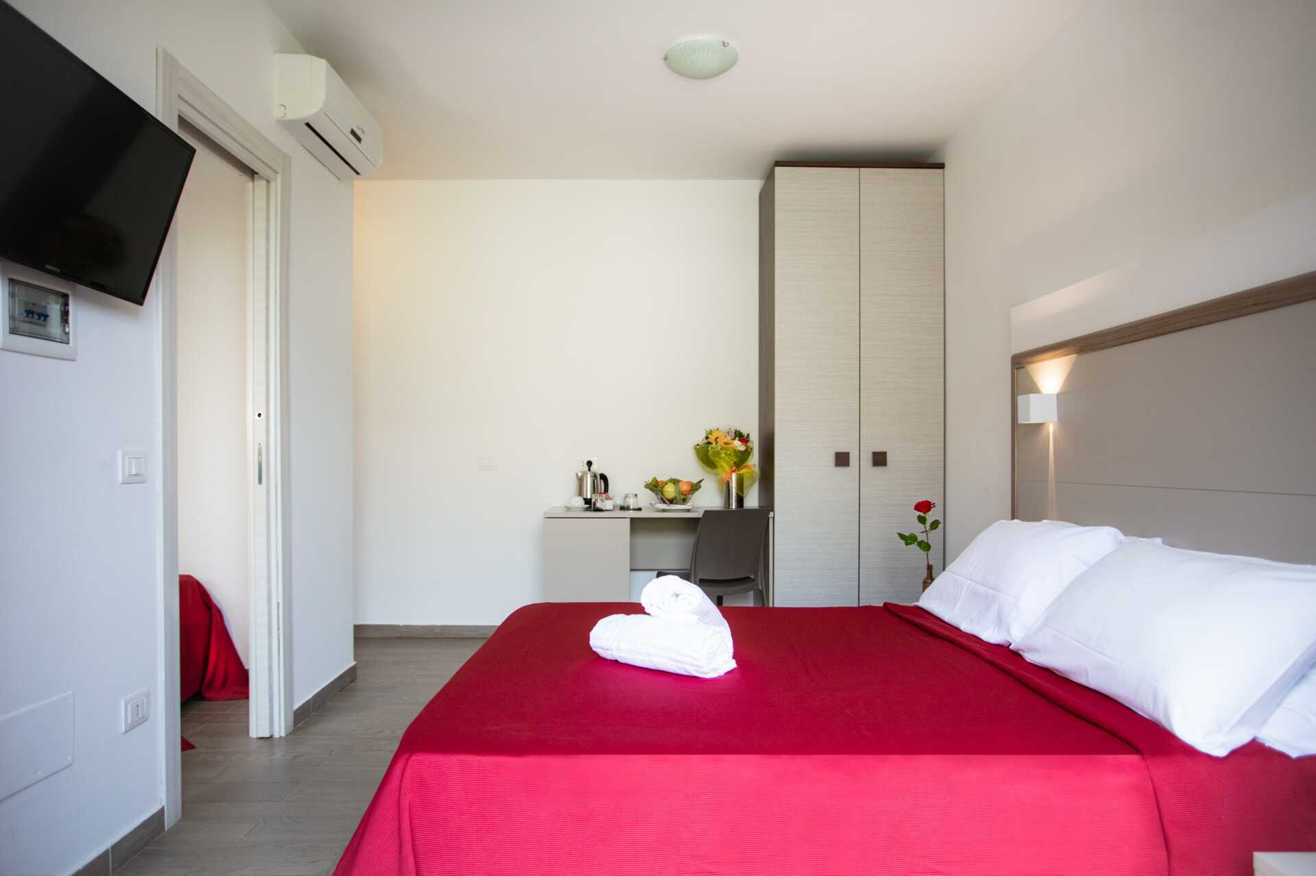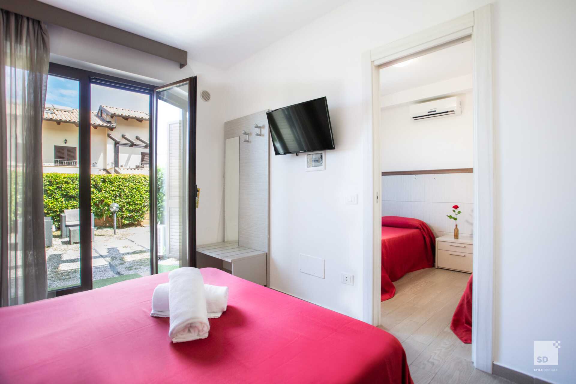 Kahden hengen huone parvekkeella tai terassilla. Parivuode tai kaksi yhden hengen vuodetta. Lisävuodemahdollisuus vuodesohvasta. Maksuton wifi, ilmastointi ja tallelokero. Vedenkeitin. Jääkaappi. Tv paikallisilla kanavilla. Hiustenkuivain. Amme tai suihku ja wc. Siivous 7 krt/viikko.