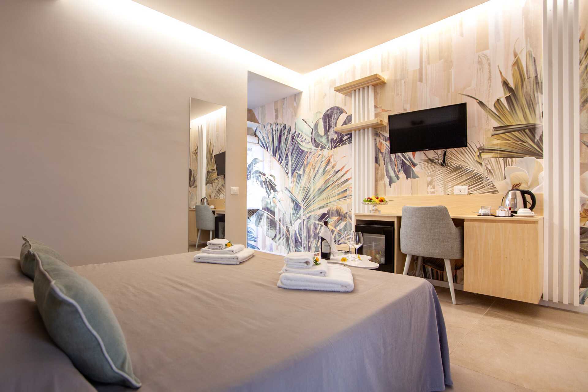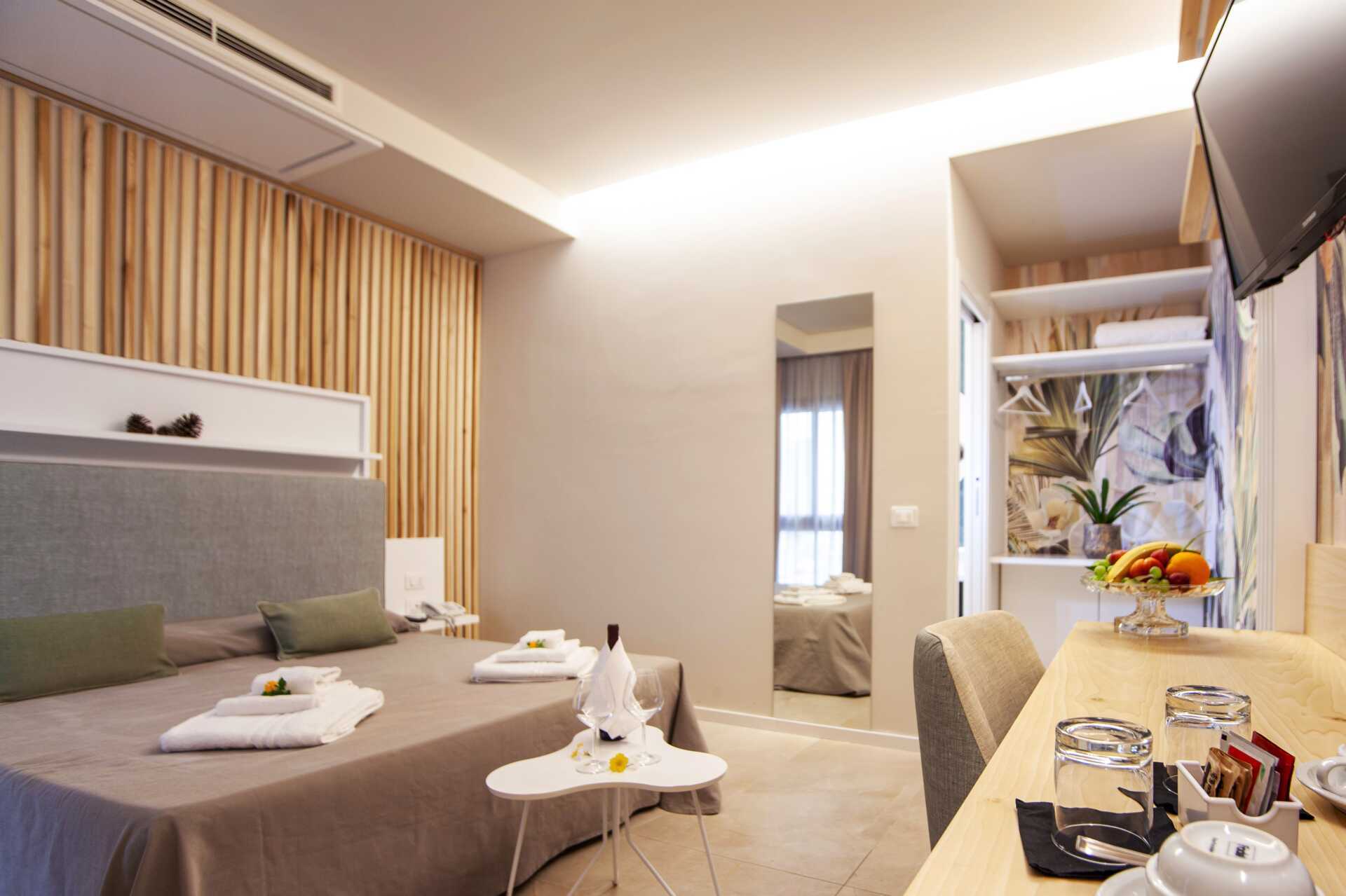 Superior-huone parvekkeella tai terassilla. Parivuode tai kaksi yhden hengen vuodetta. Maksuton wifi, ilmastointi ja tallelokero. Vedenkeitin. Jääkaappi. Tv paikallisilla kanavilla. Hiustenkuivain. Amme tai suihku ja wc. Siivous 7 krt/viikko.