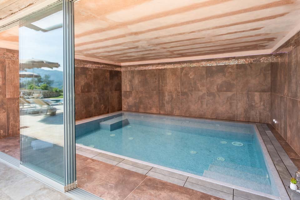 Sisällä vieraat löytävät tyylikkäästi sisustetun sisätilan lämpimin toscanalaisin sävyin ja elegantilla sisustuksella, jota täydentävät lämmitetty* sisäuima-allas hierovilla suihkuilla ja oma sauna täydelliseen rentoutumiseen. Molempiin pääsee ulkoterassilta ulkouima-altaan ympärillä.