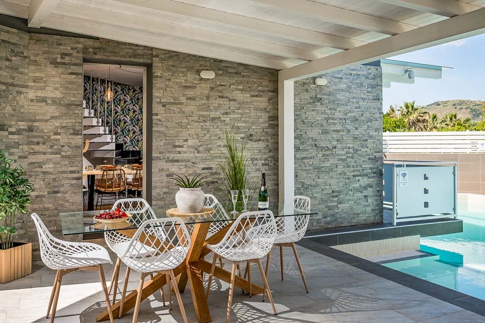 Huvilan sydän on sen avoin olohuone ja keittiö – valoisa ja viihtyisä tila, joka on suunniteltu helppoa asumista varten. Vaikka uunia ei olekaan, löydät suuren lieden, mikroaaltouunin ja jääkaappipakastimen valmiiksi kulinaarisia luomuksiasi varten. Ilmastointi pitää sisätilat viileinä, ja hyvinvointihuone kutsuu rentoutumaan porealtaalla, saunalla ja ylimääräisellä suihkuhuoneella.