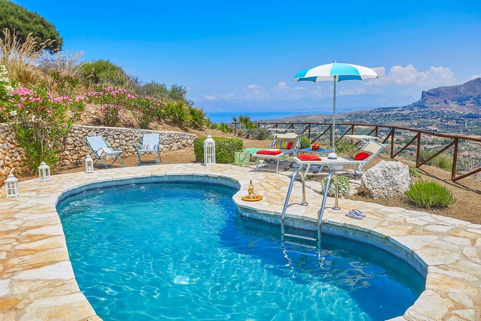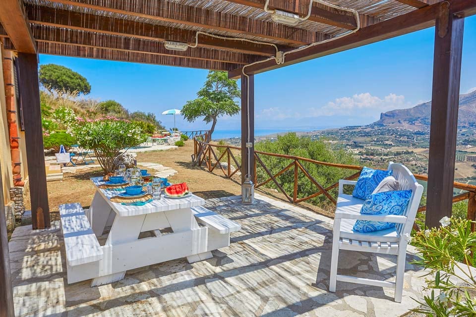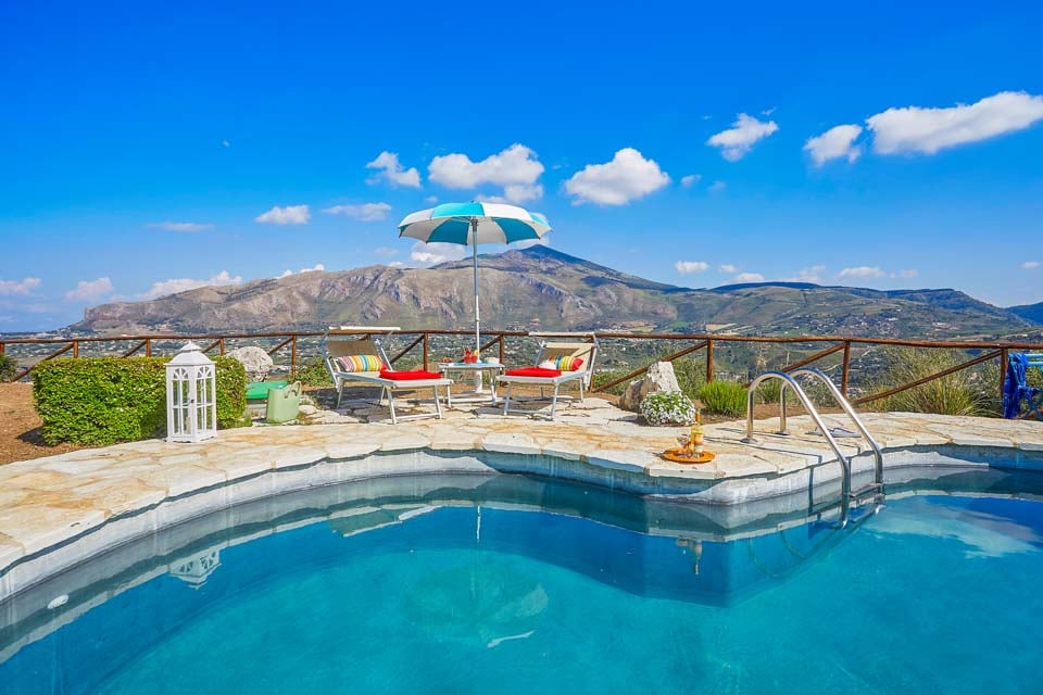 Astu ulos ja katsele taivaansinisten vesien yli kohti Castellammarea, missä kukkulat kohtaavat meren. Näkymät ovat suorastaan henkeäsalpaavat. Uima-allas, jota ympäröi maalaismainen kiviterassi, muuttuu yksityiseksi keitaaksi, jota reunustavat aurinkotuolit ja joista on näkymät alapuolella olevalle merelle. Huvilan etuosassa olevalla katetulla verannalla on mukavat istuimet ja ulkoruokailutilat, jotka sopivat täydellisesti iltojen rentoutumiseen.