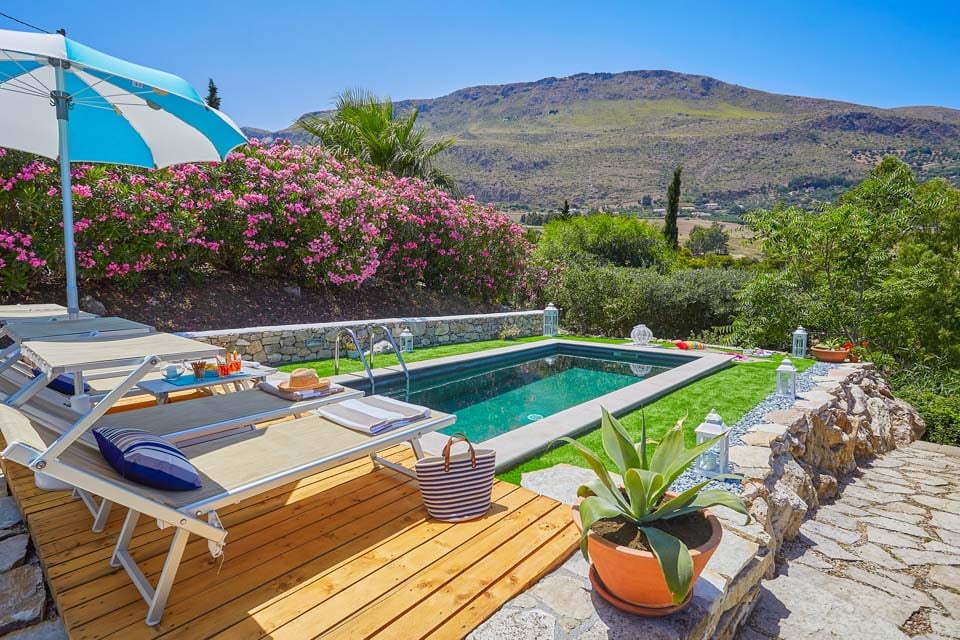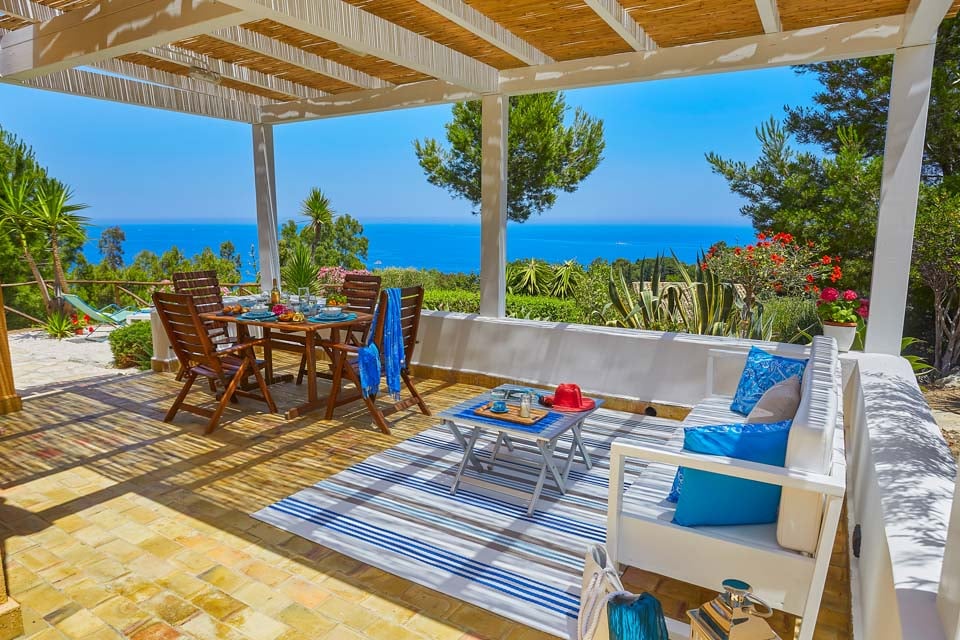 Ulkona huvilassa on ainutlaatuinen terassi, jolta on panoraamanäkymät vuorille, rinteille ja Cala Mazzo di Sciaccan syvänsiniselle lahdelle. Varjoisa veranta tarjoaa runsaasti tilaa ulkoilmaruokailuun, ja siellä on suuri ruokapöytä ja runsaasti mukavia istumapaikkoja. Villan takaosassa olevalla toisella verannalla on kannettava grilli ja allas, jotka sopivat täydellisesti tuoreiden aterioiden valmistukseen. Löydät oman uima-altaasesi välimerellisen puutarhan keskeltä, josta on upeat merinäköalat ja jonka äärellä on aurinkotuoleja ja jopa nurmialue.