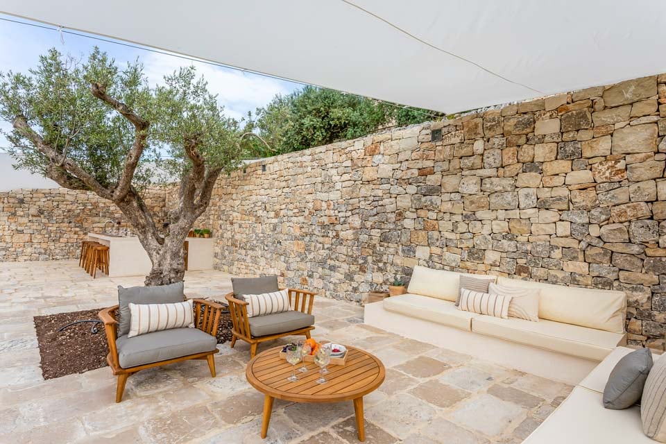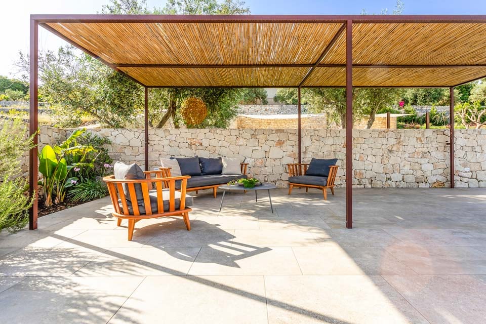 Astu ulos ja maisema avautuu avaraksi. Laaja terassi ulottuu kohti horisonttia, sopii erinomaisesti hitaisiin aamuihin tai sosiaalisiin kokoontumisiin. Suuri ylivuotoallas kimaltelee auringossa ja kutsuu vilvoittelemaan, samalla kun yrttien tuoksu leijailee läheisestä ulkoilmakeittopaikasta. Allaspyyhkeet ovat valmiina, aurinkotuolit odottavat, ja ainoa ääniraita on kukkuloiden halki puhaltava tuuli.