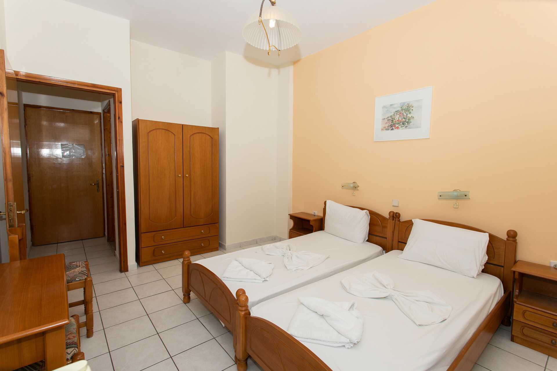 Kahden hengen huone parvekkeella. Kaksi yhden hengen sänkyä. Lisävuodemahdollisuus yhden hengen sängystä. Ilmastointi lisämaksusta. Jääkaappi. Tv kansainvälisillä kanavilla. Kylpyhuoneessa suihku ja wc. Siivous 5 krt/viikko. Alle 2-vuotiaat lapset lasketaan lisävuoteella majoittuviksi henkilöiksi.