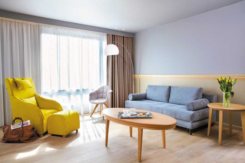 Junior-sviitti, ilman ulkotilaa. Sviitissä on olohuone, jossa on sohva ja nojatuoleja, sekä makuuhuone, jossa on parivuode tai kaksi erillistä vuodetta avoimessa pohjaratkaisussa. Lisävuodemahdollisuus vuodesohvasta. Tyynymenu. Maksuton wifi, ilmastointi ja tallelokero. Jääkaappi. Vedenkeitin, kahvia ja teetä. Espresso-kahvinkeitin - kaksi kapselia sisältyy saavuttaessa. Kaksi televisiota kansainvälisillä kanavilla. Silitysrauta ja -lauta. Kylpytakit ja tossut. Hiustenkuivain. Kylpyhuoneessa kylpyamme, suihku ja wc. Siivous 7 krt/viikko.