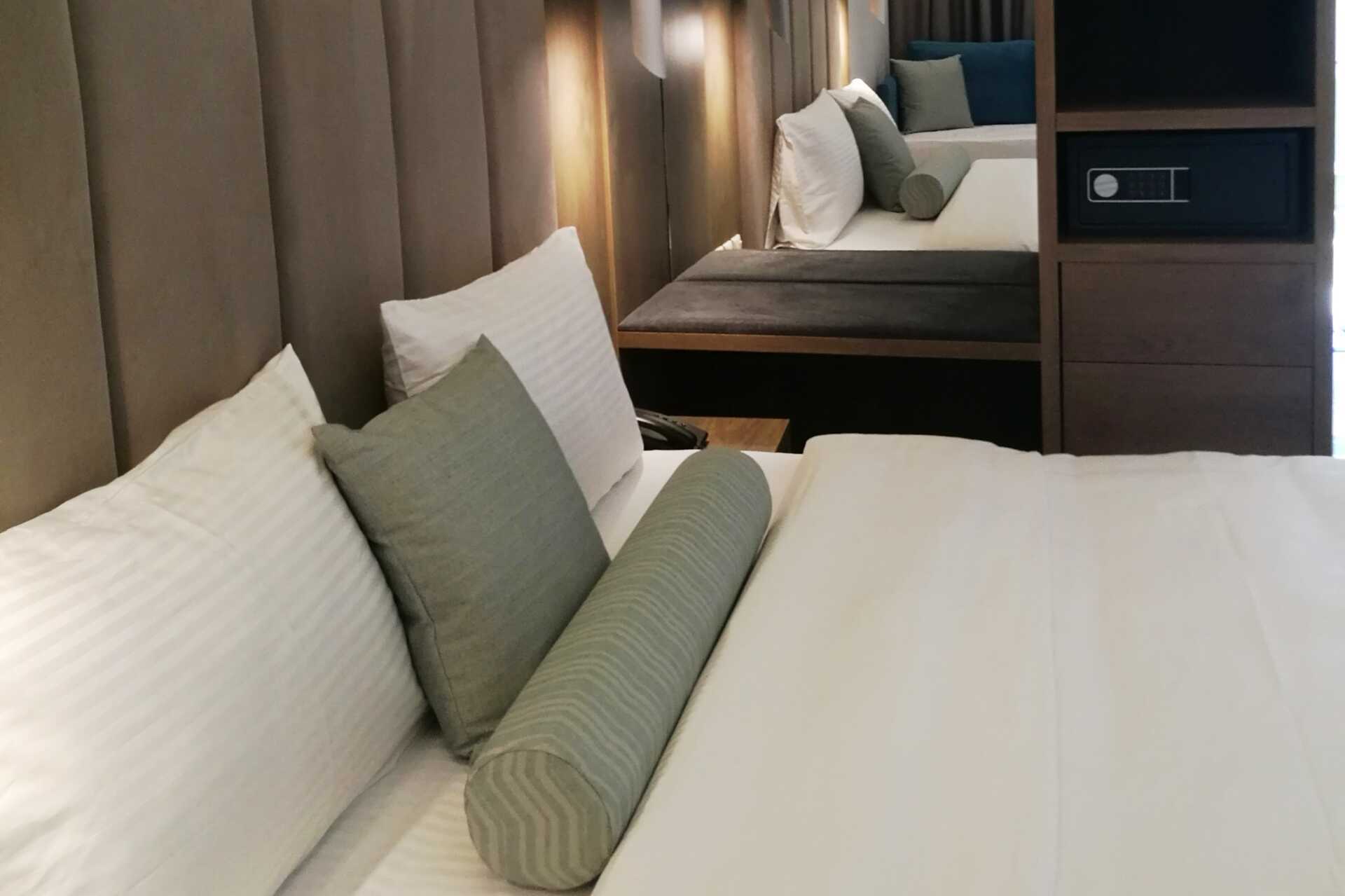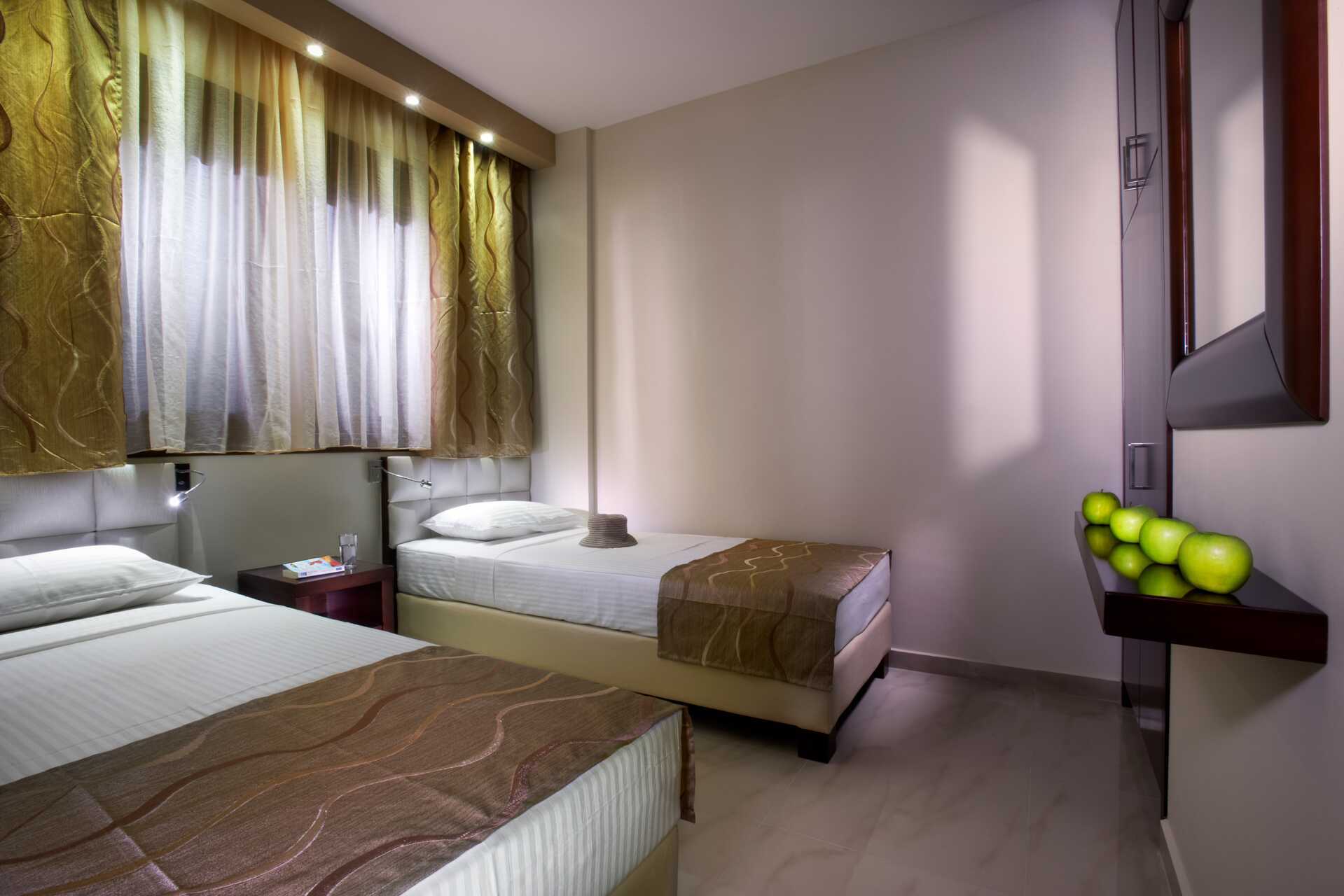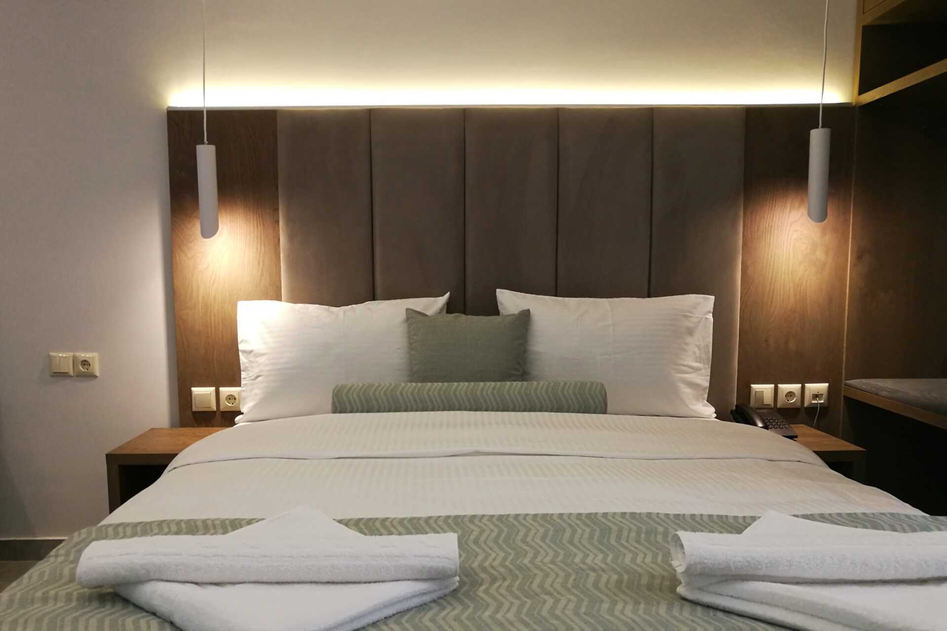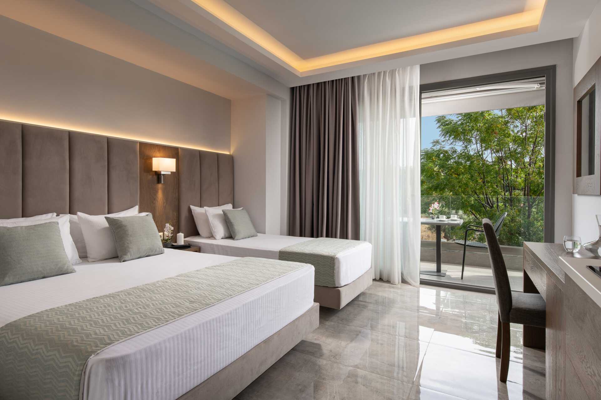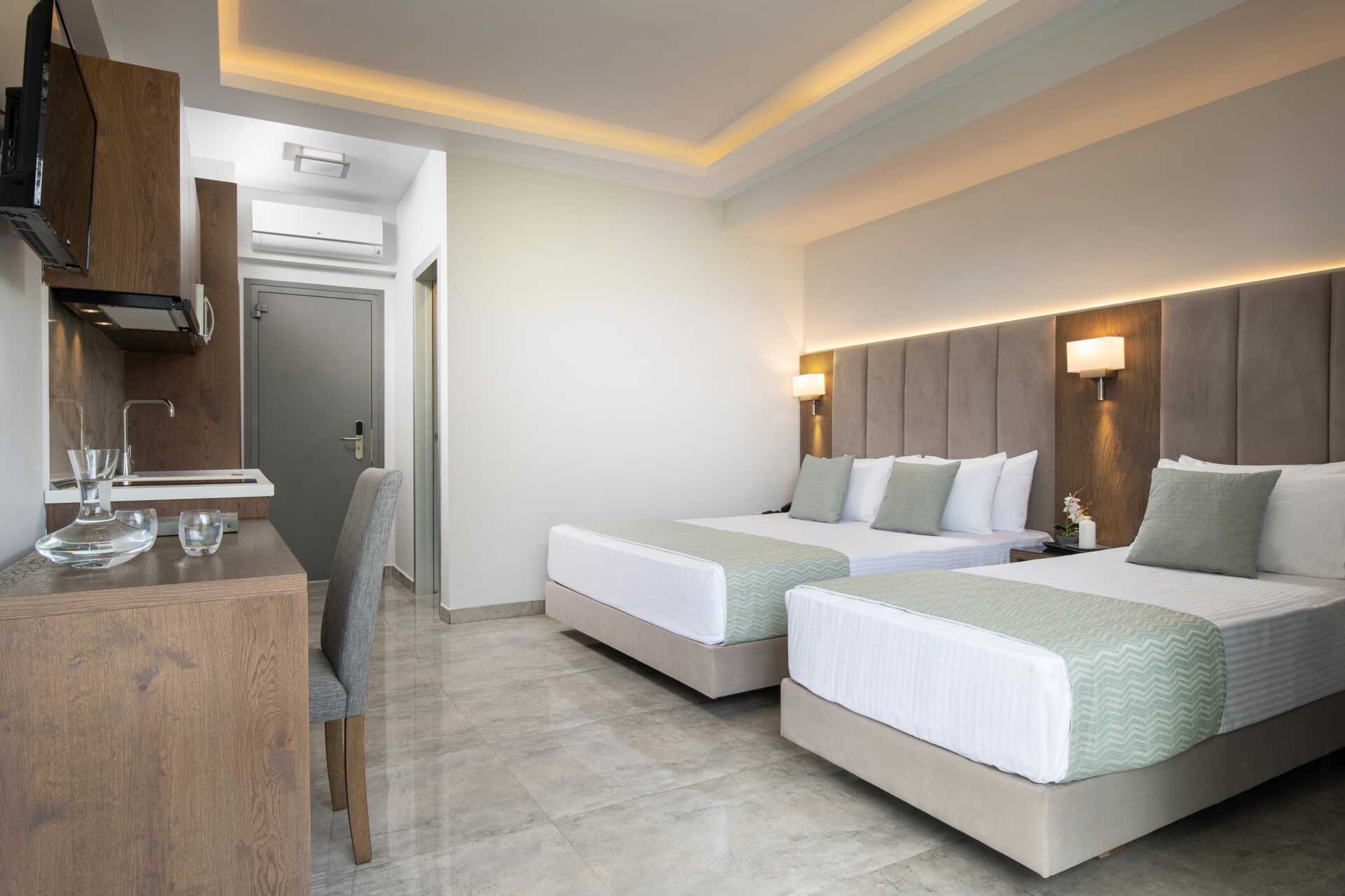 Superior-yksiö, jossa on parveke tai terassi. Yhdistetty makuuhuone ja minikeittiö. Parivuode, mahdollisuus saada lisävuoteita vuodesohvalla. Liukuva lasiovi sängyn ja vuodesohvan välissä. Minikeittiö, jossa jääkaappi, keittolevyt, mikroaaltouuni ja yksinkertainen keittiövarustus. Maksuton wifi, ilmastointi ja tallelokero. Tohvelit. Hiustenkuivain. Kylpyhuoneessa suihku ja wc. Siivous 7 krt/viikko.