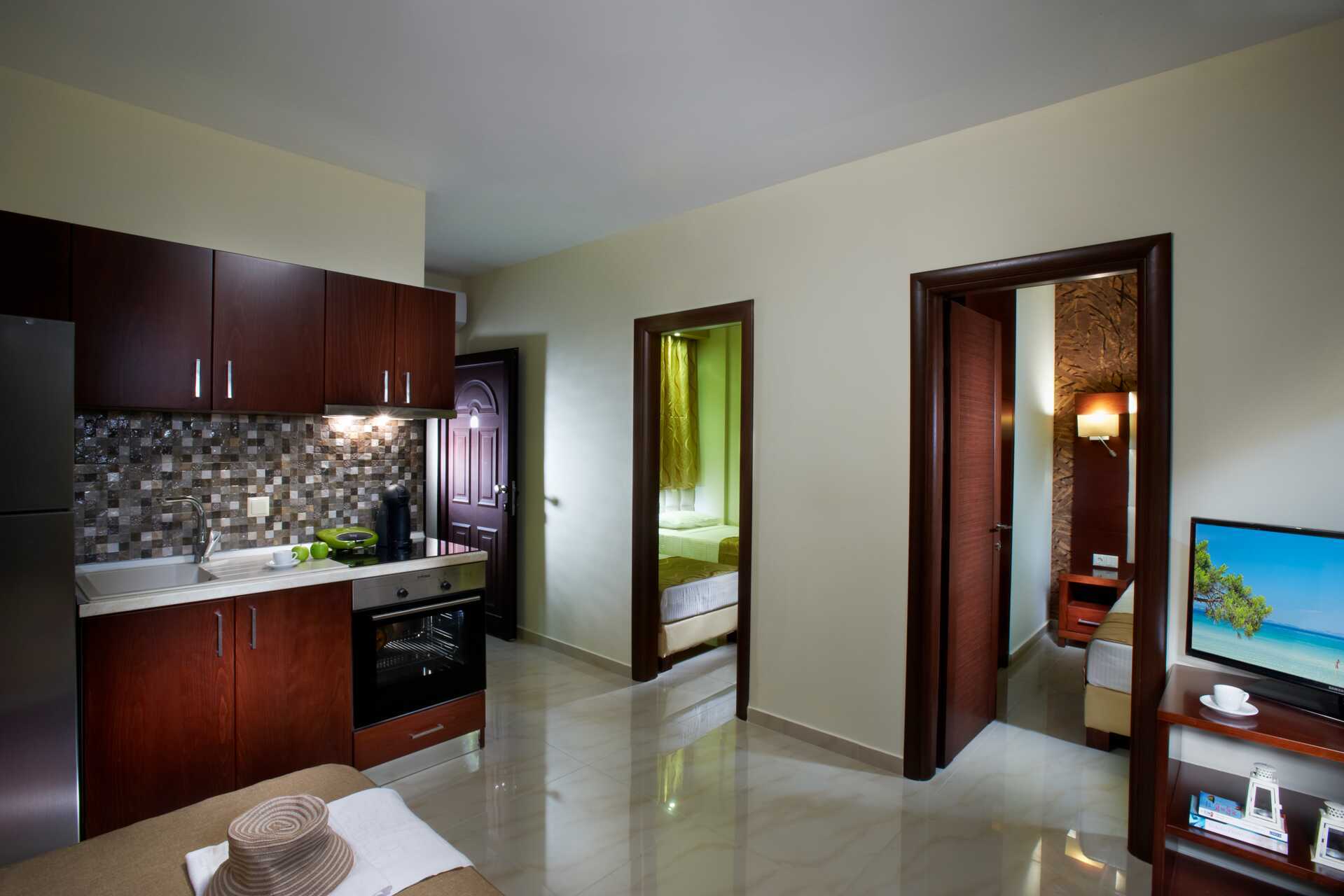 Kolmio parvekkeella Yhdessä makuuhuoneessa on parivuode ja toisessa makuuhuoneessa kaksi erillistä vuodetta. Yhdistetty olohuone/minikeittiö, jossa on mahdollisuus lisävuoteeseen vuodesohvassa. Minikeittiö, jossa jääkaappi, keittolevyt, mikroaaltouuni ja yksinkertainen keittiövarustus. Maksuton wifi, ilmastointi ja tallelokero. Tohvelit. Hiustenkuivain. Kylpyhuoneessa suihku ja wc. Siivous 7 krt/viikko.