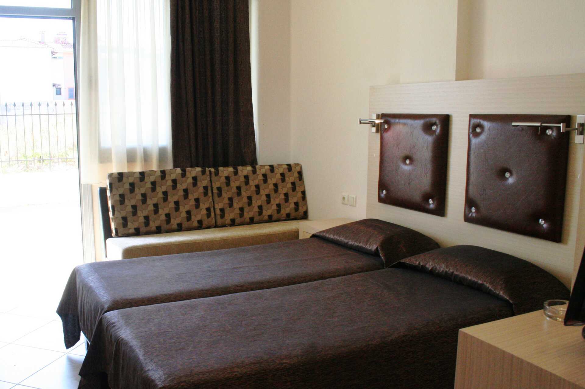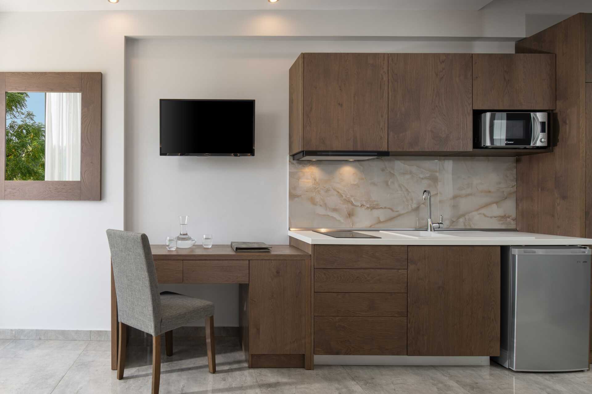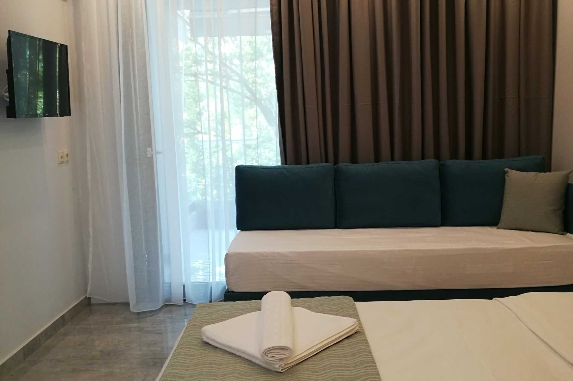 Yksiö, parvekkeella tai terassilla. Yhdistetty makuuhuone ja minikeittiö. Parisänky ja mahdollisuus lisävuoteeseen vuodesohvassa tai yhden hengen vuoteessa. Minikeittiö, jossa jääkaappi, keittolevyt, mikroaaltouuni ja yksinkertainen keittiövarustus. Maksuton wifi, ilmastointi ja tallelokero. Tohvelit. Hiustenkuivain. Kylpyhuoneessa suihku ja wc. Siivous 7 krt/viikko.
