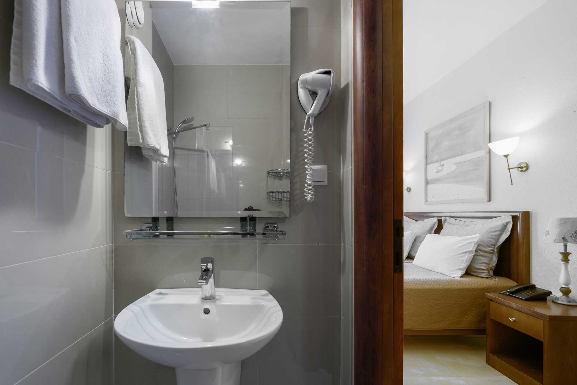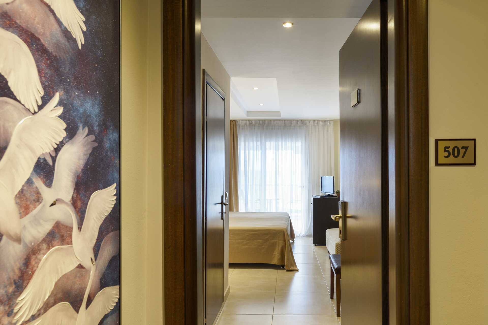 Superior-huone parvekkeella ja merinäköalalla. Huoneet sijaitsevat 4. ja 5. kerroksessa ilman hissiä. Parivuode tai kaksi yhden hengen sänkyä. Maksuton wifi, ilmastointi ja tallelokero. Minibaari (tyhjä). Tv kansainvälisillä kanavilla. Vedenkeitin, kahvia ja teetä. Espresso-kahvinkeitin - kapselit mukana ja täytetään uudelleen viikon aikana. Silitysrauta ja -lauta. Hiustenkuivain. Kylpyhuoneessa suihku ja wc. Siivous 6 krt/viikko.