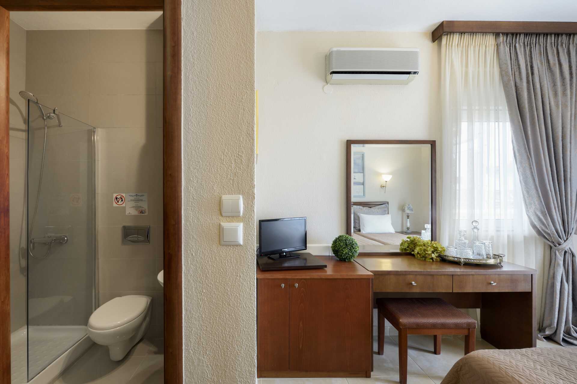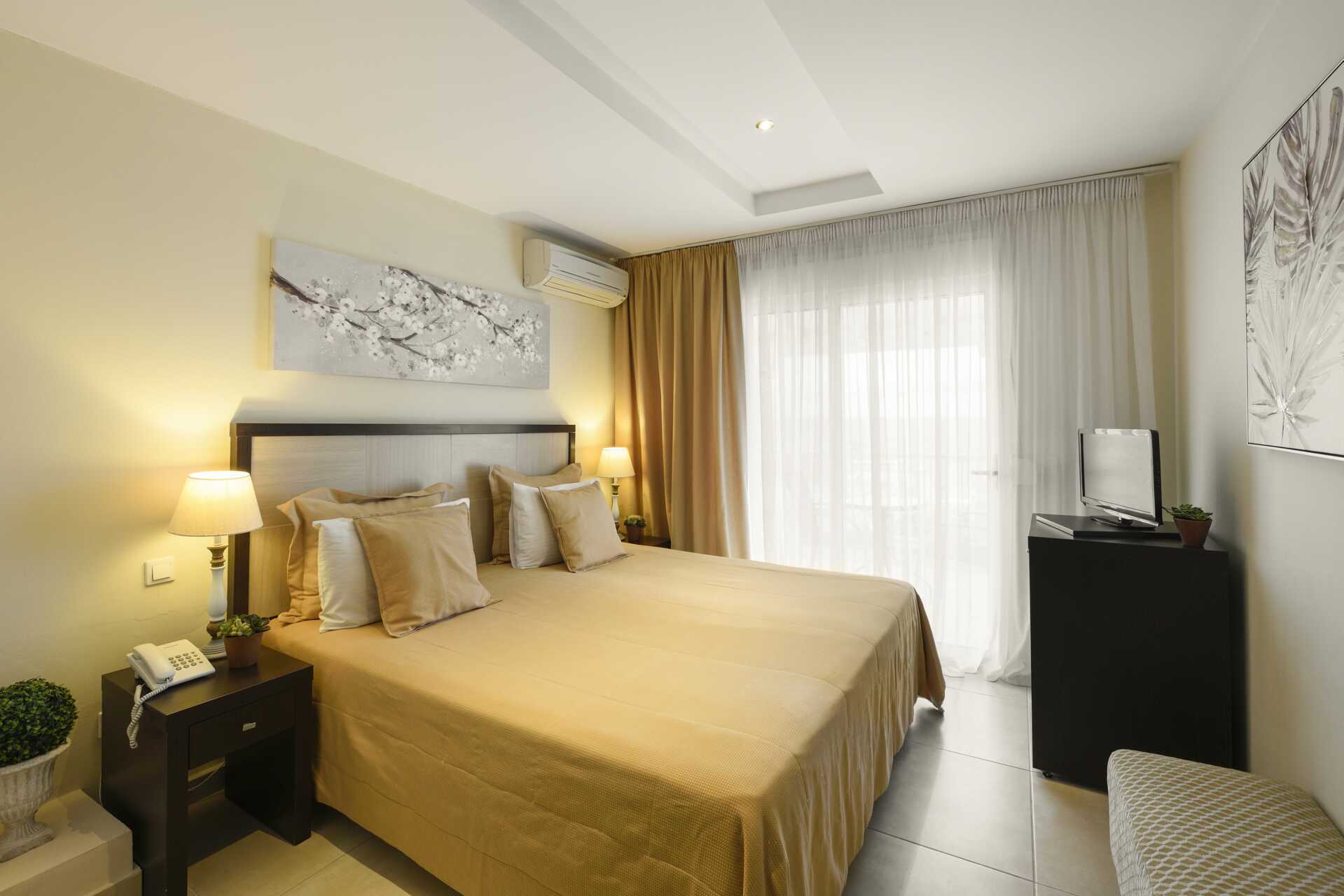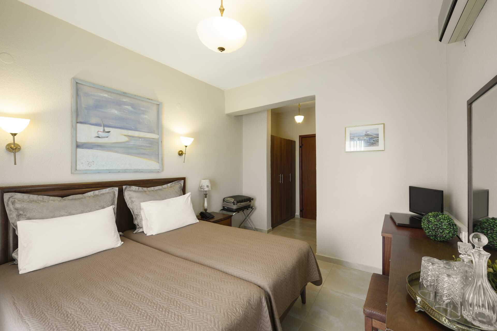 Kahden hengen huone parvekkeella. Parivuode tai kaksi yhden hengen sänkyä. Maksuton wifi, ilmastointi ja tallelokero. Minibaari (tyhjä). Tv kansainvälisillä kanavilla. Espresso-kahvinkeitin - kapselit mukana ja täytetään uudelleen viikon aikana. Silitysrauta ja -lauta. Hiustenkuivain. Kylpyhuoneessa suihku ja wc. Siivous 6 krt/viikko.