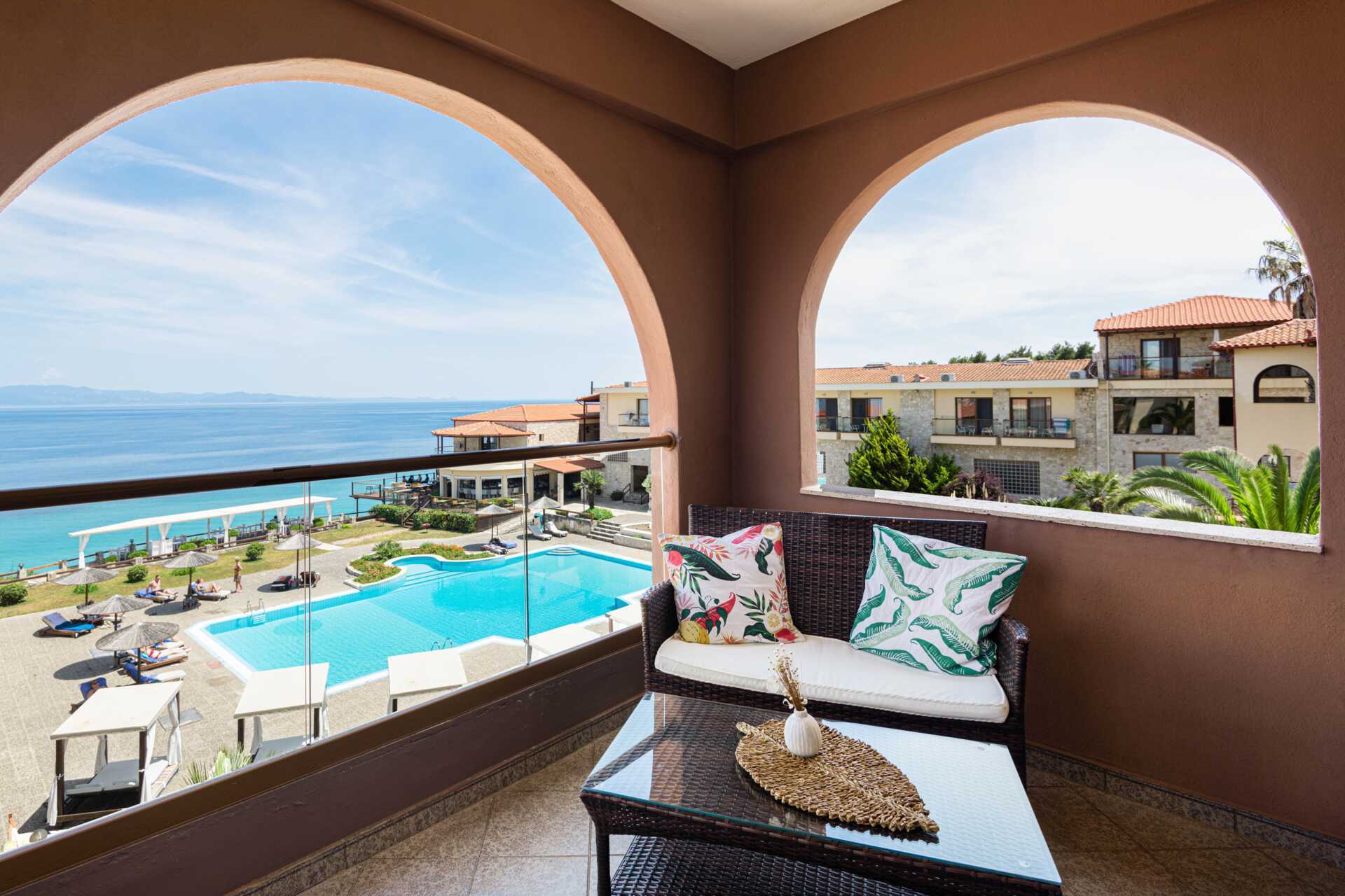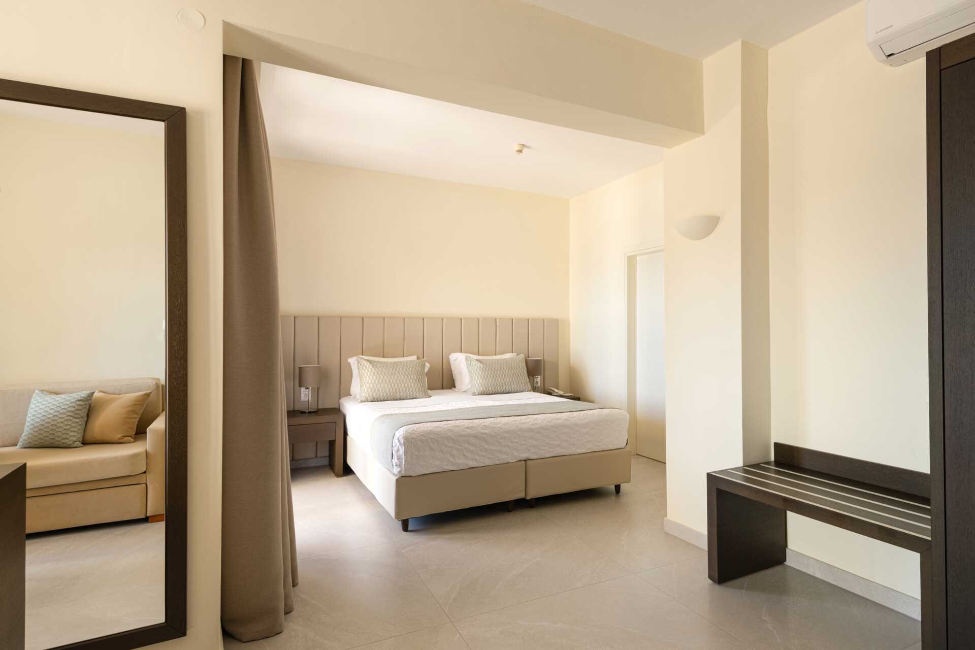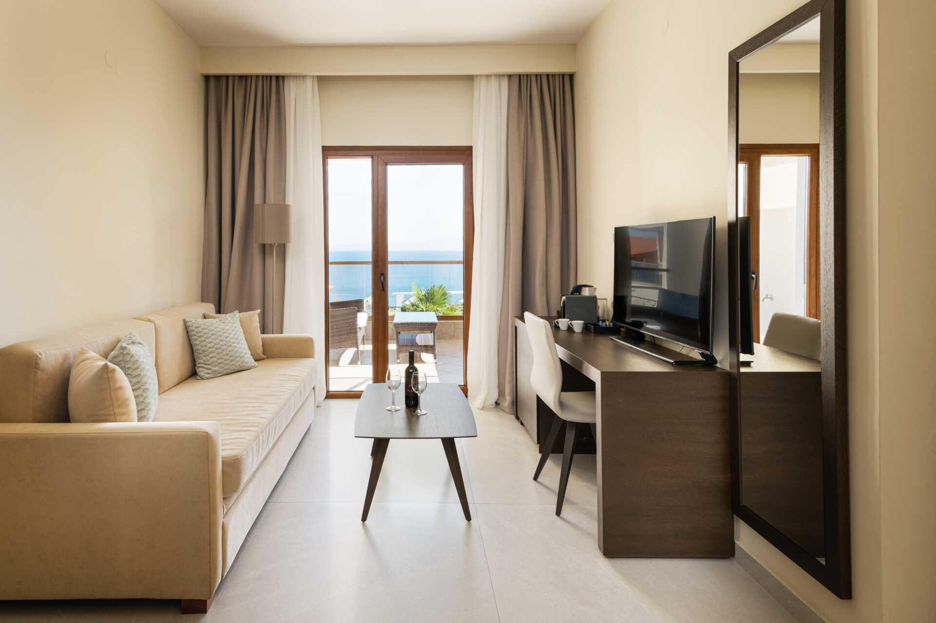 Juniorsviitti parvekkeella ja merinäköalalla. Juniorsviitti koostuu makuuhuoneesta, jossa on oleskelutila. Parivuode. Lisävuodemahdollisuus vuodesohvasta. Maksuton wifi, ilmastointi ja tallelokero. Jääkaappi. Vedenkeitin, kahvia ja teetä. Tv kansainvälisillä kanavilla. Kylpytakit ja tossut. Hiustenkuivain. Kylpyhuoneessa suihku tai kylpyamme ja wc. Siivous 7 krt/viikko.