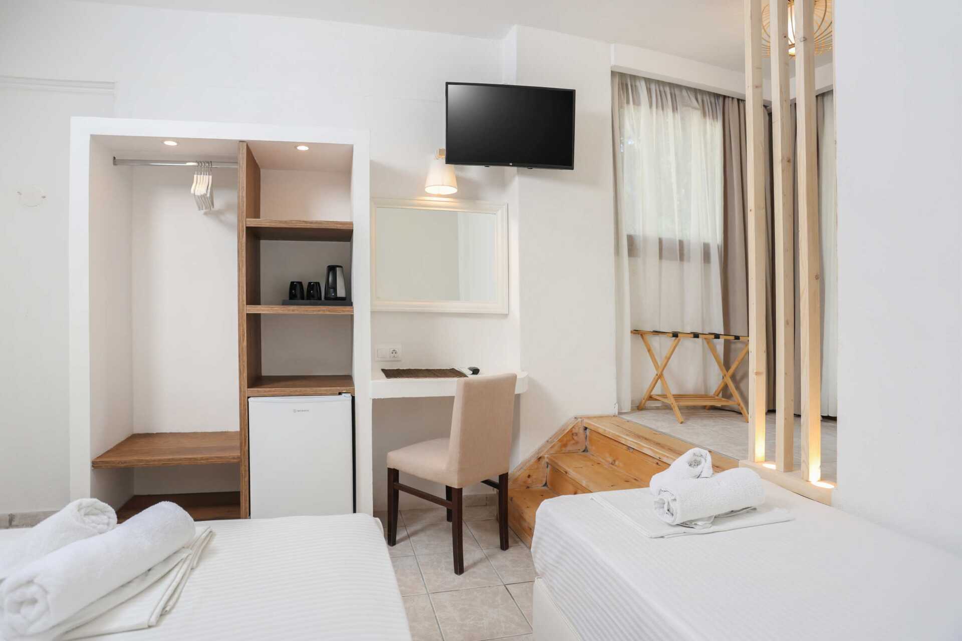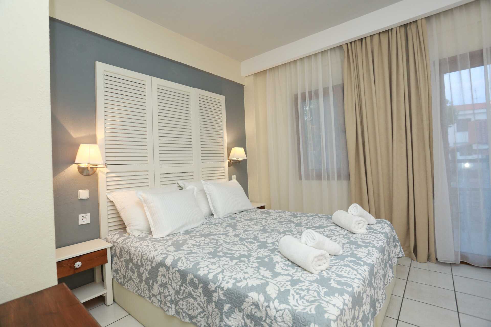Kahden hengen huone parvekkeella. Parivuode tai kaksi yhden hengen vuodetta. Maksuton wifi, ilmastointi ja tallelokero. Jääkaappi. Tv paikallisilla kanavilla. Hiustenkuivain. Suihku ja wc. Siivous 6 krt/viikko.