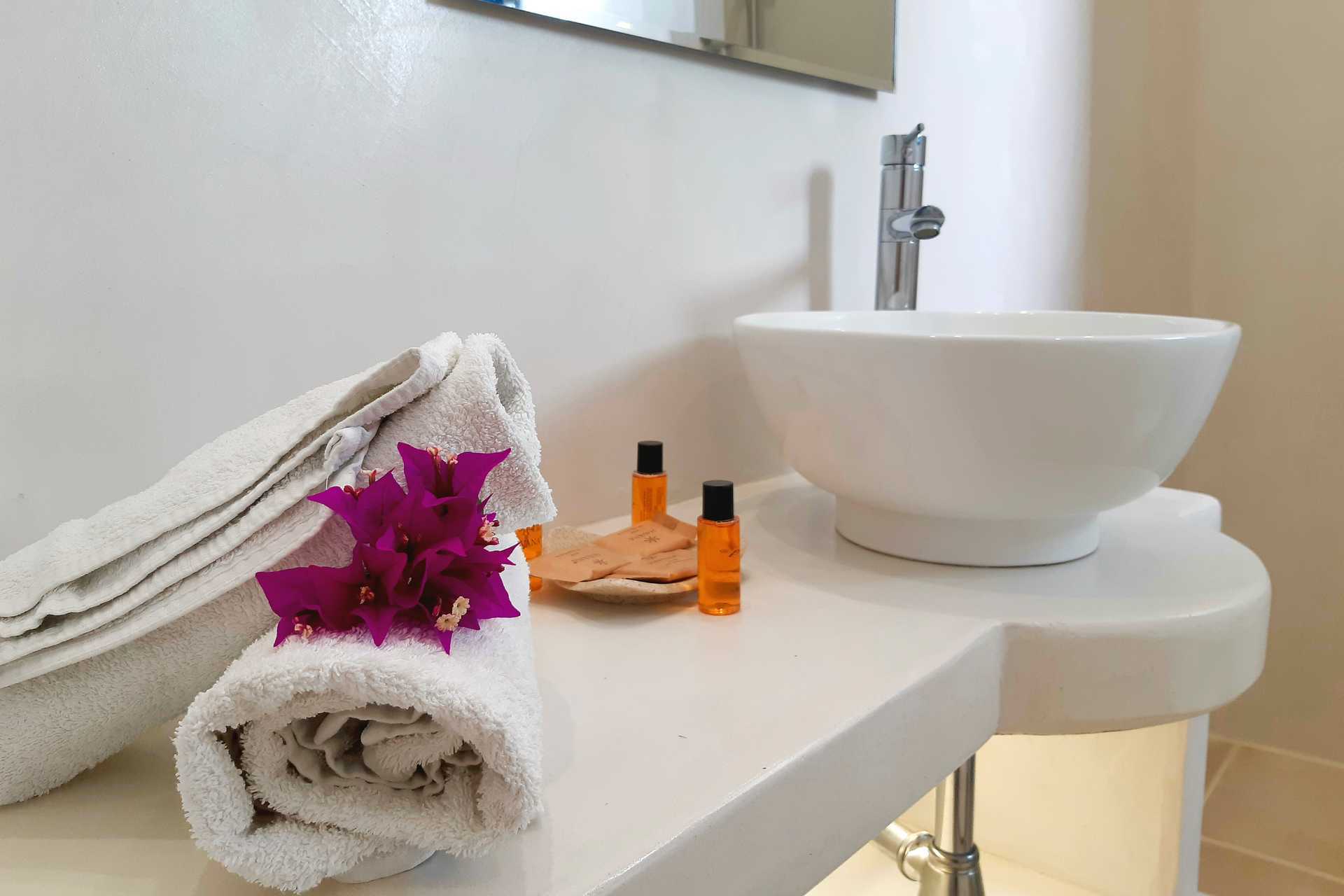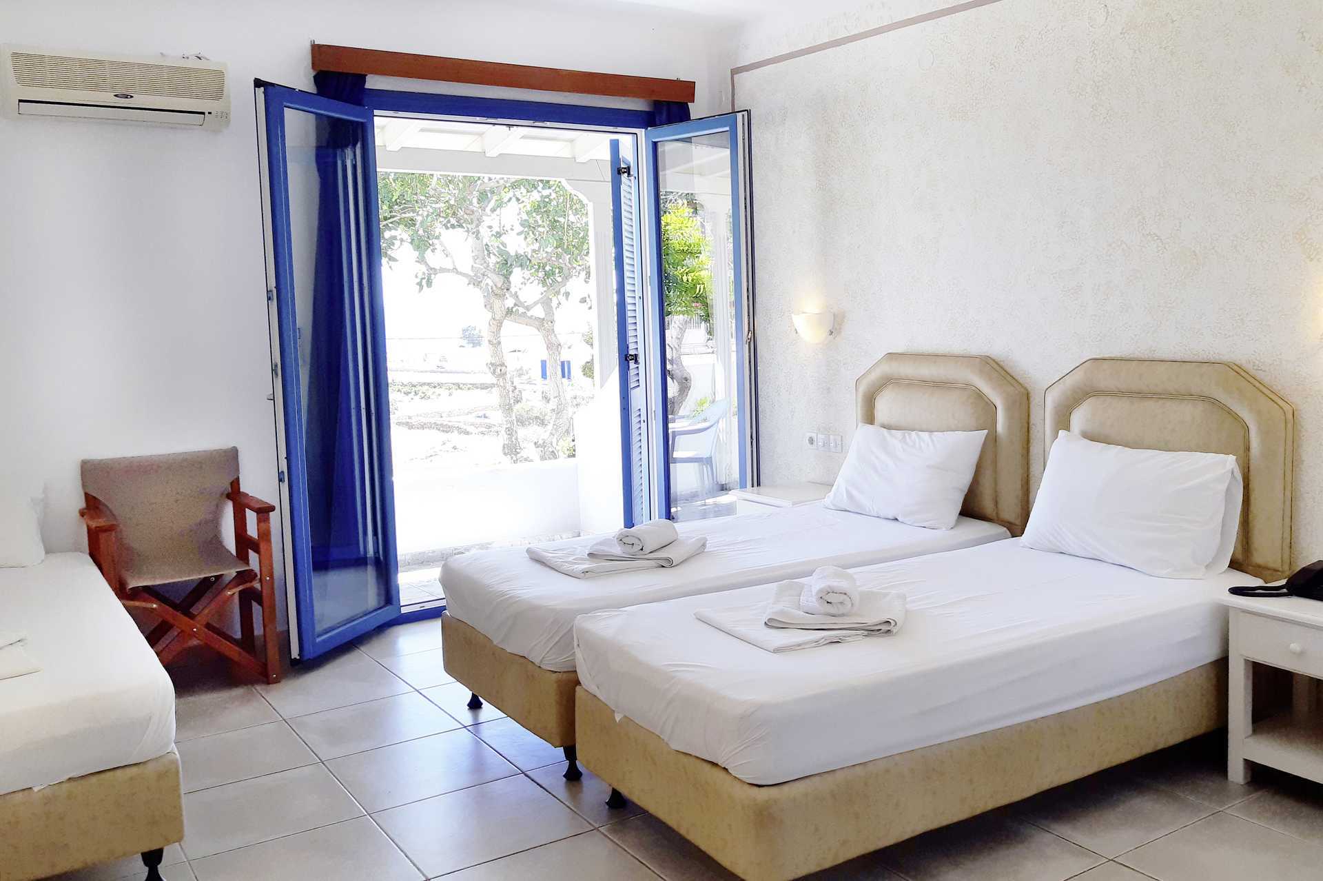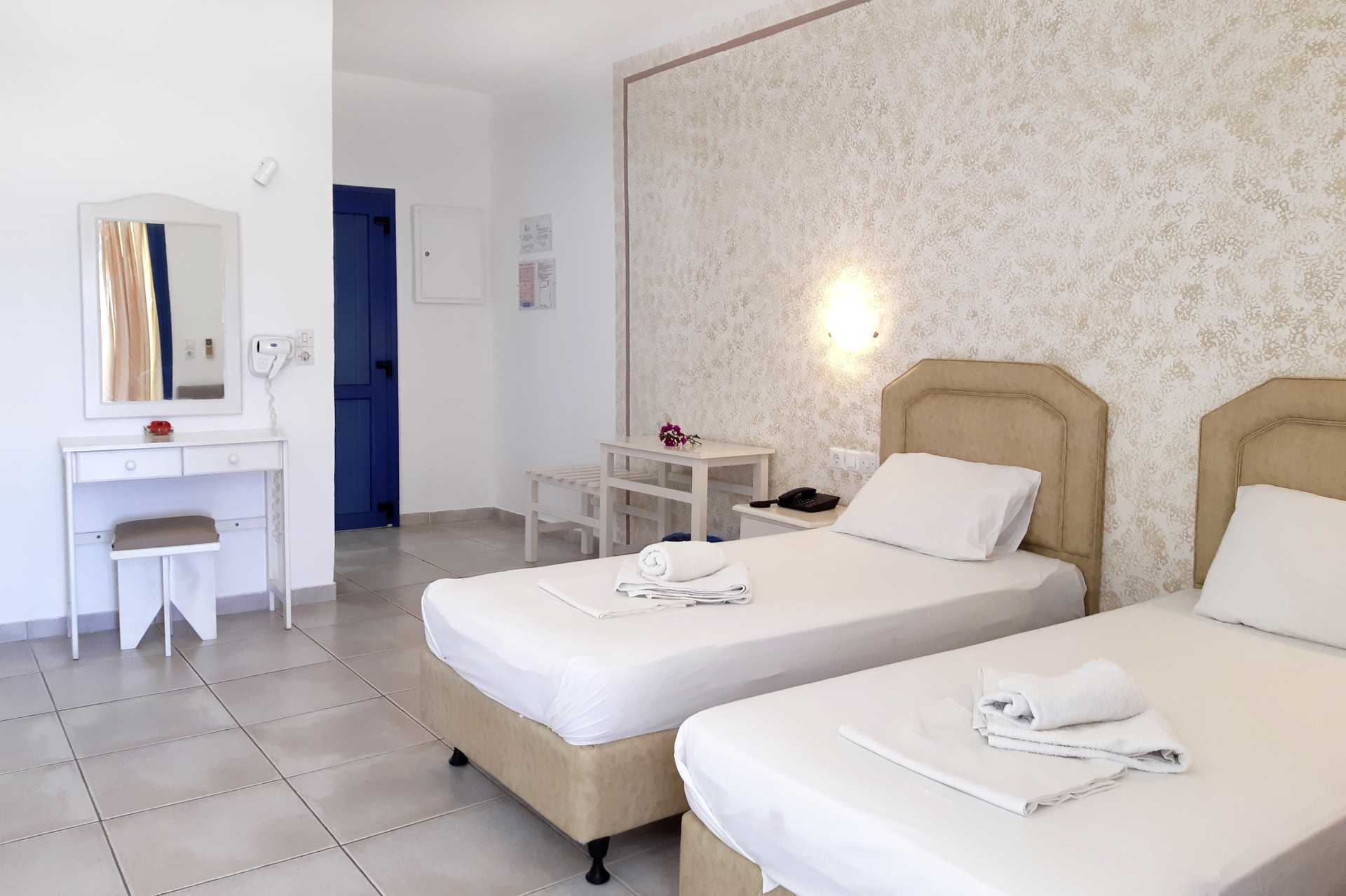 Kahden hengen huoneita, joissa vaaleat värit ja tv paikallisilla kanavilla. Jääkaappi. Maksuton wifi, ilmastointi ja tallelokero. Amme/suihku ja wc. Osa kahden hengen huoneista on remontoitu 2018. Hiustenkuivain. Parveke. Siivous 7 krt/viikko.