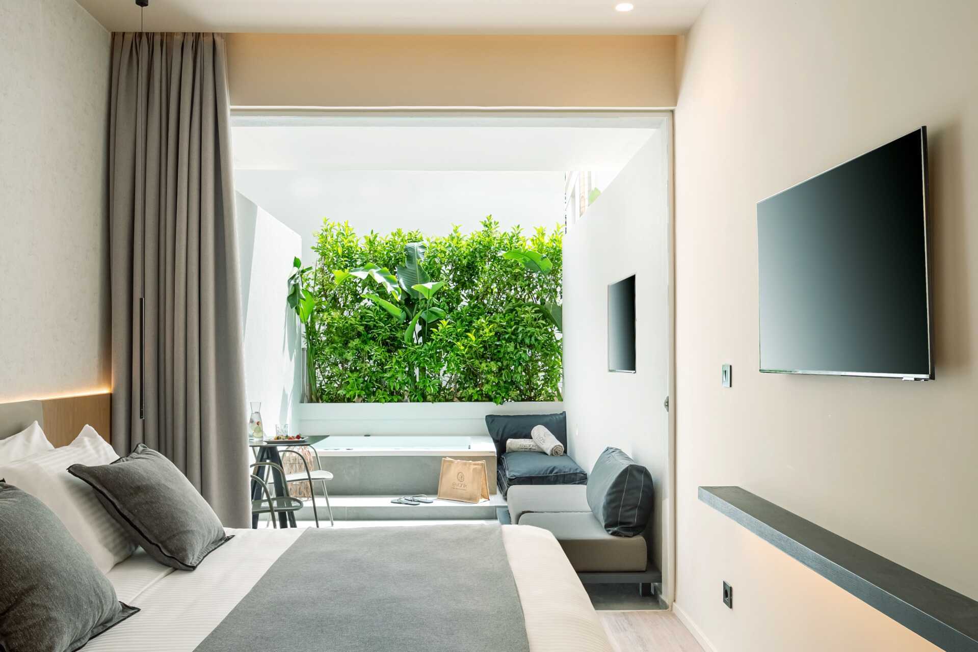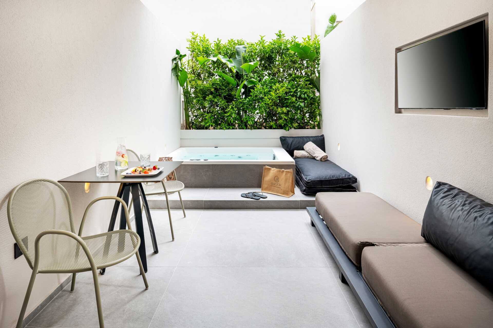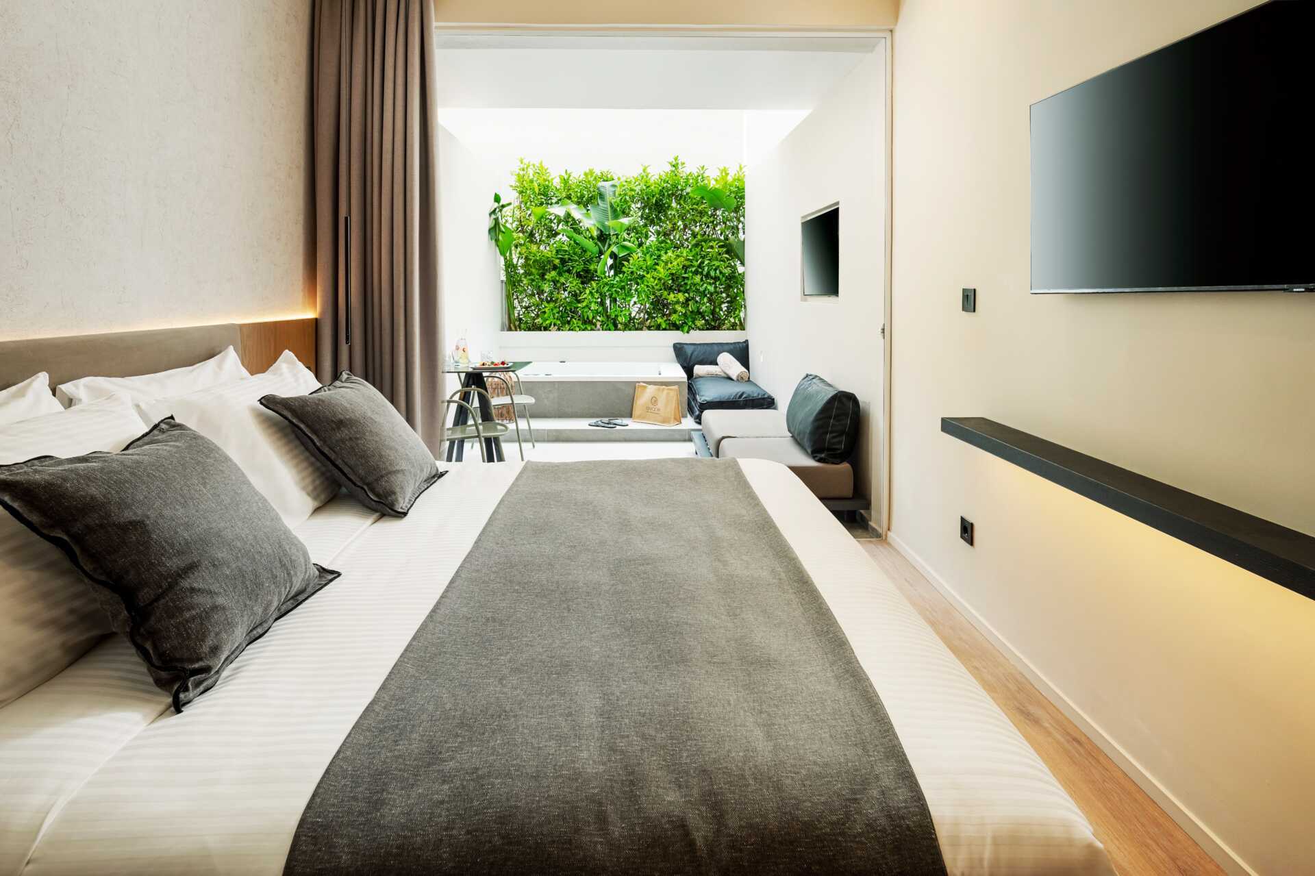 Kahden hengen huone, jossa on maaterassi. Terassilla on poreallas, aurinkotuolit sekä tuoleja ja pöytiä. Kaksi askelmaa terassilta porealtaalle. Parivuode. Maksuton wifi, ilmastointi ja tallelokero. Jääkaappi. Tv kansainvälisillä kanavilla. Jääkaappi. Vedenkeitin, kahvia ja teetä. Illy kahvinkeitin. Kylpytakit ja tossut. Hiustenkuivain. Kylpyhuone, jossa erillinen suihku ja erillinen wc. Siivous 7 krt/viikko. Alle 2-vuotiaat lapset lasketaan lisävuoteella majoittuviksi henkilöiksi.