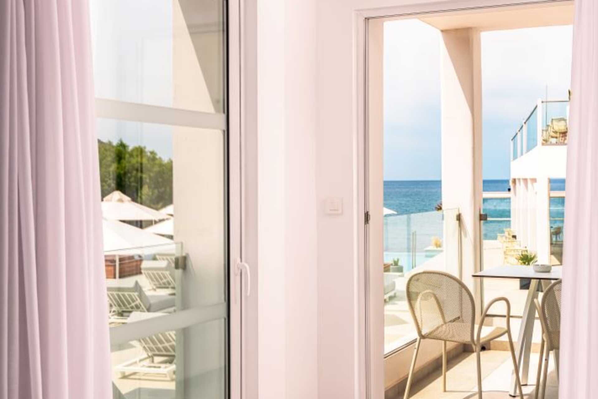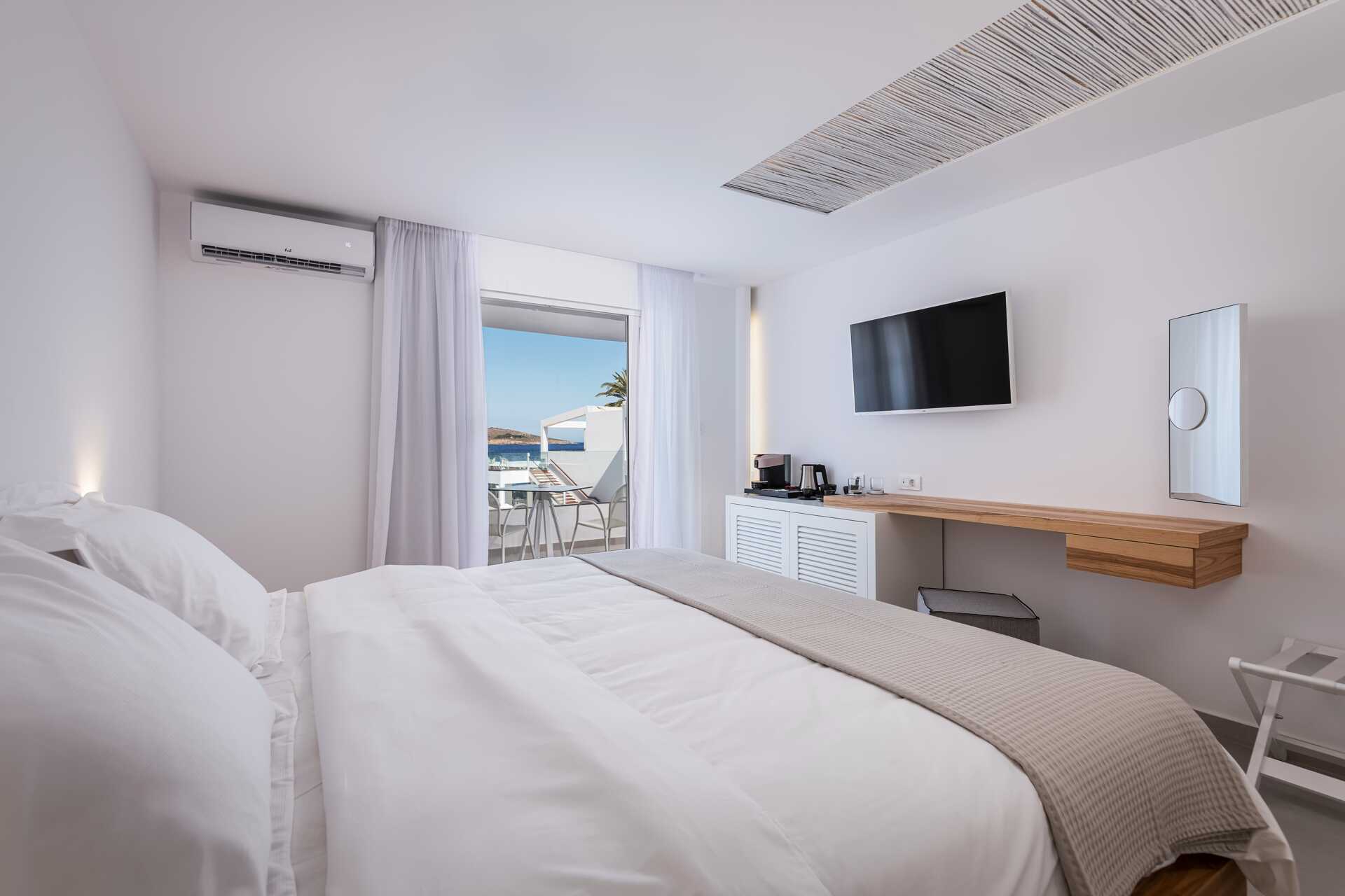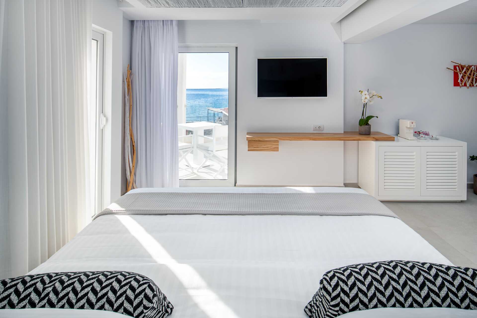 Superior-huone parvekkella tai terassilla ja merinäköalalla. Parivuode. Lisävuodemahdollisuus vuodesohvasta. Maksuton wifi, ilmastointi ja tallelokero. Jääkaappi. Vedenkeitin, kahvia ja teetä. Espressokone. Tv kansainvälisillä kanavilla. Kylpytakit ja tossut. Rantakassi allas- ja rantapyyhkeillä sekä rantatossut. Hiustenkuivain. Suihku ja wc. Siivous 7 krt/viikko. Alle 2-vuotiaat lapset katsotaan majoittuviksi lisävuoteessa.