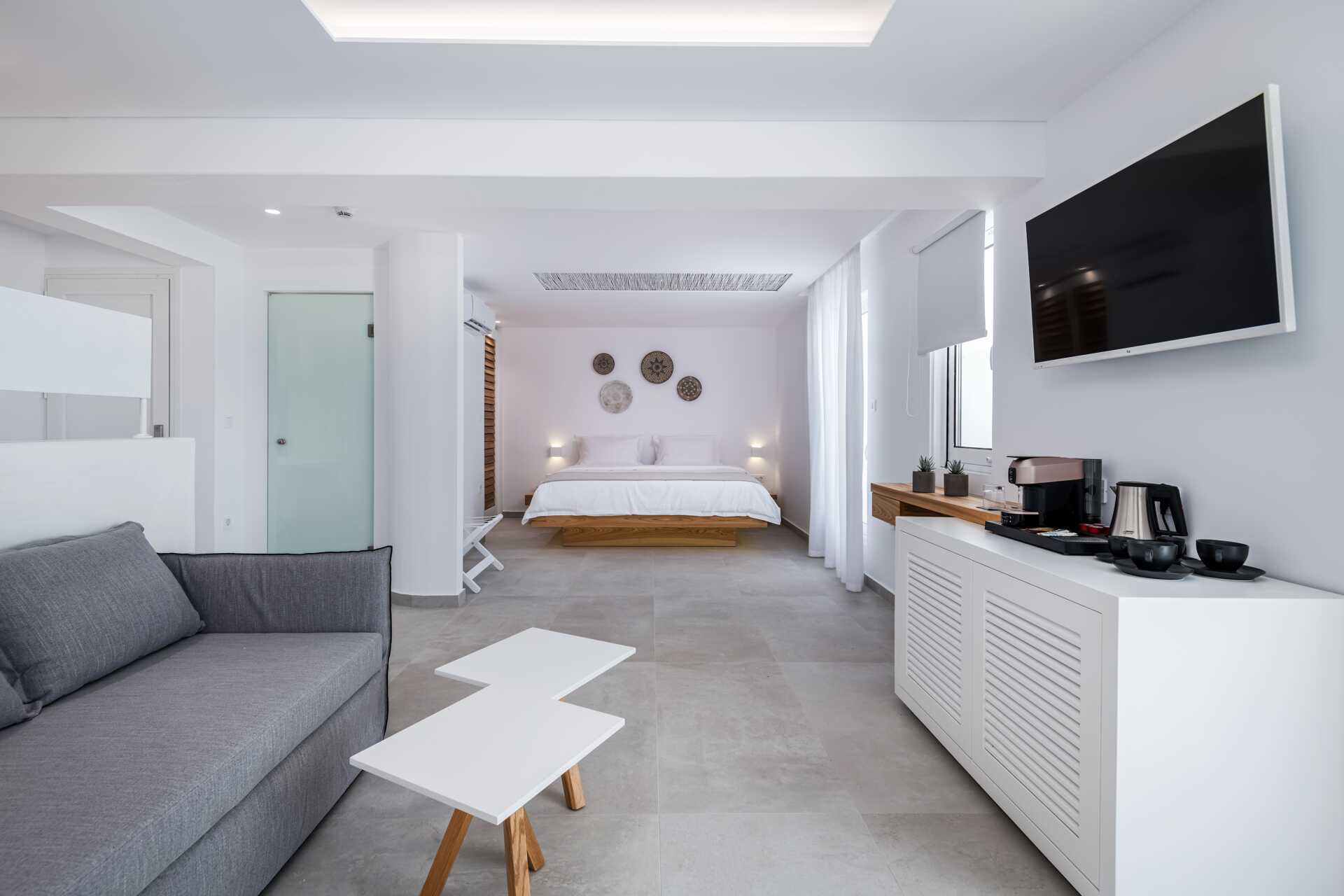 Juniorsviittejä parvekkeella tai terassilla, osasta merinäköala. Parisänky. Lisävuodemahdollisuus vuodesohvasta. Maksuton wifi, ilmastointi ja tallelokero. Jääkaappi. Espressokone. Vedenkeitin, kahvia ja teetä. Tv kansainvälisillä kanavilla. Kylpytakki ja tossut. Rantakassi allas- ja rantapyyhkeillä sekä rantatossut. Hiustenkuivain. Siivous 7 krt/viikko. Suihku ja wc. Alle 2-vuotiaat lapset katsotaan majoittuvaksi lisävuoteessa.