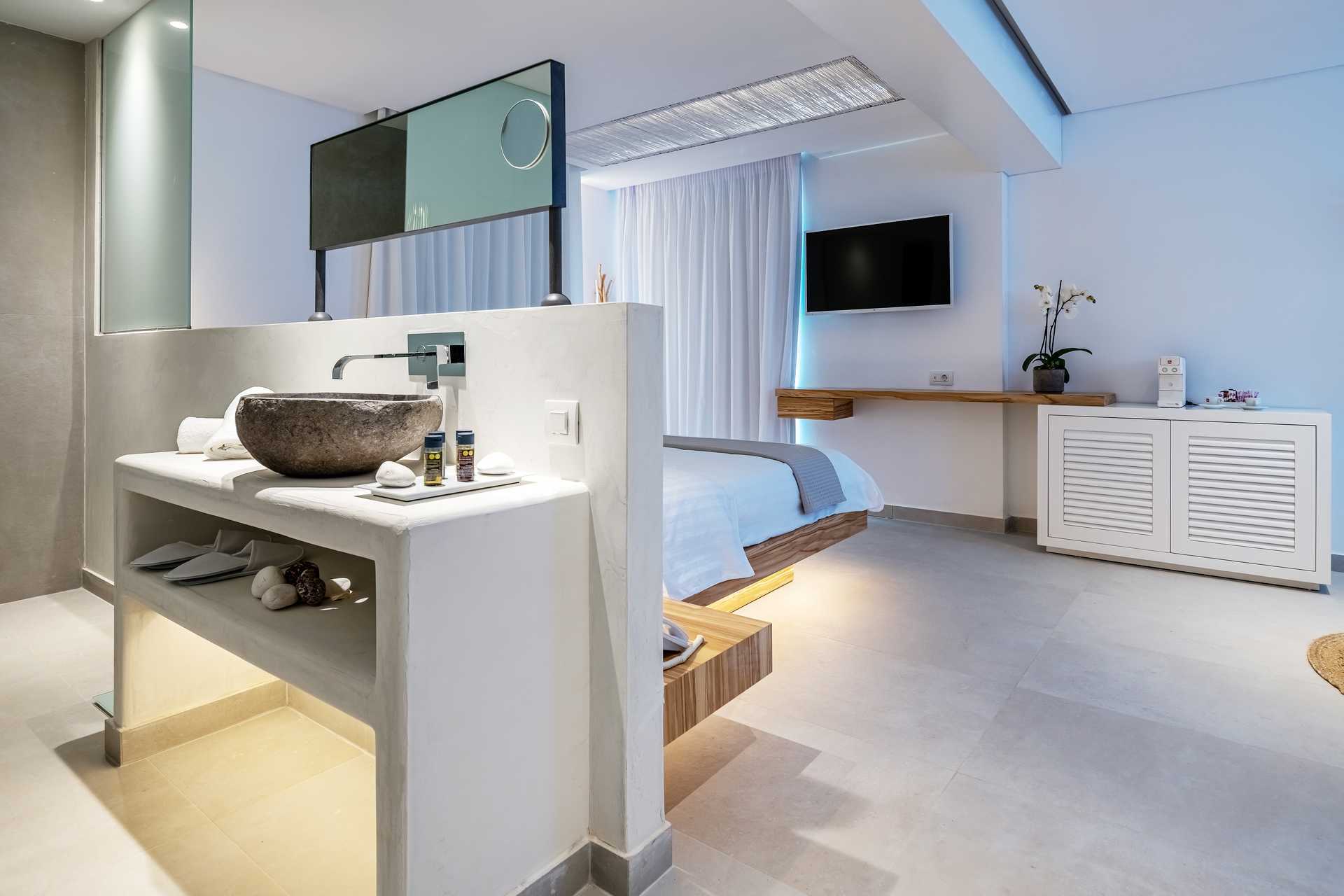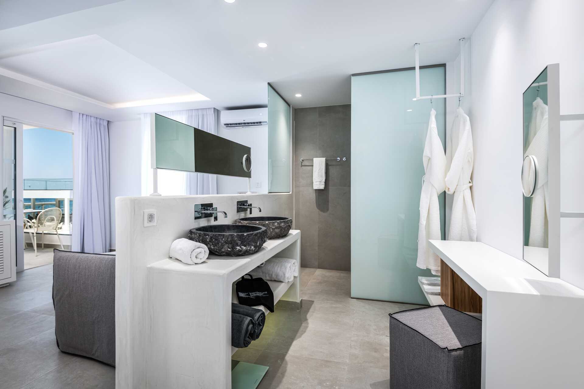 Sviitti parvekkeella tai terassilla ja merinäköalalla. Ulkotilassa on poreallas. Parivuode. Lisävuodemahdollisuus vuodesohvasta. Maksutoin wifi, ilmastointi ja tallelokero. Jääkaappi. Vedenkeitin, kahvia ja teetä. Espressokeitin. Tv kansainvälisillä kanavilla. Rantakassi, allas- ja rantapyyhkeillä sekä rantatossut. Kylpytakit ja tossut. Hiustenkuivaaja. Suihku ja wc. Siivous 7 krt/viikko. Ikäraja tässä huonetyypissä on 12-vuotta.