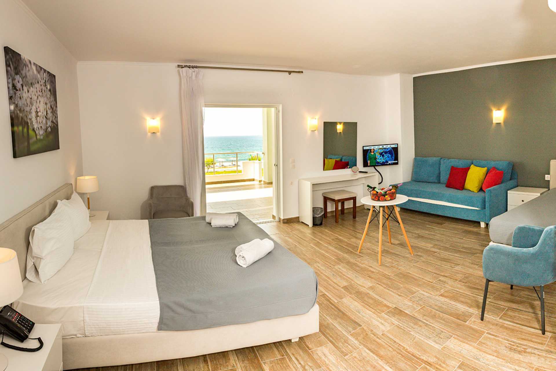 Blue Sea sijaitsee aivan Monolitho-rannan tuntumassa, Kanalin kylän eteläpuolella. Kilometrien pituinen ranta sopii täydellisesti aamukävelyille ja juoksulenkeille. Täällä majoitut mukavissa kahden hengen huoneissa, ja hotellissa on myös allasalue. Aamiaispöytä sisältyy hintaan, ja päivän aikana voit nauttia herkullista ruokaa hotellin ravintolassa.