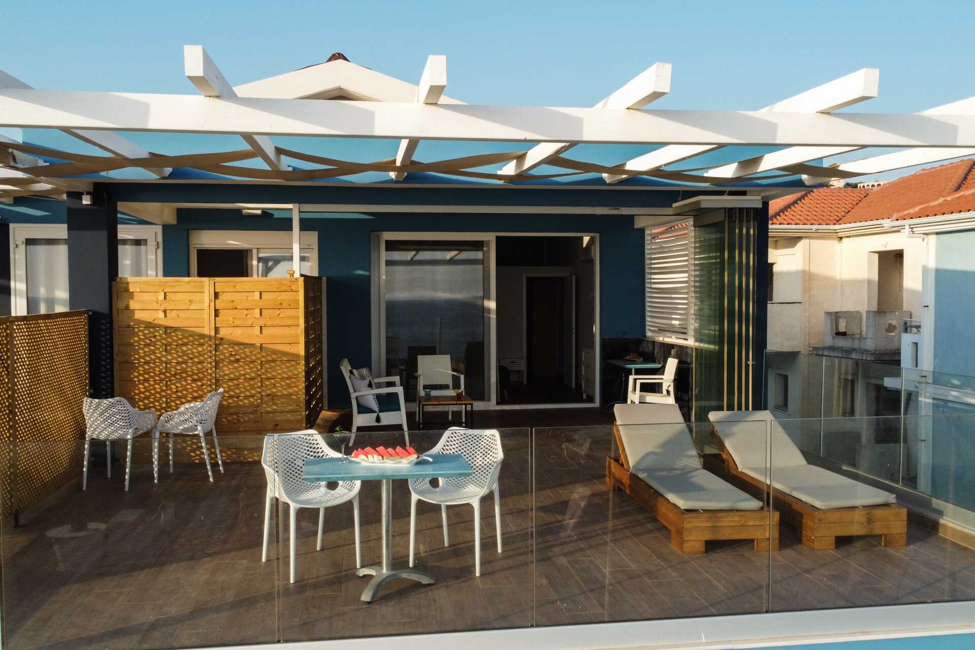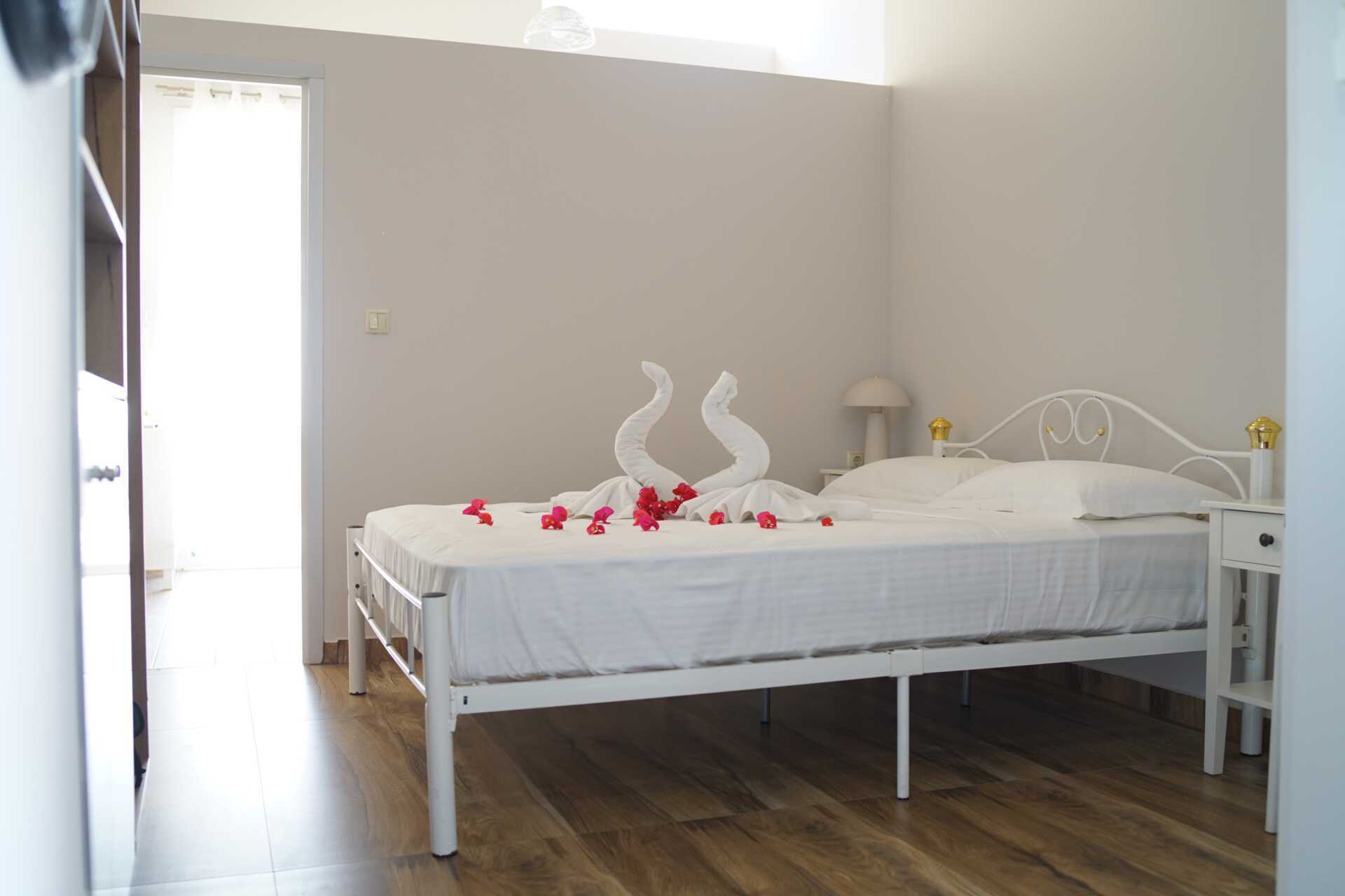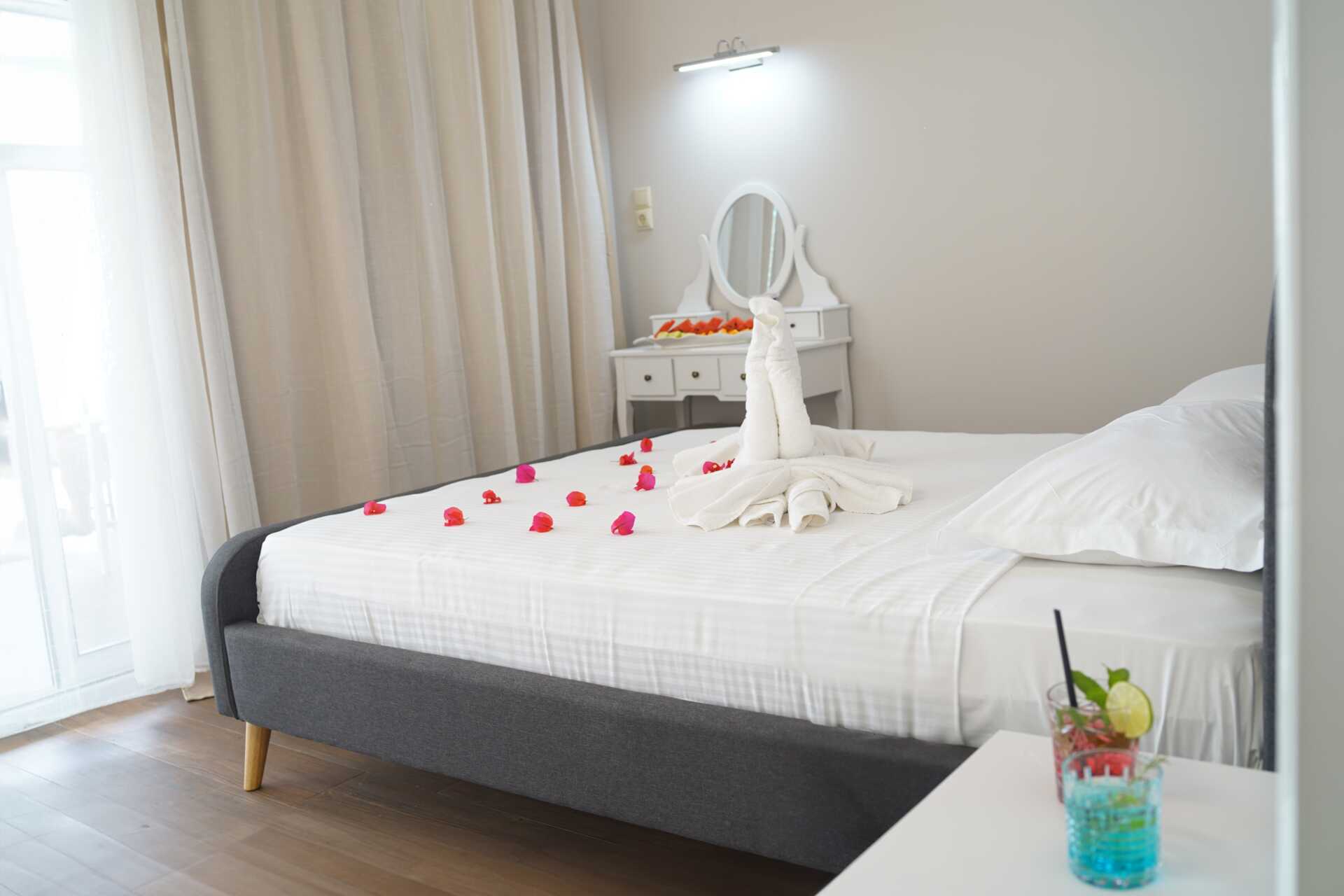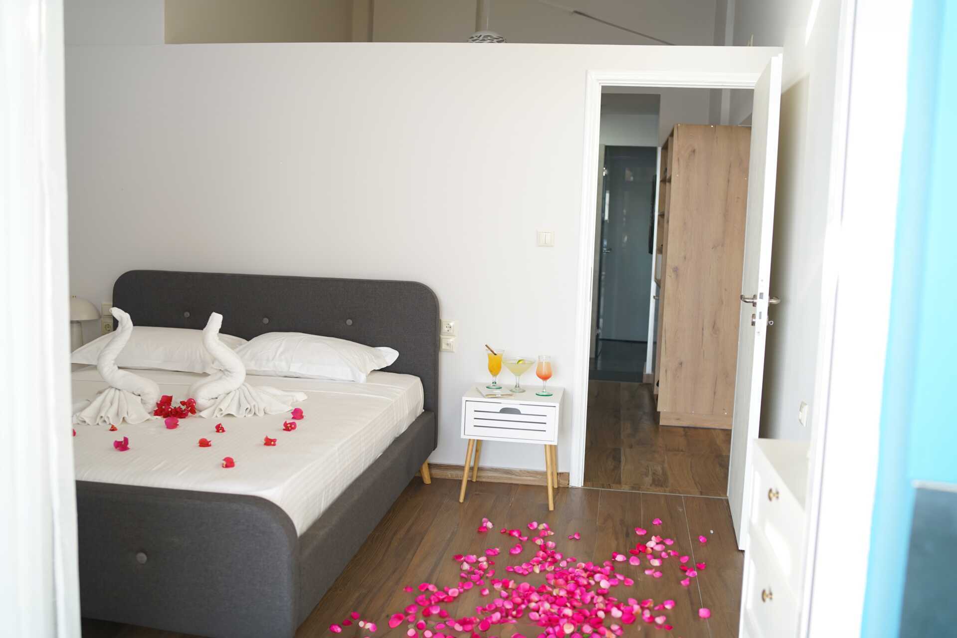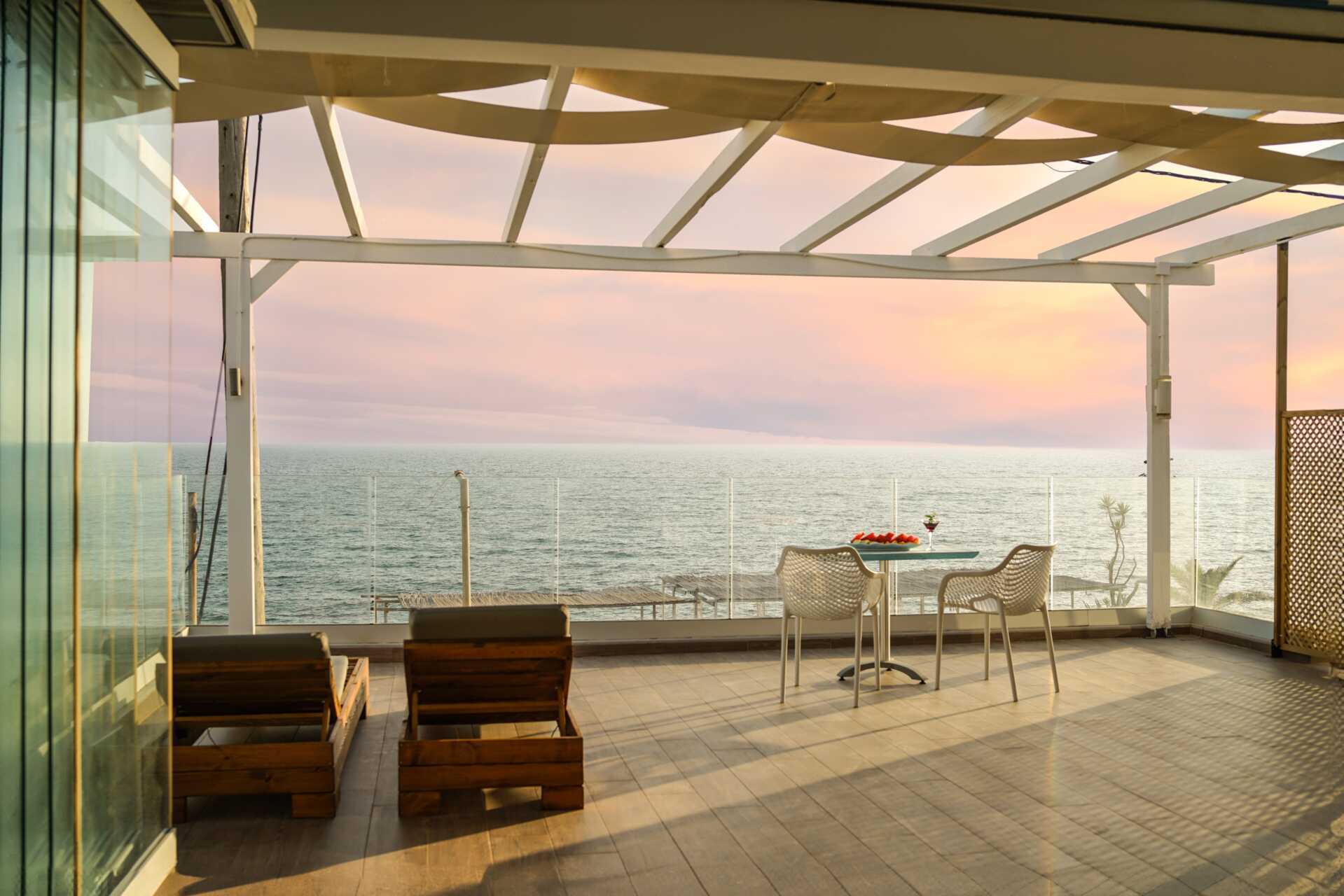Kahden huoneen sviitti parvekkeella ja merinäköalalla. Sviitissä on kaksi huonetta, joiden välissä on ovi, mutta seinä ei kuitenkaan nouse kattoon ja toisessa huoneessa ei ole kattoa. Parivuode tai kaksi yhden hengen sänkyä. Lisävuodemahdollisuus vuodesohvasta. Maksuton wifi, ilmastointi ja tallelokero. Minibaari. Vedenkeitin, kahvia ja teetä. Tv kansainvälisillä kanavilla. Kylpytakit ja tossut. Hiustenkuivain. Suihku ja wc. Siivous 7 krt/viikko.