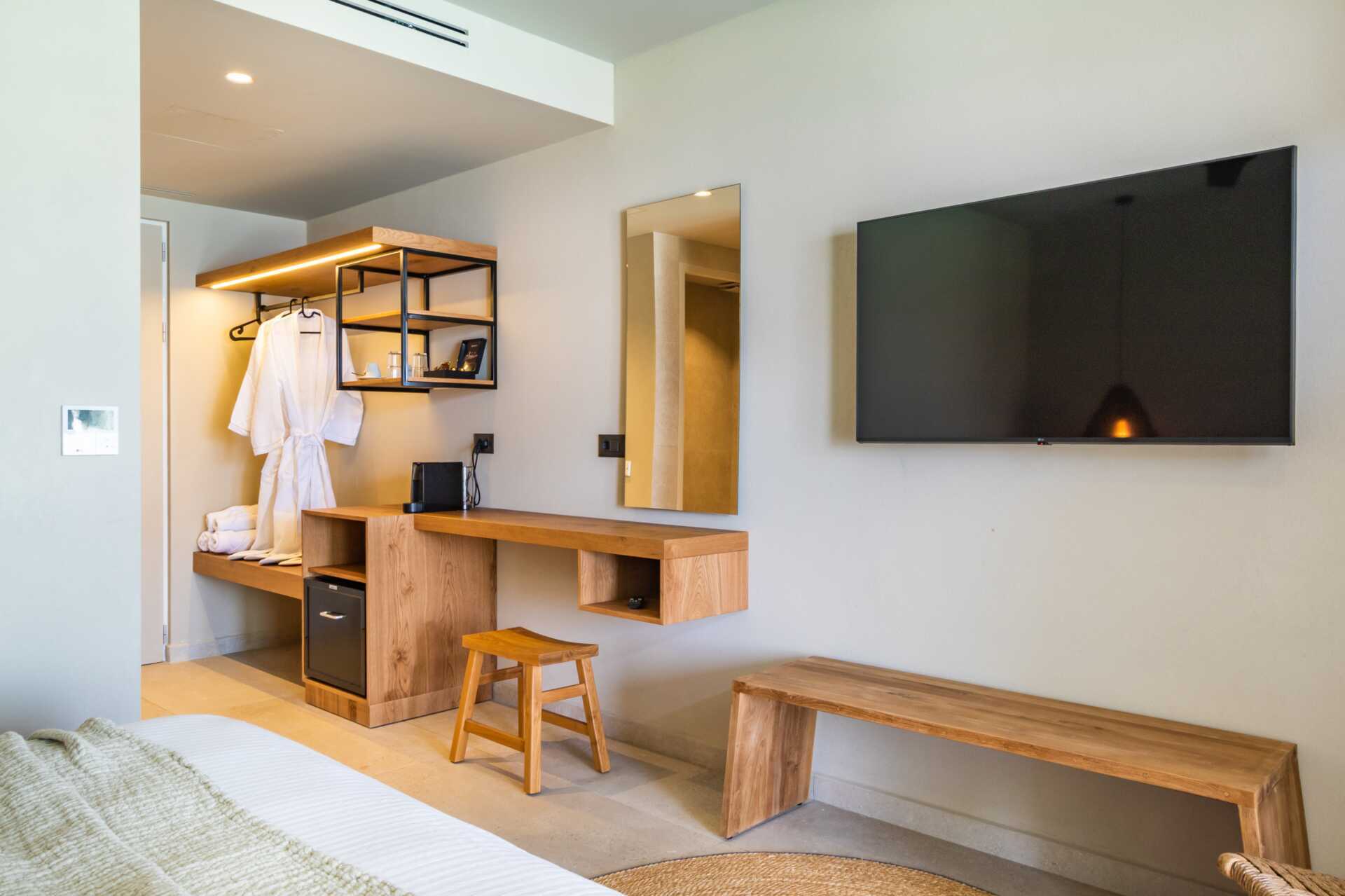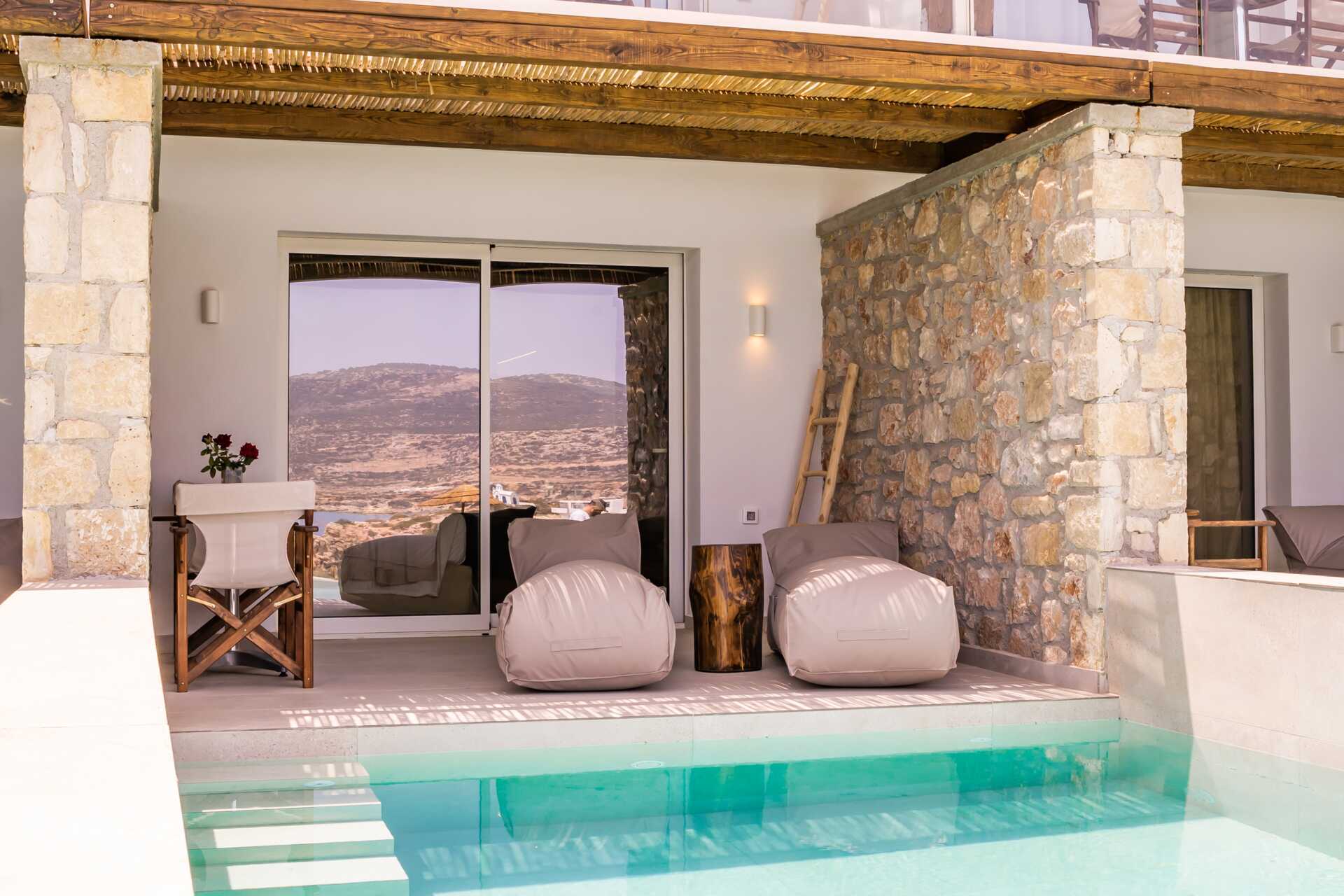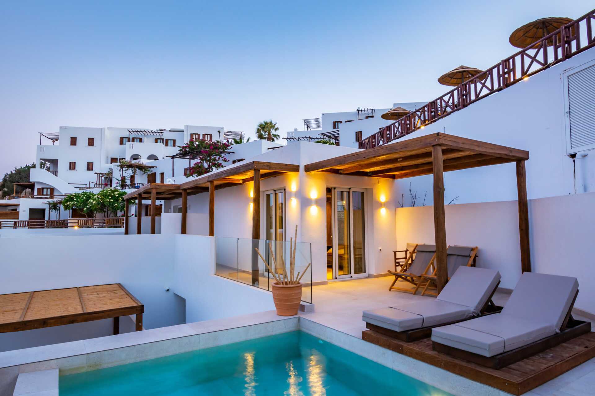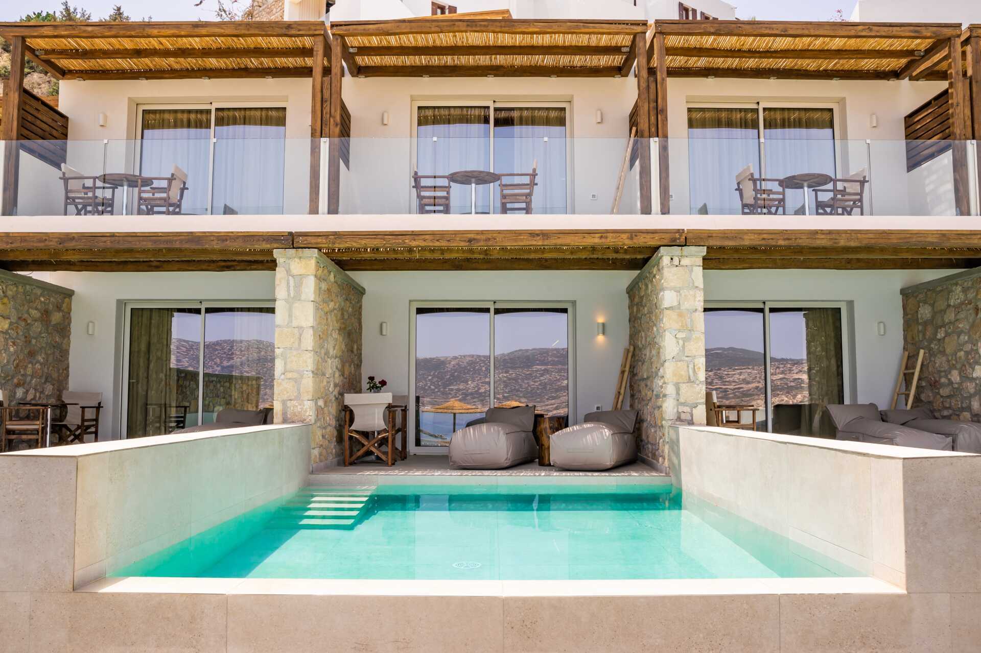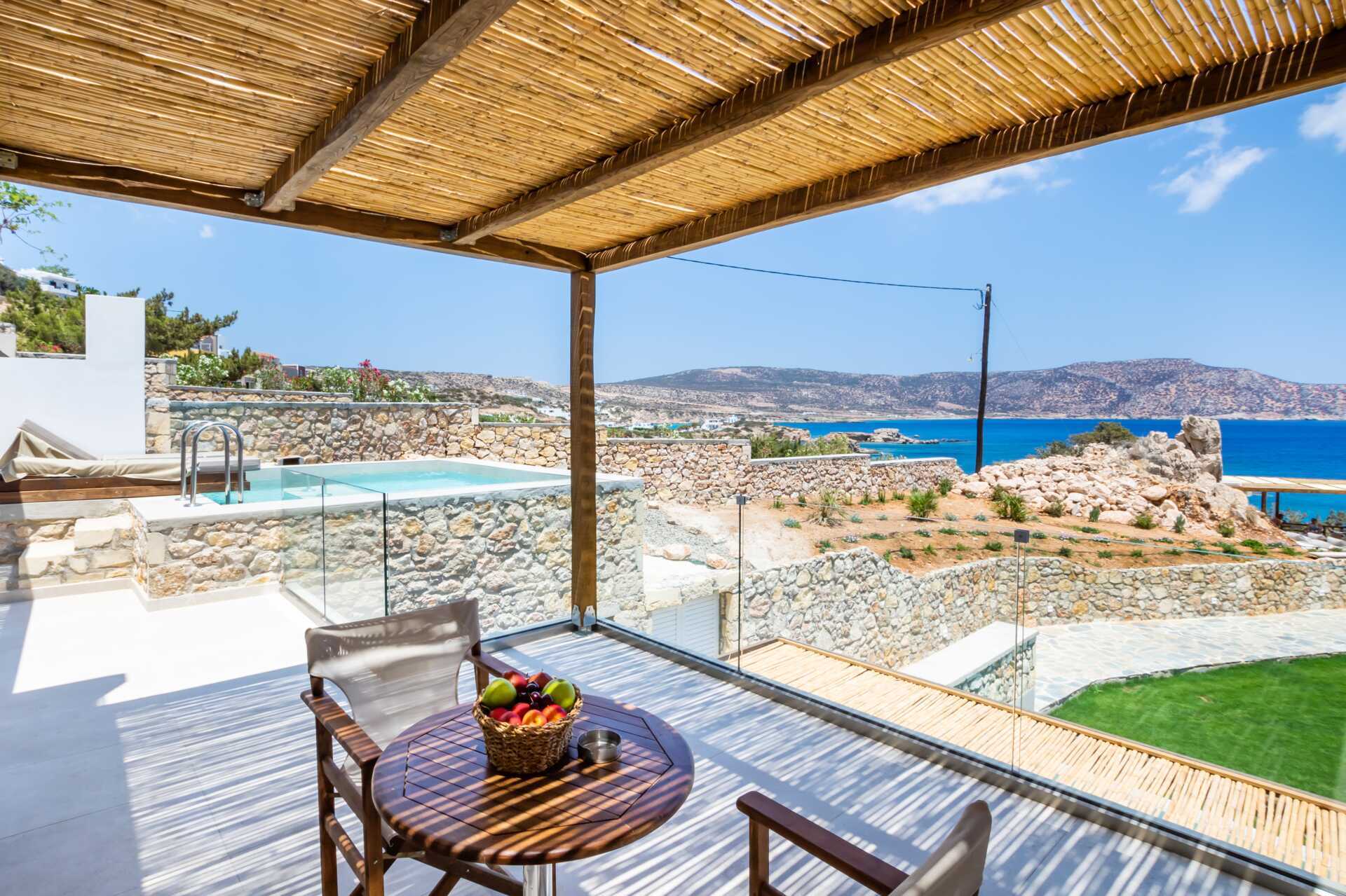 Deluxe-sviitti, jossa on oma uima-allas ja merinäköala maaterassilta. Parivuode. Maksuton wifi, tallelokero ja ilmastointi. Minibaari. Vedenkeitin, kahvia ja teetä. Kahvinkeitin, neljä kahvikapselia mukana, lisää voi ostaa halutessaan hotellin baarista. Tv kansainvälisillä kanavilla. Hiustenkuivain. Kylpyhuoneessa amme/suihku ja wc. Siivous 6 krt/viikko.