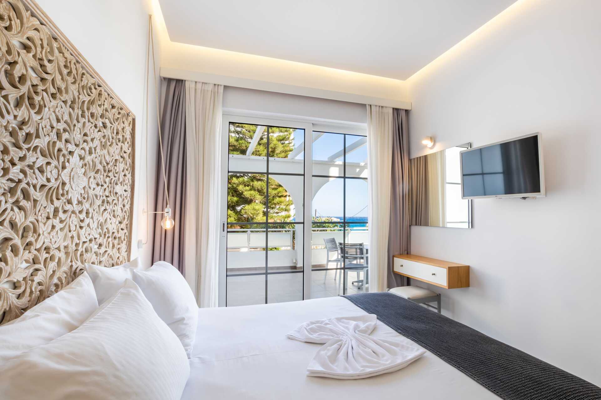 Deluxe-sviitti, jossa on iso parveke ja rajoitettu merinäköala. Makuuhuone sekä yhdistetty olohuone ja minikeittiö. Kaksi yhden hengen sänkyä. Lisävuodemahdollisuus kahteen vuodesohvaan. Minikeittiö, jossa jääkaappi, keittolevyt, kahvikone - kaksi kapselia mukana, vedenkeitin, leivänpaahdin ja keittiön perusvarusteet. Maksuton wifi, ilmastointi ja tallelokero. Tv kansainvälisillä kanavilla. Bluetooth -kaiutin. Tossut. Hiustenkuivain. Kylpyhuoneessa suihku ja wc. Siivous 6 krt/viikko.