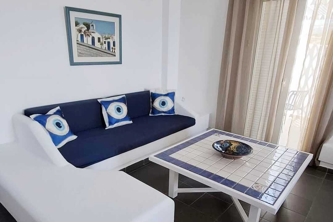 Yksiö, erikokoisilla parvekkeilla, joista osasta on rajoitettu merinäköala. Yhdistetty makuuhuone ja minikeittiö. Parivuode. Minikeittiössä keittolevyt, jääkaappi, vedenkeitin, kahvinkeitin ja yksinkertainen keittiövarustus ja pieni oleskelutila. Maksuton wifi, ilmastointi ja tallelokero. Tv paikallisilla kanavilla. Hiustenkuivain. Kylpyhuoneessa suihku ja wc. Siivous 6 krt/viikko.